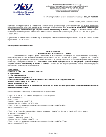 ZESPÓŁ OPIEKI ZDROWOTNEJ w Busku Zdroju ul. Bohaterów Warszawy 67, 28 – 100 Busko Zdrój, woj. Świętokrzyskie tel. centr. (041)-378-24-01, tel./fax (041) 378-24-01 wew. 244 REGON 000311467 NIP 655 – 16 – 62 – 705 Nr rej. PZOZ20 Strona internetowa;www.zoz.busko.com.pl e-mail: [email protected] Nr referencyjny nadany sprawie przez Zamawiającego: ZOZ/ZP-P/30/12 Busko – Zdrój, dnia 17 lipca 2012 r. Dotyczy: Postępowania o udzielenie zamówienia publicznego prowadzonego w trybie przetargu nieograniczonego powyŜej 14.000 Euro, którego przedmiotem jest „Dost aw a produktów spoŜywczych do Magazynu śywnościowego Zespołu Opieki Zdrowotnej w Busku - Zdroju” , z zachowaniem zasad określonych ustawą z dnia 29 stycznia 2004 r. Prawo zamówień publicznych (Dz. U. z 2004 r. Nr 19, poz. 177 z późń. zm.). Ogłoszenie o zamówieniu ukazało się w Biuletynie Zamówień Publicznych w dniu 28.06.2012 roku, numer ogłoszenia 224518 – 2012. Do wszystkich Wykonawców: ZAWIADOMIENIE O WYBORZE NAJKORZYSTNIEJSZEJ OFERTY Zamawiający – Zespół Opieki Zdrowotnej w Busku Zdroju – działając na podstawie art. 92 ustawy z dnia 29 stycznia 2004 r. Prawo zamówień publicznych (Dz. U. z 2004 r. Nr 19, poz. 177 z późń. zm.), zwanej dalej ustawą, po dokonaniu oceny ofert złoŜonych w postępowaniu o zamówienie publiczne w trybie przetargu nieograniczonego na „Do st awę produktów spoŜywczych do Magazynu śywnościowego Zespołu Opieki Zdrowotnej w Busku - Zdroju” informuje, Ŝe najkorzystniejszą ofertę niepodlegającą odrzuceniu przedstawił Wykonawca: Załącznik nr 1 Oferta nr 5: P.W. „MAT” Marzena Tkaczuk Ul. Zgodna 4b, 27-200 Starachowice Kryteria: cena – waga 100 % Oferta przetargowa uzyskała w kryterium cena najwyŜszą liczbę punktów 100. Wartość brutto oferty – 101.040,51 zł Termin płatności 30 dni. Umowa zostanie zawarta w terminie nie krótszym niŜ 5 dni od dnia przesłania zawiadomienia o wyborze najkorzystniejszej oferty. Pozostałe oferty otrzymały następujące liczby punktów: Oferta nr 2: P.P.H. ,, POLARIS” Małgorzata Gruszczyńska Ul. śołnierska 20a, 62-800 Kalisz Kryteria: cena – waga 100 % Wartość brutto oferty – 107.935,65 zł Oferta przetargowa uzyskała w kryterium cena liczbę punktów 93,61. Termin płatności 30 dni. Oferta nr 4: Przedsiębiorstwo Handlowo-Usługowe „SAWA” A. Sikora, W. Wróbel Spółka Jawna Ul. Wojska Polskiego 35 b, 28-100 Busko-Zdrój Kryteria: cena – waga 100 % Wartość brutto oferty – 108.402,29 zł Oferta przetargowa uzyskała w kryterium cena liczbę punktów 00,00. Termin płatności 30 dni. Strona 1 z 4 ZESPÓŁ OPIEKI ZDROWOTNEJ w Busku Zdroju ul. Bohaterów Warszawy 67, 28 – 100 Busko Zdrój, woj. Świętokrzyskie tel. centr. (041)-378-24-01, tel./fax (041) 378-24-01 wew. 244 REGON 000311467 NIP 655 – 16 – 62 – 705 Nr rej. PZOZ20 Strona internetowa;www.zoz.busko.com.pl e-mail: [email protected] Nr referencyjny nadany sprawie przez Zamawiającego: ZOZ/ZP-P/30/12 Załącznik nr 1a Oferta nr 3: „ASCLEPIOS” Spółka Akcyjna Ul. Hubska 44 50-502 Wrocław Kryteria: cena – waga 100 % Oferta przetargowa uzyskała w kryterium cena najwyŜszą liczbę punktów 100. Wartość brutto oferty – 7 723,69 zł Termin płatności 30 dni. Umowa zostanie zawarta w terminie nie krótszym niŜ 5 dni od dnia przesłania zawiadomienia o wyborze najkorzystniejszej oferty. Załącznik nr 2 Oferta nr 5: P.W. „MAT” Marzena Tkaczuk Ul. Zgodna 4b, 27-200 Starachowice Kryteria: cena – waga 100 % Oferta przetargowa uzyskała w kryterium cena najwyŜszą liczbę punktów 84,65. Wartość brutto oferty – 17.955,00 zł Termin płatności 30 dni. Umowa zostanie zawarta w terminie nie krótszym niŜ 5 dni od dnia przesłania zawiadomienia o wyborze najkorzystniejszej oferty. Pozostałe oferty otrzymały następujące liczby punktów: Oferta nr 2: P.P.H. ,, POLARIS” Małgorzata Gruszczyńska Ul. śołnierska 20a, 62-800 Kalisz Kryteria: cena – waga 100 % Wartość brutto oferty – 22.344,00 zł Oferta przetargowa uzyskała w kryterium cena liczbę punktów 68,02. Termin płatności 30 dni. Oferta nr 1: Ferma Drobiu Mieczysław Rejdak Leszcze 35a, 28-400 Pińczów Kryteria: cena – waga 100 % Wartość brutto oferty – 15.200,00 zł Oferta przetargowa uzyskała w kryterium cena liczbę punktów 00,00. Termin płatności 30 dni. Oferta nr 4: Przedsiębiorstwo Handlowo-Usługowe „SAWA” A. Sikora, W. Wróbel Spółka Jawna Ul. Wojska Polskiego 35 b, 28-100 Busko-Zdrój Kryteria: cena – waga 100 % Wartość brutto oferty – 19.551,00 zł Oferta przetargowa uzyskała w kryterium cena liczbę punktów 00,00. Termin płatności 30 dni. Załącznik nr 3 Oferta nr 4: Przedsiębiorstwo Handlowo-Usługowe „SAWA” A. Sikora, W. Wróbel Spółka Jawna Ul. Wojska Polskiego 35 b, 28-100 Busko-Zdrój Kryteria: cena – waga 100 % Oferta przetargowa uzyskała w kryterium cena liczbę punktów 00,00. Wartość brutto oferty – 1.490,98 zł Termin płatności 30 dni. Strona 2 z 4 ZESPÓŁ OPIEKI ZDROWOTNEJ w Busku Zdroju ul. Bohaterów Warszawy 67, 28 – 100 Busko Zdrój, woj. Świętokrzyskie tel. centr. (041)-378-24-01, tel./fax (041) 378-24-01 wew. 244 REGON 000311467 NIP 655 – 16 – 62 – 705 Nr rej. PZOZ20 Strona internetowa;www.zoz.busko.com.pl e-mail: [email protected] Nr referencyjny nadany sprawie przez Zamawiającego: ZOZ/ZP-P/30/12 Zawiadomienie o wykluczeniu Wykonawcy – oferta nr 4 – Przedsiębiorstwo Handlowo-Usługowe „SAWA” A. Sikora, W. Wróbel Spółka Jawna Działając na podstawie art. 92 ust. 1 pkt. 3, zgodnie z art. 24 ust. 2 pkt 4 ustawy z dnia 29 stycznia 2004 roku Prawo zamówień publicznych (Dz. U. z 2004 r., Nr 19, poz. 177 z późń. zm., tekst jednolity: Dz. U. 2010 r., Nr 113, poz. 759), Zamawiający zawiadamia, Ŝe w postępowaniu o zamówienie publiczne w trybie przetargu nieograniczonego powyŜej 14.000 Euro w przedmiocie „Do st aw produktów s
