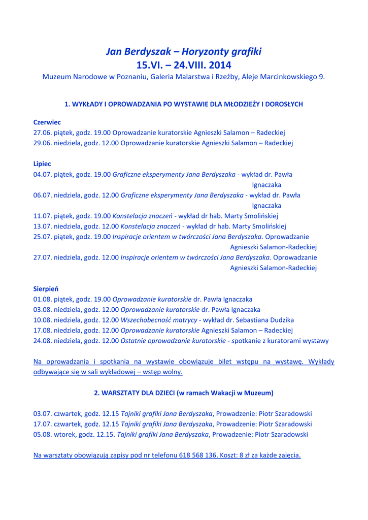 Jan Berdyszak – Horyzonty grafiki 15.VI. – 24.VIII. 2014 Muzeum Narodowe w Poznaniu, Galeria Malarstwa i Rzeźby, Aleje Marcinkowskiego 9. 1. WYKŁADY I OPROWADZANIA PO WYSTAWIE DLA MŁODZIEŻY I DOROSŁYCH Czerwiec 27.06. piątek, godz. 19.00 Oprowadzanie kuratorskie Agnieszki Salamon – Radeckiej 29.06. niedziela, godz. 12.00 Oprowadzanie kuratorskie Agnieszki Salamon – Radeckiej Lipiec 04.07. piątek, godz. 19.00 Graficzne eksperymenty Jana Berdyszaka - wykład dr. Pawła Ignaczaka 06.07. niedziela, godz. 12.00 Graficzne eksperymenty Jana Berdyszaka - wykład dr. Pawła Ignaczaka 11.07. piątek, godz. 19.00 Konstelacja znaczeń - wykład dr hab. Marty Smolińskiej 13.07. niedziela, godz. 12.00 Konstelacja znaczeń - wykład dr hab. Marty Smolińskiej 25.07. piątek, godz. 19.00 Inspiracje orientem w twórczości Jana Berdyszaka. Oprowadzanie Agnieszki Salamon-Radeckiej 27.07. niedziela, godz. 12.00 Inspiracje orientem w twórczości Jana Berdyszaka. Oprowadzanie Agnieszki Salamon-Radeckiej Sierpień 01.08. piątek, godz. 19.00 Oprowadzanie kuratorskie dr. Pawła Ignaczaka 03.08. niedziela, godz. 12.00 Oprowadzanie kuratorskie dr. Pawła Ignaczaka 10.08. niedziela, godz. 12.00 Wszechobecność matrycy - wykład dr. Sebastiana Dudzika 17.08. niedziela, godz. 12.00 Oprowadzanie kuratorskie Agnieszki Salamon – Radeckiej 24.08. niedziela, godz. 12.00 Ostatnie oprowadzanie kuratorskie - spotkanie z kuratorami wystawy Na oprowadzania i spotkania na wystawie obowiązuje bilet wstępu na wystawę. Wykłady odbywające się w sali wykładowej – wstęp wolny. 2. WARSZTATY DLA DZIECI (w ramach Wakacji w Muzeum) 03.07. czwartek, godz. 12.15 Tajniki grafiki Jana Berdyszaka, Prowadzenie: Piotr Szaradowski 17.07. czwartek, godz. 12.15 Tajniki grafiki Jana Berdyszaka, Prowadzenie: Piotr Szaradowski 05.08. wtorek, godz. 12.15. Tajniki grafiki Jana Berdyszaka, Prowadzenie: Piotr Szaradowski Na warsztaty obowiązują zapisy pod nr telefonu 618 568 136. Koszt: 8 zł za każde zajęcia. 3. DWUDNIOWY WARSZAT PISANIA RECENZJI DLA MŁODZIEŻY I DOROSŁYCH 01.07. wtorek, godz. 11.15 – 14.45 11.15 – 12.45 Krytyka artystyczna - co to takiego? Wykład prof. Dr hab. Piotra Juszkiewicza 12.45 – 13.15 Przerwa 13.45 – 14.45 Oprowadzanie po wystawie. Agnieszka Salamon – Radecka, dr Paweł Ignaczak 02.07. środa, godz. 11.15 – 14.45 Warsztat pisania recenzji prowadzi dr hab. Michał Haake. Przerwa w godz. 12.45 – 13.15 Na warsztaty obowiązują zapisy pod nr telefonu 618 568 136. Koszt całego warsztatu: 40 zł. 4. KONKURS NA RECENZJĘ Z WYSTAWY Podczas trwania wystawy będzie można wziąć udział w konkursie na recenzję. Szczegóły konkursu oraz jego regulamin można znaleźć na stronie internetowej Muzeum www.mnp.art.pl. w zakładce wystawy Jan Berdyszak. Horyzonty grafiki. Osobom zainteresowanym konkursem proponujemy również udział w warsztatach pisania recenzji.