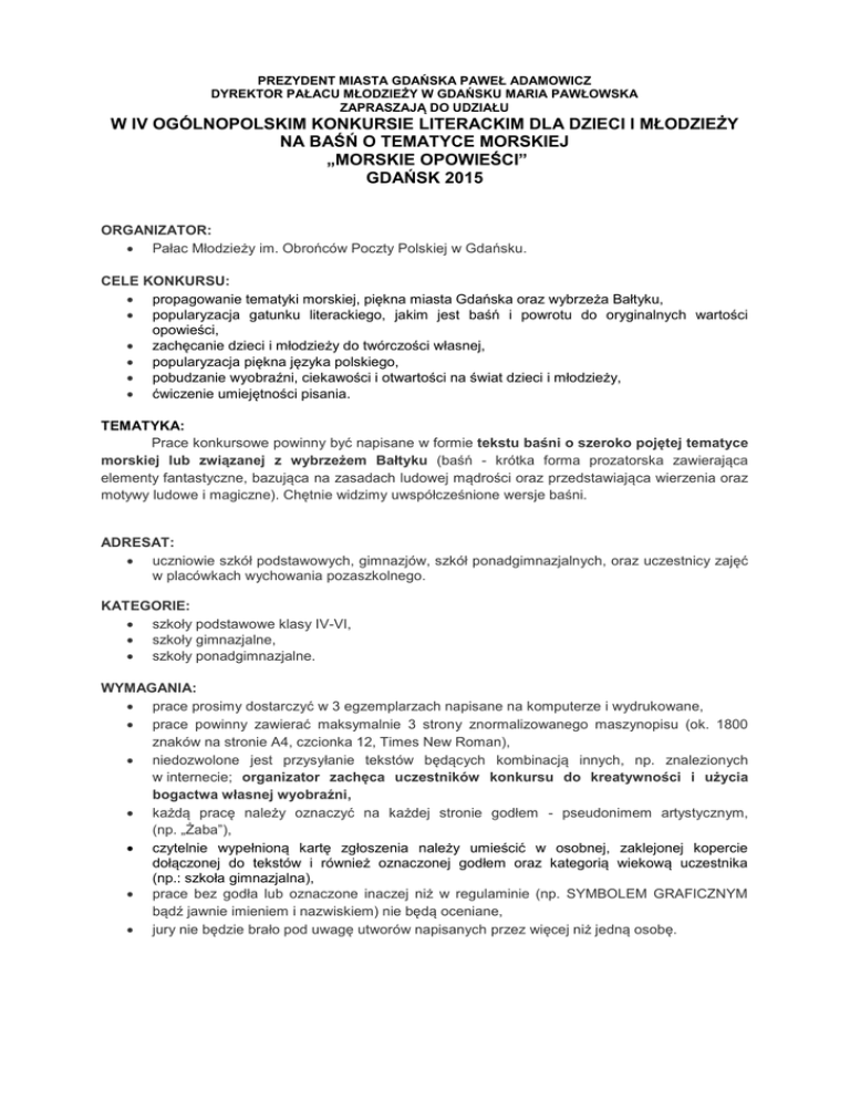 PREZYDENT MIASTA GDAŃSKA PAWEŁ ADAMOWICZ DYREKTOR PAŁACU MŁODZIEŻY W GDAŃSKU MARIA PAWŁOWSKA ZAPRASZAJĄ DO UDZIAŁU W IV OGÓLNOPOLSKIM KONKURSIE LITERACKIM DLA DZIECI I MŁODZIEŻY NA BAŚŃ O TEMATYCE MORSKIEJ „MORSKIE OPOWIEŚCI” GDAŃSK 2015 ORGANIZATOR: Pałac Młodzieży im. Obrońców Poczty Polskiej w Gdańsku. CELE KONKURSU: propagowanie tematyki morskiej, piękna miasta Gdańska oraz wybrzeża Bałtyku, popularyzacja gatunku literackiego, jakim jest baśń i powrotu do oryginalnych wartości opowieści, zachęcanie dzieci i młodzieży do twórczości własnej, popularyzacja piękna języka polskiego, pobudzanie wyobraźni, ciekawości i otwartości na świat dzieci i młodzieży, ćwiczenie umiejętności pisania. TEMATYKA: Prace konkursowe powinny być napisane w formie tekstu baśni o szeroko pojętej tematyce morskiej lub związanej z wybrzeżem Bałtyku (baśń - krótka forma prozatorska zawierająca elementy fantastyczne, bazująca na zasadach ludowej mądrości oraz przedstawiająca wierzenia oraz motywy ludowe i magiczne). Chętnie widzimy uwspółcześnione wersje baśni. ADRESAT: uczniowie szkół podstawowych, gimnazjów, szkół ponadgimnazjalnych, oraz uczestnicy zajęć w placówkach wychowania pozaszkolnego. KATEGORIE: szkoły podstawowe klasy IV-VI, szkoły gimnazjalne, szkoły ponadgimnazjalne. WYMAGANIA: prace prosimy dostarczyć w 3 egzemplarzach napisane na komputerze i wydrukowane, prace powinny zawierać maksymalnie 3 strony znormalizowanego maszynopisu (ok. 1800 znaków na stronie A4, czcionka 12, Times New Roman), niedozwolone jest przysyłanie tekstów będących kombinacją innych, np. znalezionych w internecie; organizator zachęca uczestników konkursu do kreatywności i użycia bogactwa własnej wyobraźni, każdą pracę należy oznaczyć na każdej stronie godłem - pseudonimem artystycznym, (np. „Żaba”), czytelnie wypełnioną kartę zgłoszenia należy umieścić w osobnej, zaklejonej kopercie dołączonej do tekstów i również oznaczonej godłem oraz kategorią wiekową uczestnika (np.: szkoła gimnazjalna), prace bez godła lub oznaczone inaczej niż w regulaminie (np. SYMBOLEM GRAFICZNYM bądź jawnie imieniem i nazwiskiem) nie będą oceniane, jury nie będzie brało pod uwagę utworów napisanych przez więcej niż jedną osobę. WARUNKI UCZESTNICTWA: przesłanie prac wraz z kartą zgłoszenia do 20 marca 2015 roku (decyduje data wpływu do placówki) na adres: Pałac Młodzieży, ul. Ogarna 56, 80-826 Gdańsk z dopiskiem KONKURS NA BAŚŃ lub dostarczenie do sekretariatu Pałacu Młodzieży. TERMINY: do 20 marca 2015r.- nadsyłanie prac, 17 kwietnia 2015 r.- ogłoszenie wyników na stronie internetowej Pałacu Młodzieży w Gdańsku - www.palacmlo.internetdsl.pl, 25 kwietnia 2015r., godz. 11.00 - uroczyste wręczenie nagród w siedzibie Narodowego Muzeum Morskiego w Gdańsku, ul. Ołowianka 9-13. OCENA I NAGRODY: prace oceni profesjonalne jury, jury przyzna nagrody: I, II i III w trzech kategoriach wiekowych oraz wyróżnienia, jury zastrzega sobie prawo do innego podziału nagród niż wyżej wymieniony. Decyzje jury są ostateczne. POSTANOWIENIA KOŃCOWE: przesłanie prac na konkurs jest jednoznaczne z przekazaniem pełnych praw autorskich na rzecz organizatora konkursu oraz wyrażeniem zgody na przetwarzanie danych osobowych w rozumieniu Ustawy z dnia 29 sierpnia 1997 o ochronie danych osobowych (Dz. U. 1997 nr 133 poz. 883 z późniejszymi zmianami), przesłanie pracy wraz z kartą zgłoszenia jest jednoznaczne z akceptacją regulaminu, prace niezgodne z regulaminem, nieprawidłowo opisane, bez karty zgłoszenia nie będą oceniane, zgłaszający wyraża zgodę na rejestrację fotograficzną i wideo przez organizatorów gali wręczenia nagród oraz ich publikację i emisję w dowolnych mediach, a także wykorzystanie danych osobowych w materiałach dotyczących konkursu, organizator zastrzega sobie prawo do odwołania konkursu z przyczyn niezależnych. Szczegółowych informacji w sprawie uczestnictwa w konkursie udziela: Dział Promocji, Edukacji i Animacji Kulturalnej Pałacu Młodzieży w Gdańsku. Tel.(58) 301 60 07; e-mail: [email protected]
