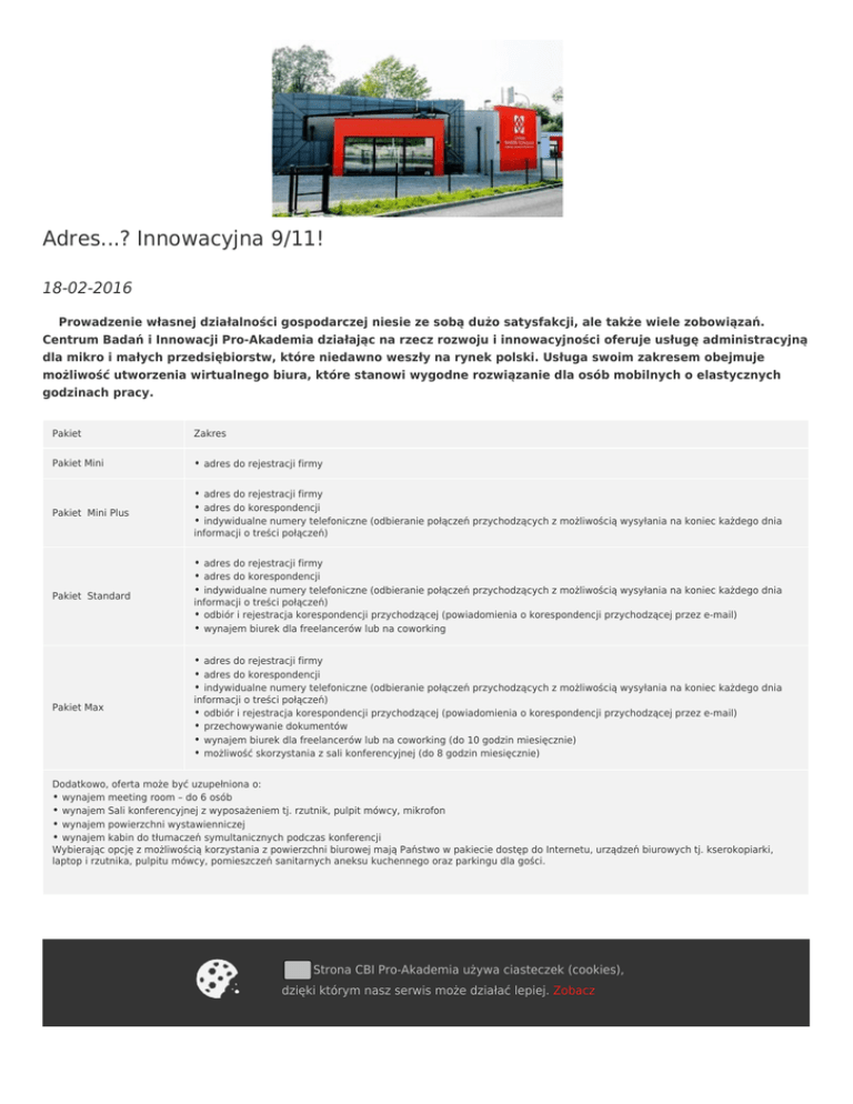 Adres...? Innowacyjna 9/11! 18-02-2016 Prowadzenie własnej działalności gospodarczej niesie ze sobą dużo satysfakcji, ale także wiele zobowiązań. Centrum Badań i Innowacji Pro-Akademia działając na rzecz rozwoju i innowacyjności oferuje usługę administracyjną dla mikro i małych przedsiębiorstw, które niedawno weszły na rynek polski. Usługa swoim zakresem obejmuje możliwość utworzenia wirtualnego biura, które stanowi wygodne rozwiązanie dla osób mobilnych o elastycznych godzinach pracy. Pakiet Zakres Pakiet Mini • adres do rejestracji firmy Pakiet Mini Plus • adres do rejestracji firmy • adres do korespondencji • indywidualne numery telefoniczne (odbieranie połączeń przychodzących z możliwością wysyłania na koniec każdego dnia informacji o treści połączeń) Pakiet Standard • adres do rejestracji firmy • adres do korespondencji • indywidualne numery telefoniczne (odbieranie połączeń przychodzących z możliwością wysyłania na koniec każdego dnia informacji o treści połączeń) • odbiór i rejestracja korespondencji przychodzącej (powiadomienia o korespondencji przychodzącej przez e-mail) • wynajem biurek dla freelancerów lub na coworking • adres do rejestracji firmy • adres do korespondencji • indywidualne numery telefoniczne (odbieranie połączeń przychodzących z możliwością wysyłania na koniec każdego dnia Pakiet Max informacji o treści połączeń) • odbiór i rejestracja korespondencji przychodzącej (powiadomienia o korespondencji przychodzącej przez e-mail) • przechowywanie dokumentów • wynajem biurek dla freelancerów lub na coworking (do 10 godzin miesięcznie) • możliwość skorzystania z sali konferencyjnej (do 8 godzin miesięcznie) Dodatkowo, oferta może być uzupełniona o: • wynajem meeting room – do 6 osób • wynajem Sali konferencyjnej z wyposażeniem tj. rzutnik, pulpit mówcy, mikrofon • wynajem powierzchni wystawienniczej • wynajem kabin do tłumaczeń symultanicznych podczas konferencji Wybierając opcję z możliwością korzystania z powierzchni biurowej mają Państwo w pakiecie dostęp do Internetu, urządzeń biurowych tj. kserokopiarki, laptop i rzutnika, pulpitu mówcy, pomieszczeń sanitarnych aneksu kuchennego oraz parkingu dla gości. Strona CBI Pro-Akademia używa ciasteczek (cookies), dzięki którym nasz serwis może działać lepiej. Zobacz