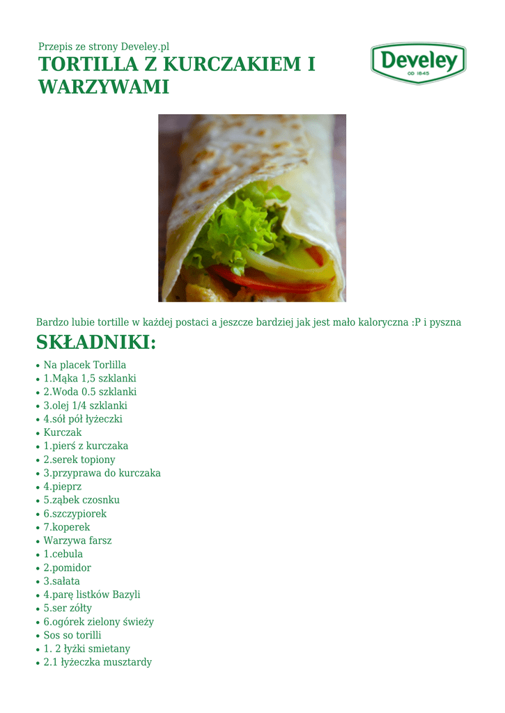 Przepis ze strony Develey.pl TORTILLA Z KURCZAKIEM I WARZYWAMI Bardzo lubie tortille w każdej postaci a jeszcze bardziej jak jest mało kaloryczna :P i pyszna SKŁADNIKI: ● ● ● ● ● ● ● ● ● ● ● ● ● ● ● ● ● ● ● ● ● ● ● Na placek Torlilla 1.Mąka 1,5 szklanki 2.Woda 0.5 szklanki 3.olej 1/4 szklanki 4.sół pół łyżeczki Kurczak 1.pierś z kurczaka 2.serek topiony 3.przyprawa do kurczaka 4.pieprz 5.ząbek czosnku 6.szczypiorek 7.koperek Warzywa farsz 1.cebula 2.pomidor 3.sałata 4.parę listków Bazyli 5.ser zółty 6.ogórek zielony świeży Sos so torilli 1. 2 łyżki smietany 2.1 łyżeczka musztardy ● ● ● 3.1 łyżeczka majonezu 4.szczypiorek 5.sól , pieprz SPOSÓB PRZYGOTOWANIA: 1. Tortilla: 1.Do miski wsypujemy mąke ,dolewamy oleju oraz wodu ,dodajemy sól,następnie wyrabiamy ciasto przez okolo 10 min i rozwałkowujemy na bardzo cienkie placki .Kładziemy gotowe placki na sucha rozgrzaną patelnie i pieczemy okolo 1 minut z każdej strony . 2.Kurczak: Piersi z kurczaka kroimy w paseczki marynujemy w przyprawach dodajemy szczypiorek i koperek następnie podsmażamy na patelni Bez Oleju wlewamy 1/4 szklanki wody i wrzucamy serek topiony 3.Gdy kurczak będzie już gotowy zaczynamy robić placki Uwaga faszerujemy tortille gdy placki sa ciepłe wtedy nam sie nie połamią 4.Sos do posmarowania tortilli Wszystkie składniki łączymy wraz z poszatkowanym szczypiorkiem 5.Gorący placek smarujemy sosem kladziemy kurczaka warzywa ,bazylie i ser i troszke jeszcze polewamy sosem i zawijamy 6.Wystarczy włożyć jeszcze na 5 minut do piekarnika aby ser sie rozpuścił:P