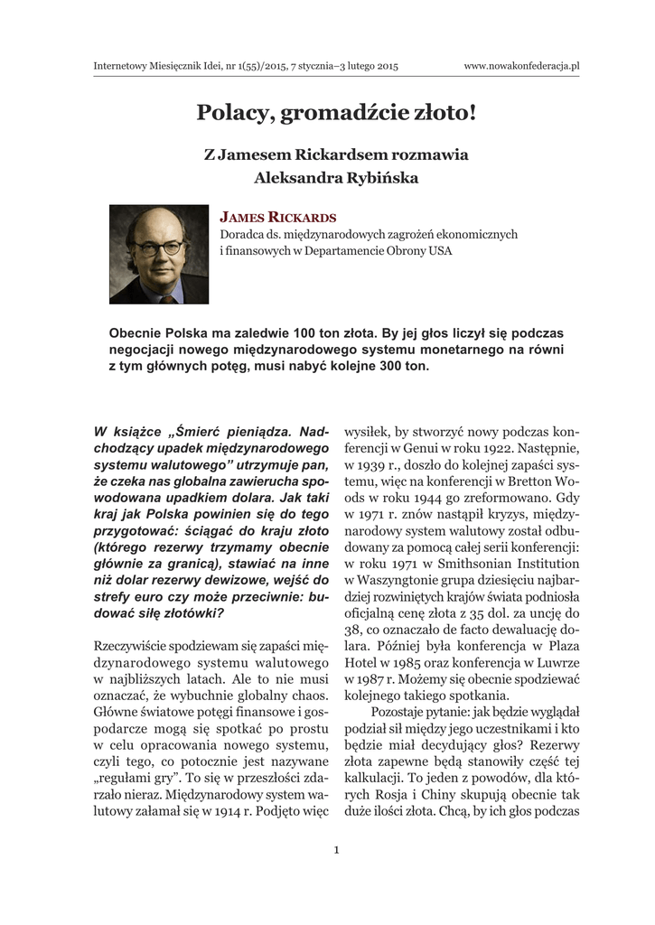 Internetowy Miesięcznik Idei, nr 1(55)/2015, 7 stycznia–3 lutego 2015 www.nowakonfederacja.pl Polacy, gromadźcie złoto! Z Jamesem Rickardsem rozmawia Aleksandra Rybińska JAmes RickARds Doradca ds. międzynarodowych zagrożeń ekonomicznych i finansowych w Departamencie Obrony USA Obecnie Polska ma zaledwie 100 ton złota. By jej głos liczył się podczas negocjacji nowego międzynarodowego systemu monetarnego na równi z tym głównych potęg, musi nabyć kolejne 300 ton. W książce „Śmierć pieniądza. Nadchodzący upadek międzynarodowego systemu walutowego” utrzymuje pan, że czeka nas globalna zawierucha spowodowana upadkiem dolara. Jak taki kraj jak Polska powinien się do tego przygotować: ściągać do kraju złoto (którego rezerwy trzymamy obecnie głównie za granicą), stawiać na inne niż dolar rezerwy dewizowe, wejść do strefy euro czy może przeciwnie: budować siłę złotówki? wysiłek, by stworzyć nowy podczas konferencji w Genui w roku 1922. Następnie, w 1939 r., doszło do kolejnej zapaści systemu, więc na konferencji w Bretton Woods w roku 1944 go zreformowano. Gdy w 1971 r. znów nastąpił kryzys, międzynarodowy system walutowy został odbudowany za pomocą całej serii konferencji: w roku 1971 w Smithsonian Institution w Waszyngtonie grupa dziesięciu najbardziej rozwiniętych krajów świata podniosła oficjalną cenę złota z 35 dol. za uncję do 38, co oznaczało de facto dewaluację dolara. Później była konferencja w Plaza Hotel w 1985 oraz konferencja w Luwrze w 1987 r. Możemy się obecnie spodziewać kolejnego takiego spotkania. Pozostaje pytanie: jak będzie wyglądał podział sił między jego uczestnikami i kto będzie miał decydujący głos? Rezerwy złota zapewne będą stanowiły część tej kalkulacji. To jeden z powodów, dla których Rosja i Chiny skupują obecnie tak duże ilości złota. Chcą, by ich głos podczas Rzeczywiście spodziewam się zapaści międzynarodowego systemu walutowego w najbliższych latach. Ale to nie musi oznaczać, że wybuchnie globalny chaos. Główne światowe potęgi finansowe i gospodarcze mogą się spotkać po prostu w celu opracowania nowego systemu, czyli tego, co potocznie jest nazywane „regułami gry”. To się w przeszłości zdarzało nieraz. Międzynarodowy system walutowy załamał się w 1914 r. Podjęto więc 1 Internetowy Miesięcznik Idei, nr 1(55)/2015, 7 stycznia–3 lutego 2015 następnej międzynarodowej konferencji walutowej był słyszalny. Najlepszym rozwiązaniem dla Polski byłoby więc nabycie złota. W ilości równowartej 3 proc. PKB, czyli tyle, ile posiadają Rosja i Chiny. Strefa euro posiada rezerwy złota o równowartości 4 proc. PKB. W przypadku Polski oznacza to, że jej rezerwy złota powinny wynosić ok. 400 ton. Obecnie Polska ma zaledwie 100 ton. By jej głos liczył się podczas negocjacji nowego międzynarodowego systemu monetarnego na równi z tym głównych potęg, musi więc nabyć kolejne 300 ton. To powinno się dokonać w małych krokach, by nie zaburzyć rynku. Program skupu w wysokości 12 ton miesięcznie w ciągu najbliższych dwóch lat pozwoliłby osiągnąć ten cel. Poza tym złoto, które Polska już ma, czyli te 100 ton, które znajdują się obecnie za granicą, musi do niej wrócić, by nie mogło w chwili kryzysu zostać zarekwirowane przez Stany Zjednoczone czy Wielką Brytanię. www.nowakonfederacja.pl winna zgromadzić. Polska mogłaby poza tym pokryć koszty wynikające z wydobycia srebra w złotówkach. Chodzi o takie koszty jak praca, energia, narzędzia. Byłby to także sposób na sfinansowanie takich twardych aktywów jak złoto w lokalnej walucie, którą można dodrukować. Drukowanie nowych pieniędzy pozwoliłoby zaś na utrzymanie kursowej wartości waluty na niskim poziomie, co pozwoliłoby na promocję eksportu i turystyki. Złoto, które Polska już ma, czyli te 100 ton, które znajdują się obecnie za granicą, musi do niej wrócić, by nie mogło w chwili kryzysu zostać zarekwirowane przez stany Zjednoczone czy Wielką Polska wydobywa rocznie ok. 1 tony złota i 1 200 ton srebra. W złocie, które pana zdaniem odegra kluczową rolę w budowaniu nowego systemu walutowego, jesteśmy więc mikrusem, ale w srebrze – potentatem. Co możemy z tym srebrem zrobić? Czy może nam się w jakikolwiek sposób przysłużyć? Brytanię W poprzedniej książce demaskował pan i analizował wojny walutowe. Czy taka wojna nie kryje się za gwałtownym osłabieniem rubla w ostatnim czasie? Tego, co się dzieje obecnie z rosyjskim rublem, nie nazwałbym wojną walutową, tylko dosłowną wojną, rozgrywaną za pomocą finansowych instrumentów. Rubel doznał zapaści po części z powodu spadku cen ropy i po części z powodu sankcji nałożonych na Rosję przez Stany Zjednoczone i ich sojuszników, w odpowiedzi na inwazję Krymu oraz wschodniej Ukrainy. Nikt nie uważa, że USA czy NATO powinny odpowiedzieć na to, co się dzieje Owszem. Polska mogłaby sprzedać swoje srebro na rynku za dolary i za pomocą tych dolarów kupować złoto. Mogłaby także się porozumieć z jednym z głównych rafinatorów, że dostarczy srebro w zamian za rafinowane złoto. Srebro, które Polska ma, wystarczy tylko na wymianę na ok. 20 ton złota rocznie, ale byłby to dobry pierwszy krok w kierunku docelowych 140 ton złota rocznie, które Polska po2 Internetowy Miesięcznik Idei, nr 1(55)/2015, 7 stycznia–3 lutego 2015 na Ukrainie, militarnie. Niemniej Zachód sięgnął po gospodarcze sankcje głównie dlatego, że nie chce, by powstało wrażenie, iż nie robi nic. Osłabienie Rosji nie było więc głównym celem jego działań. Problem w tym, że Rosja jest w stanie odpowiedzieć na te sankcje przy pomocy ataków cybernetycznych, doprowadzając choćby do paraliżu amerykańskich giełd. To stanowiłoby niebezpieczną eskalację, nie tylko ze względu na ryzyko celowych ataków na systemy informatyczne, lecz także ze względu na r