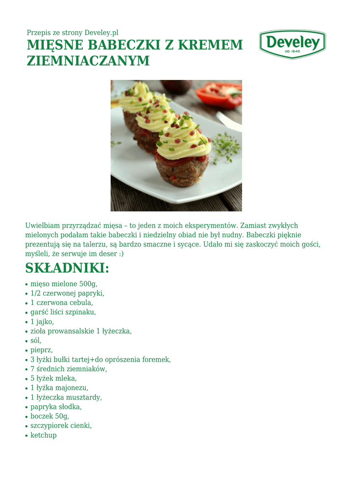 Przepis ze strony Develey.pl MIĘSNE BABECZKI Z KREMEM ZIEMNIACZANYM Uwielbiam przyrządzać mięsa – to jeden z moich eksperymentów. Zamiast zwykłych mielonych podałam takie babeczki i niedzielny obiad nie był nudny. Babeczki pięknie prezentują się na talerzu, są bardzo smaczne i sycące. Udało mi się zaskoczyć moich gości, myśleli, że serwuje im deser :) SKŁADNIKI: ● ● ● ● ● ● ● ● ● ● ● ● ● ● ● ● ● mięso mielone 500g, 1/2 czerwonej papryki, 1 czerwona cebula, garść liści szpinaku, 1 jajko, zioła prowansalskie 1 łyżeczka, sól, pieprz, 3 łyżki bułki tartej+do oprószenia foremek, 7 średnich ziemniaków, 5 łyżek mleka, 1 łyżka majonezu, 1 łyżeczka musztardy, papryka słodka, boczek 50g, szczypiorek cienki, ketchup SPOSÓB PRZYGOTOWANIA: 1. Cebulę obieramy i kroimy w drobną kostkę. Z papryki usuwamy gniazda nasienne i kroimy w drobną kostkę. Liście szpinaku kroimy w kostkę. 2. Do miski wkładamy mięso, dodajemy cebulę, paprykę, szpinak, jajko, bułkę tartą, zioła prowansalskie i dokładnie mieszamy. Całość doprawiamy solą i pieprzem. 3. Formę do muffinek smarujemy masłem i oprószamy bułką tartą. Z masy mięsnej formujemy kulki i wkładamy je do foremki. Wyszło mi 7 kulek. 4. Całość pieczemy 30 minut w 180 stopniach. 5. Boczek kroimy w małą kostkę i podsmażamy. Szczypiorek siekamy. 6. W tym czasie przygotowujemy krem ziemniaczany. Ziemniaki gotujemy w osolonej wodzie, po ugotowaniu odcedzamy, dodajemy mleko, majonez, musztardę i szczyptę słodkiej papryki i dokładnie mieszamy do momentu aż masa zrobi się kremowa. Masę ewentualnie doprawiamy jeszcze solą. Masę przekładamy do szprycy. Babeczki mięsne wyjmujemy z piekarnika, polewamy odrobiną ketchupu i wyciskamy na nie krem ziemniaczany. Babeczki posypujemy boczkiem i szczypiorkiem, Życzę smacznego :)