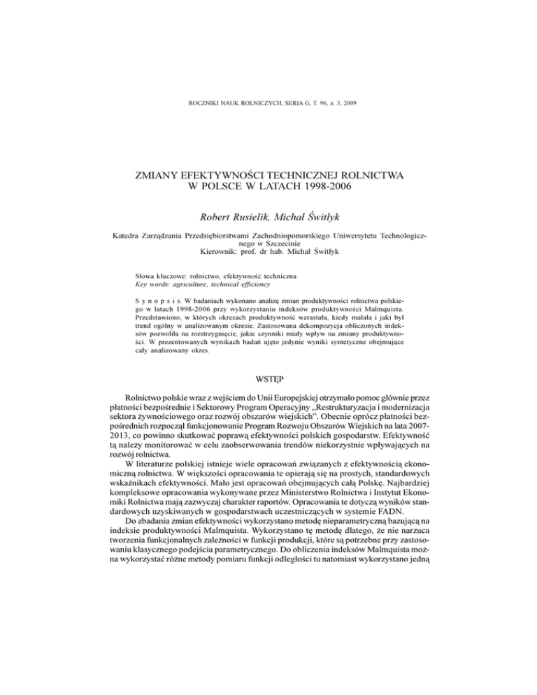 20 ROCZNIKI NAUK ROLNICZYCH, SERIA G, T. 96, z. 3, 2009 R .RUSIELIK, M. WIT£YK ZMIANY EFEKTYWNOCI TECHNICZNEJ ROLNICTWA W POLSCE W LATACH 1998-2006 Robert Rusielik, Micha³ wit³yk Katedra Zarz¹dzania Przedsiêbiorstwami Zachodniopomorskiego Uniwersytetu Technologicznego w Szczecinie Kierownik: prof. dr hab. Micha³ wit³yk S³owa kluczowe: rolnictwo, efektywnoæ techniczna Key words: agriculture, technical efficiency S y n o p s i s. W badaniach wykonano analizê zmian produktywnoci rolnictwa polskiego w latach 1998-2006 przy wykorzystaniu indeksów produktywnoci Malmquista. Przedstawiono, w których okresach produktywnoæ wzrasta³a, kiedy mala³a i jaki by³ trend ogólny w analizowanym okresie. Zastosowana dekompozycja obliczonych indeksów pozwoli³a na rozstrzygniêcie, jakie czynniki mia³y wp³yw na zmiany produktywnoci. W prezentowanych wynikach badañ ujêto jedynie wyniki syntetyczne obejmuj¹ce ca³y analizowany okres. WSTÊP Rolnictwo polskie wraz z wejciem do Unii Europejskiej otrzyma³o pomoc g³ównie przez p³atnoci bezporednie i Sektorowy Program Operacyjny Restrukturyzacja i modernizacja sektora ¿ywnociowego oraz rozwój obszarów wiejskich. Obecnie oprócz p³atnoci bezporednich rozpocz¹³ funkcjonowanie Program Rozwoju Obszarów Wiejskich na lata 20072013, co powinno skutkowaæ popraw¹ efektywnoci polskich gospodarstw. Efektywnoæ t¹ nale¿y monitorowaæ w celu zaobserwowania trendów niekorzystnie wp³ywaj¹cych na rozwój rolnictwa. W literaturze polskiej istnieje wiele opracowañ zwi¹zanych z efektywnoci¹ ekonomiczn¹ rolnictwa. W wiêkszoci opracowania te opieraj¹ siê na prostych, standardowych wskanikach efektywnoci. Ma³o jest opracowañ obejmuj¹cych ca³¹ Polskê. Najbardziej kompleksowe opracowania wykonywane przez Ministerstwo Rolnictwa i Instytut Ekonomiki Rolnictwa maj¹ zazwyczaj charakter raportów. Opracowania te dotycz¹ wyników standardowych uzyskiwanych w gospodarstwach uczestnicz¹cych w systemie FADN. Do zbadania zmian efektywnoci wykorzystano metodê nieparametryczn¹ bazuj¹c¹ na indeksie produktywnoci Malmquista. Wykorzystano tê metodê dlatego, ¿e nie narzuca tworzenia funkcjonalnych zale¿noci w funkcji produkcji, które s¹ potrzebne przy zastosowaniu klasycznego podejcia parametrycznego. Do obliczenia indeksów Malmquista mo¿na wykorzystaæ ró¿ne metody pomiaru funkcji odleg³oci tu natomiast wykorzystano jedn¹ ZMIANY EFEKTYWNOCI TECHNICZNEJ ROLNICTWA W POLSCE W LATACH 1998-2006 21 z najbardziej popularnych metod bazuj¹cych na metodzie DEA zaproponowanej przez Färe i in. [1994]. Do rozwi¹zania problemu liniowego pos³u¿ono siê programem DEAP [Coelii 1996]. Program ten wykorzystuj¹c metodê DEA oblicza indeks TFP (Total Factor Productivity) Malmquista. Badania dotycz¹ce pomiaru efektywnoci metodami nieparametrycznymi i zastosowanie indeksów Malmquista do badania zmian efektywnoci i zmian technologicznych w czasie nie s¹ zagadnieniem nowym. Istniej¹ opracowania tego typu dotycz¹ce Polski, zarówno w literaturze zagranicznej jak i polskiej. W wiêkszoci s¹ to jednak badania fragmentaryczne i przeprowadzone na ma³ych próbach badawczych i trudno je odnieæ do ca³ej Polski. Przyk³adowo Breummer, Glauben i Thijssen [2002] opisali badania, w których wykorzystali indeks TFP Malmquista do zbadania 50 gospodarstw mlecznych. W 2003 roku K. Zawaliñska z UW w swojej pracy doktorskiej dotycz¹cej konkurencyjnoci polskiego rolnictwa w kontekcie integracji z UE przeprowadzi³a badania za lata 2000-2006 w 811 gospodarstwach wy³onionych z bazy IERiG¯ i wykorzysta³a równie¿ indeksy TFP Malmquista. Efektywnoæ techniczn¹ bada³ równie¿ Latruffe i in. [2004]. Badania by³y przeprowadzone na 914 gospodarstwach z bazy IERiG¯. Balcombe i in. [2005] opisali wyniki badañ 250 gospodarstw i dane za lata 2000-2004. Istniej¹ równie¿ opracowania mikroekonomiczne dotycz¹ce ró¿nych kierunków dzia³alnoci analizowanych grup gospodarstw i zazwyczaj przeprowadzanych w jakim wybranym regionie. W analizowanych badaniach podjêto próbê okrelenia zmian efektywnoci w latach 1998-2006. Skoncentrowano siê na modelu zorientowanym na nak³ady, natomiast dane do modelu dotycz¹ ca³ego obszaru Polski z uwzglêdnieniem poszczególnych województw. W modelu jako wektor wejcia wprowadzono takie czynniki produkcji jak: powierzchnia u¿ytków rolnych, liczba ci¹gników, liczba pracuj¹cych w rolnictwie, nawo¿enie mineralne, pog³owie byd³a i pog³owie trzody. Uwzglêdnione czynniki produkcji maj¹ generowaæ zagregowany wektor wyjcia w postaci wartoci skupu produktów rolnych. METODYKA BADAÑ Indeks produktywnoci Malmquista by³ wprowadzony przez Cavesa, Christiensena i Diewerta [1982]. Wykorzystali oni ideê zaproponowan¹ przez Malmquista [1953], która zak³ada³a wykorzystanie funkcji odleg³oci do formu³owania syntetycznego indeksu zmian wybranego czynnika pomiêdzy dwoma punktami w czasie. Prace Cavesa i in. [1982] rozwinêli Färe i in. [1995] formu³uj¹c model odpowiadaj¹cy redniej geometrycznej dwóch s¹siaduj¹cych indeksów zaproponowanych przez Cavesa, jednoczenie dokonuj¹c dekompozycji tego indeksu na zmiany efektywnoci i zmiany technologiczne. Mo¿na zastosowaæ podejcie zorientowane na nak³ady lub zorientowane na efekty. W prezentowanych badaniach wykorzystano podejcie zorientowane na nak³ady. Przyjmuj¹c za x wektor nak³adów, u jako wektor efektów i D jako odpowiednie funkcje odleg³oci, model mo¿na przedstawiæ nastêpuj¹co [Althin 2001]: Dekompozycjê tego modelu na czêæ zwi¹zan¹ ze zmian¹ efektywnoci i czêæ zwi¹zan¹ ze zmian¹ technologii mo¿na przedstawiæ nastêpuj¹co: W 0 W X [ X [ W W W W ª ' X [ ' X [ º « » ¬ ' X [ ' X [ ¼ W W W W W W W W W W W W 22 R .RUSIELIK, M. WIT£YK Do obliczenia indeksów produktywnoci Malmquista pos³u¿ono siê metod¹ Data Envelopment Analysis i wykorzystano do tego program komputerowy DEAP 2.1 Coelliego [1996]. W 0 W X [ X [ W W W W ª ' X [ ' X [ º '