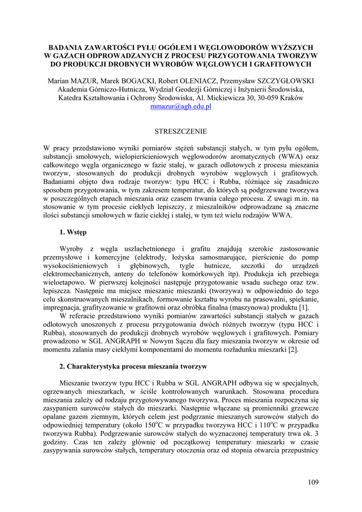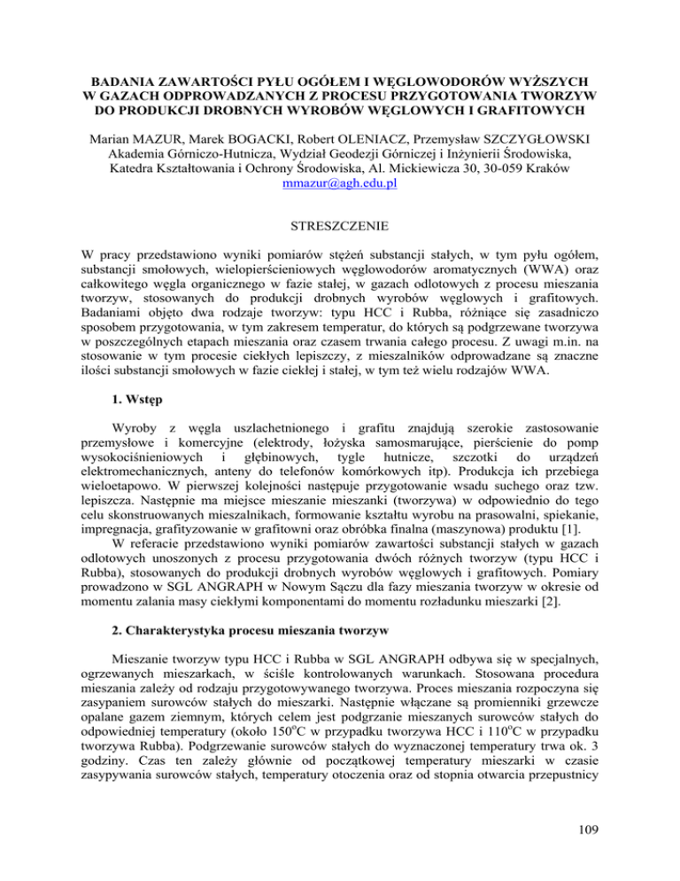 BADANIA ZAWARTOŚCI PYŁU OGÓŁEM I WĘGLOWODORÓW WYŻSZYCH W GAZACH ODPROWADZANYCH Z PROCESU PRZYGOTOWANIA TWORZYW DO PRODUKCJI DROBNYCH WYROBÓW WĘGLOWYCH I GRAFITOWYCH Marian MAZUR, Marek BOGACKI, Robert OLENIACZ, Przemysław SZCZYGŁOWSKI Akademia Górniczo-Hutnicza, Wydział Geodezji Górniczej i Inżynierii Środowiska, Katedra Kształtowania i Ochrony Środowiska, Al. Mickiewicza 30, 30-059 Kraków [email protected] STRESZCZENIE W pracy przedstawiono wyniki pomiarów stężeń substancji stałych, w tym pyłu ogółem, substancji smołowych, wielopierścieniowych węglowodorów aromatycznych (WWA) oraz całkowitego węgla organicznego w fazie stałej, w gazach odlotowych z procesu mieszania tworzyw, stosowanych do produkcji drobnych wyrobów węglowych i grafitowych. Badaniami objęto dwa rodzaje tworzyw: typu HCC i Rubba, różniące się zasadniczo sposobem przygotowania, w tym zakresem temperatur, do których są podgrzewane tworzywa w poszczególnych etapach mieszania oraz czasem trwania całego procesu. Z uwagi m.in. na stosowanie w tym procesie ciekłych lepiszczy, z mieszalników odprowadzane są znaczne ilości substancji smołowych w fazie ciekłej i stałej, w tym też wielu rodzajów WWA. 1. Wstęp Wyroby z węgla uszlachetnionego i grafitu znajdują szerokie zastosowanie przemysłowe i komercyjne (elektrody, łożyska samosmarujące, pierścienie do pomp wysokociśnieniowych i głębinowych, tygle hutnicze, szczotki do urządzeń elektromechanicznych, anteny do telefonów komórkowych itp). Produkcja ich przebiega wieloetapowo. W pierwszej kolejności następuje przygotowanie wsadu suchego oraz tzw. lepiszcza. Następnie ma miejsce mieszanie mieszanki (tworzywa) w odpowiednio do tego celu skonstruowanych mieszalnikach, formowanie kształtu wyrobu na prasowalni, spiekanie, impregnacja, grafityzowanie w grafitowni oraz obróbka finalna (maszynowa) produktu [1]. W referacie przedstawiono wyniki pomiarów zawartości substancji stałych w gazach odlotowych unoszonych z procesu przygotowania dwóch różnych tworzyw (typu HCC i Rubba), stosowanych do produkcji drobnych wyrobów węglowych i grafitowych. Pomiary prowadzono w SGL ANGRAPH w Nowym Sączu dla fazy mieszania tworzyw w okresie od momentu zalania masy ciekłymi komponentami do momentu rozładunku mieszarki [2]. 2. Charakterystyka procesu mieszania tworzyw Mieszanie tworzyw typu HCC i Rubba w SGL ANGRAPH odbywa się w specjalnych, ogrzewanych mieszarkach, w ściśle kontrolowanych warunkach. Stosowana procedura mieszania zależy od rodzaju przygotowywanego tworzywa. Proces mieszania rozpoczyna się zasypaniem surowców stałych do mieszarki. Następnie włączane są promienniki grzewcze opalane gazem ziemnym, których celem jest podgrzanie mieszanych surowców stałych do odpowiedniej temperatury (około 150oC w przypadku tworzywa HCC i 110oC w przypadku tworzywa Rubba). Podgrzewanie surowców stałych do wyznaczonej temperatury trwa ok. 3 godziny. Czas ten zależy głównie od początkowej temperatury mieszarki w czasie zasypywania surowców stałych, temperatury otoczenia oraz od stopnia otwarcia przepustnicy 109 w kanale, odprowadzającym gazy odlotowe z mieszarki. Po osiągnięciu właściwej temperatury następuje zalewanie suchej masy lepiszczem, które trwa zwykle kilka minut. Po zalaniu ma miejsce dalszy proces mieszania i podgrzewania masy, przy czym grzanie mieszalnika odbywa się jedynie przy pomocy promienników zlokalizowanych w dnie mieszarki. Podgrzewanie masy odbywa się do momentu, aż osiągnie ona temperaturę 215±5oC w przypadku tworzywa HCC lub 127±5oC w przypadku tworzywa Rubba. Proces ten trwa zwykle 4-5 godzin dla tworzywa HCC i 1-3 godzin dla tworzywa Rubba. Wówczas wyłączone zostają wszystkie promienniki, podgrzewające mieszarkę. Dalsze ogrzewanie masy do temperatury końcowej, która powinna wynosić 230±5oC w przypadku tworzywa HCC i 135±5oC w przypadku tworzywa Rubba, odbywa się już na zasadzie odbioru ciepła przez masę od rozgrzanej mieszarki [2]. 3. Metodyka badań W ramach badań wykonano pomiary stężeń substancji stałych, w tym pyłu ogółem, substancji smołowych, WWA oraz całkowitego węgla organicznego w fazie stałej (TOC) w gazach odlotowych z procesu mieszania tworzyw HCC i Rubba. Pomiar stężenia i strumienia masy pyłu w gazach odlotowych wykonano metodą grawimetryczną zgodnie z PN-Z-04030-7:1994, przy pomocy automatycznego pyłomierza grawimetrycznego typu EMIOTEST 2592. Poboru próbek zapylonego gazu dokonywano przy pomocy sondy aspiracyjnej z wewnętrzną separacją pyłu, stosując jako materiały filtracyjne filtry o średnicy 50 mm (1 seria) oraz gilzy (2 seria), wykonane z mikrowłókna szklanego. Dodatkowo podczas 2 serii pomiarowej pobierano na rurkach adsorpcyjnych, wypełnionych żywicą XAD-2, próbki gazów odlotowych do oznaczeń substancji smołowych, WWA oraz TOC. Przed rurkami adsorpcyjnymi stosowano wykraplacz oleju. Zawartość smoły w próbkach pobranych na filtrach i na żywicy XAD oznaczono metodą grawimetryczną, według procedury [3]. Sączki i żywice ekstrahowano dichlorometanem przez 8 godzin w aparacie Soxhleta. Uzyskane ekstrakty zagęszczano do objętości 10 ml, odparowując rozpuszczalnik w aparacie Kuderna-Danischa. Uzyskane ekstrakty dzielono na dwie części. Jedną część przeznaczano do oznaczenia zawartości WWA i całkowitego węgla organicznego (TOC) w związkach, o zakresie temperatur wrzenia od około 100 do 300oC, natomiast z drugiej części ekstraktu oznaczano zawartość smoły – czyli związki organiczne o temperaturze wrzenia 300oC i wyższej. Oznaczenie zawartości WWA w ekstraktach chlorometanowych próbek pobranych na sączkach i żywicach wykonano metodą chromatografii gazowej. Stosowano chromatograf gazowy HP6890 z detektorem płomieniowo-jonizacyjnym (FID) i kolumną kapilarną HP DB5 o długości 30 m pracującą z programowanym wzrostem temperatury 8oC/min od 40oC do 280oC. Analizę pró