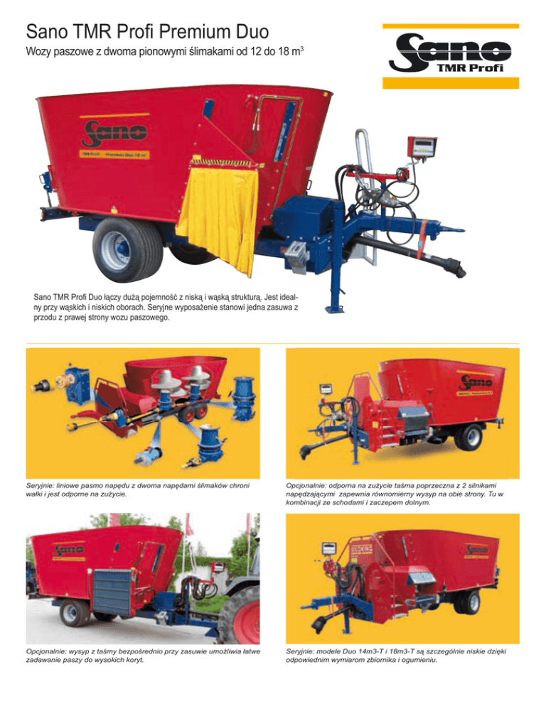 Sano TMR Profi Premium Duo Wozy paszowe z dwoma pionowymi ślimakami od 12 do 18 m3 Sano TMR Profi Duo łączy dużą pojemność z niską i wąską strukturą. Jest idealny przy wąskich i niskich oborach. Seryjne wyposażenie stanowi jedna zasuwa z przodu z prawej strony wozu paszowego. Seryjnie: liniowe pasmo napędu z dwoma napędami ślimaków chroni wałki i jest odporne na zużycie. Opcjonalnie: odporna na zużycie taśma poprzeczna z 2 silnikami napędzającymi zapewnia równomierny wysyp na obie strony. Tu w kombinacji ze schodami i zaczepem dolnym. Opcjonalnie: wysyp z taśmy bezpośrednio przy zasuwie umożliwia łatwe zadawanie paszy do wysokich koryt. Seryjnie: modele Duo 14m3-T i 18m3-T są szczególnie niskie dzięki odpowiednim wymiarom zbiornika i ogumieniu. 10 Sano TMR Profi Premium Duo Wozy paszowe z dwoma pionowymi ślimakami od 12 do 18 m3 Typ Nr artykułu Długość mm Szerokość mm Wysokość mm Opony 12m³ ED1205 13m³ ED1305 14m³ ED1405 14m³-T ED1415 16m³ ED1605 18m³ ED1805 18m³-T ED1815 6.000 1.960 2.620 6.200 2.060 2.640 6.250 2.060 2.760 6.550 2.260 2.450 6.550 2.260 2.700 6.600 2.260 2.900 6.850 2.420 2.580 435/50 R19,5 435/50 R19,5 435/50 R19,5 215/75 R17,5 Bliźniaki 435/50 R19,5 435/50 R19,5 215/75 R17,5 Bliźniaki 1.850 1.400 2.250 1.750 1.500 14.200 11.500 7.000 1.500 14.300 11.500 7.100 890/940 440 830/880 370 890 2.020 700 850 2.340 700 540 17/33 2x2 12 540 17/33 2x2 14 4 4 Zewnętrzny rozstaw kół mm 1.750 1.850 1.850 1.900 1.850 Wewnętrzny rozstaw kół mm 1.300 1.400 1.400 1.400 1.400 Dopuszczalne obciążenie zaczepu kg 1.500 1.500 1.500 1.500 1.500 Tech.dopuszczalna masa całkowita kg 9.900 11.500 11.400 12.000 13.200 Dopuszczalna masa całkowita kg 9.500 11.500 11.500 11.500 11.500 Masa wozu paszowego kg 5.100 5.700 5.800 6.400 6.800 Wysokość zaczepu górnego mm 880/930 880/930 880/930 830/880 890/940 Wysokość zaczepu dolnego mm 430 430 430 370 440 Wysokość wyrzutu taśmy* mm 890 890 890 850 890 Długość taśmy* mm 1.700 2.020 2.020 2.020 2.020 Szerokość taśmy* mm 700 700 700 700 700 Liczba obrotów wałka l.obr/min 540 540 540 540 540 Liczba obrotów ślimaka l.obr/min 17/33 17/33 17/33 17/33 17/33 Ilość spirali 2x1,5 2x1,75 2x1,75 2x1,75 2x2 Ilość noży 8 10 10 10 12 Liczba czujników wagi 4 4 4 4 4 * dla wozów paszowych z taśmą (wyposażenie dodatkowe) Wyposażenie seryjne Sano TMR Profi Premium Duo 12m3 do 18m3: • drabinka osadzona na ramie • zasuwa z przodu z prawej strony • 2 przekładnie planetarne zintegrowane ze ślimakiem • dodatkowa przekładnia redukcyjna • 2 turbo-ślimaki • ustawiane, specjalne noże XS 8 mm • wałek przekaźnika mocy • waga sumująca • kanciasty pojemnik • dwa mechaniczne przeciwnoże • obręcz ruchoma z łańcuszkami • stopka mechaniczna • hamulce hydrauliczne • zaczep górny • sterowanie z ciągnika* • belka z oświetleniem * ciągnik musi być zaopatrzony w 1 podwójnie działający sterownik (dla zasuwy) i 1 pojedynczy sterownik (dla hamulców hydraulicznych) Wysyp seryjny: zasuwa z przodu z prawej strony Inne warianty wysypu dawki TMR: Zmiana Nr. art.. Nazwa Dł. Szer. Wys. E0054 E0050 E0051 ED050 EPD51 EPD52 E0082 E0101 dodatkowa zasuwa z tyłu z prawej strony dodatkowa zasuwa z tyłu z lewej strony dodatkowa zasuwa z tyłu w środku tylko zasuwa z tyłu z lewej i z tyłu z prawej strony tylko taśma z tyłu / 2 silniki olejowe tylko taśma z przodu / 2 silniki olejowe podest ze schodami hydrauliczne przesunięcie taśmy lewo / prawo o 300mm** -- -- + 300mm -- + 350mm + 600mm + 600mm -- -- + 60mm -- + 60mm - 60mm - 60mm -- -- -- -- -- -- -- + 50mm• -- -- Cena w PLN 3.100,3.100,3.100,3.700,6.500,6.000,2.700,- 3.000,- przy kombinacji podest i schody z taśmą z przodu *nie zmienia się przy ogumieniu 435/50R19.5 zmienia się łączna długość o +600 mm ** konieczna taśma z przodu lub z tyłu z tym oznaczeniem: dla wyposażenia dodatkowego jest konieczna jedna dodatkowa podwójnie działająca funkcja hydrauliczna Pozostałe wyposażenie dodatkowe znajduje się na stronach 14 do 16 na zapytanie dostępne Sano TMR Profi Duo do 30m3 11