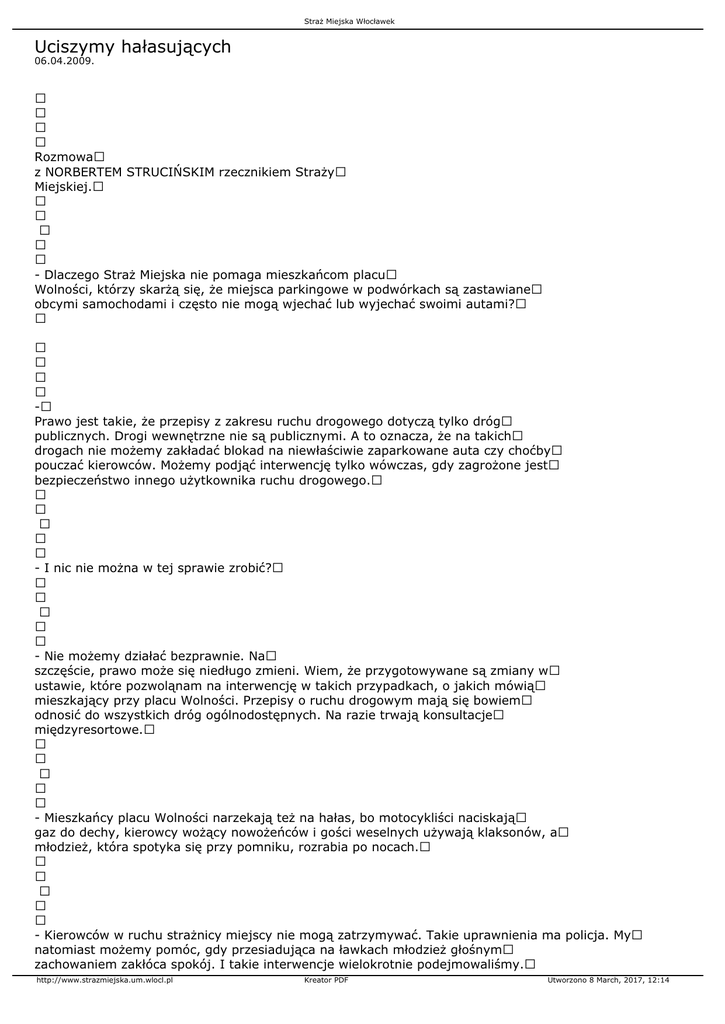 Straż Miejska Włocławek Uciszymy hałasujących 06.04.2009. Rozmowa z NORBERTEM STRUCIŃSKIM rzecznikiem Straży Miejskiej. - Dlaczego Straż Miejska nie pomaga mieszkańcom placu Wolności, którzy skarżą się, że miejsca parkingowe w podwórkach są zastawiane obcymi samochodami i często nie mogą wjechać lub wyjechać swoimi autami? - Prawo jest takie, że przepisy z zakresu ruchu drogowego dotyczą tylko dróg publicznych. Drogi wewnętrzne nie są publicznymi. A to oznacza, że na takich drogach nie możemy zakładać blokad na niewłaściwie zaparkowane auta czy choćby pouczać kierowców. Możemy podjąć interwencję tylko wówczas, gdy zagrożone jest bezpieczeństwo innego użytkownika ruchu drogowego. - I nic nie można w tej sprawie zrobić? - Nie możemy działać bezprawnie. Na szczęście, prawo może się niedługo zmieni. Wiem, że przygotowywane są zmiany w ustawie, które pozwoląnam na interwencję w takich przypadkach, o jakich mówią mieszkający przy placu Wolności. Przepisy o ruchu drogowym mają się bowiem odnosić do wszystkich dróg ogólnodostępnych. Na razie trwają konsultacje międzyresortowe. - Mieszkańcy placu Wolności narzekają też na hałas, bo motocykliści naciskają gaz do dechy, kierowcy wożący nowożeńców i gości weselnych używają klaksonów, a młodzież, która spotyka się przy pomniku, rozrabia po nocach. - Kierowców w ruchu strażnicy miejscy nie mogą zatrzymywać. Takie uprawnienia ma policja. My natomiast możemy pomóc, gdy przesiadująca na ławkach młodzież głośnym zachowaniem zakłóca spokój. I takie interwencje wielokrotnie podejmowaliśmy. http://www.strazmiejska.um.wlocl.pl Kreator PDF Utworzono 8 March, 2017, 12:14 Straż Miejska Włocławek 6.4.2009 Gazeta Pomorska str. 20 Włocławek, Aleksandrów, Radziejów, Lipno http://www.strazmiejska.um.wlocl.pl Kreator PDF Utworzono 8 March, 2017, 12:14