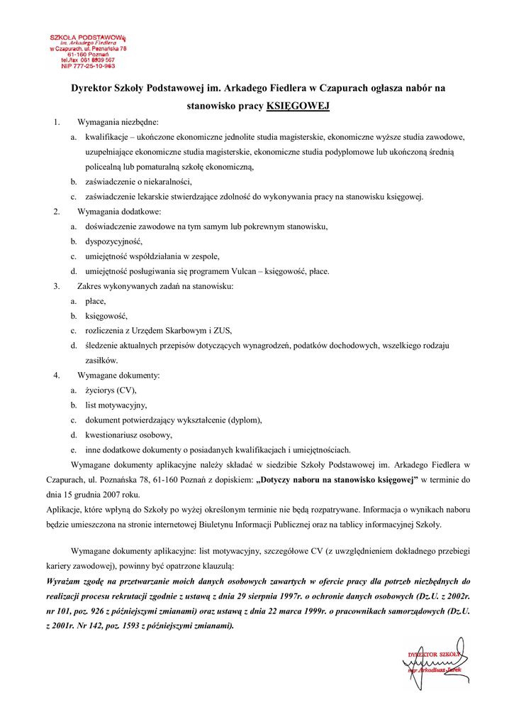 Dyrektor Szko y Podstawowej im. Arkadego Fiedlera w Czapurach og asza nabór na stanowisko pracy KSI GOWEJ 1. Wymagania niezb dne: a. kwalifikacje – uko czone ekonomiczne jednolite studia magisterskie, ekonomiczne wy sze studia zawodowe, uzupe niaj ce ekonomiczne studia magisterskie, ekonomiczne studia podyplomowe lub uko czon redni policealn lub pomaturaln szko ekonomiczn , b. za wiadczenie o niekaralno ci, c. 2. za wiadczenie lekarskie stwierdzaj ce zdolno do wykonywania pracy na stanowisku ksi gowej. Wymagania dodatkowe: a. do wiadczenie zawodowe na tym samym lub pokrewnym stanowisku, b. dyspozycyjno , c. umiej tno d. umiej tno 3. wspó dzia ania w zespole, pos ugiwania si programem Vulcan – ksi gowo , p ace. Zakres wykonywanych zada na stanowisku: a. ace, b. ksi gowo , c. d. rozliczenia z Urz dem Skarbowym i ZUS, ledzenie aktualnych przepisów dotycz cych wynagrodze , podatków dochodowych, wszelkiego rodzaju zasi ków. 4. Wymagane dokumenty: a. yciorys (CV), b. list motywacyjny, c. dokument potwierdzaj cy wykszta cenie (dyplom), d. kwestionariusz osobowy, e. inne dodatkowe dokumenty o posiadanych kwalifikacjach i umiej tno ciach. Wymagane dokumenty aplikacyjne nale y sk ada w siedzibie Szko y Podstawowej im. Arkadego Fiedlera w Czapurach, ul. Pozna ska 78, 61-160 Pozna z dopiskiem: „Dotyczy naboru na stanowisko ksi gowej” w terminie do dnia 15 grudnia 2007 roku. Aplikacje, które wp yn do Szko y po wy ej okre lonym terminie nie b rozpatrywane. Informacja o wynikach naboru dzie umieszczona na stronie internetowej Biuletynu Informacji Publicznej oraz na tablicy informacyjnej Szko y. Wymagane dokumenty aplikacyjne: list motywacyjny, szczegó owe CV (z uwzgl dnieniem dok adnego przebiegi kariery zawodowej), powinny by opatrzone klauzul : Wyra am zgod na przetwarzanie moich danych osobowych zawartych w ofercie pracy dla potrzeb niezb dnych do realizacji procesu rekrutacji zgodnie z ustaw z dnia 29 sierpnia 1997r. o ochronie danych osobowych (Dz.U. z 2002r. nr 101, poz. 926 z pó niejszymi zmianami) oraz ustaw z dnia 22 marca 1999r. o pracownikach samorz dowych (Dz.U. z 2001r. Nr 142, poz. 1593 z pó niejszymi zmianami).