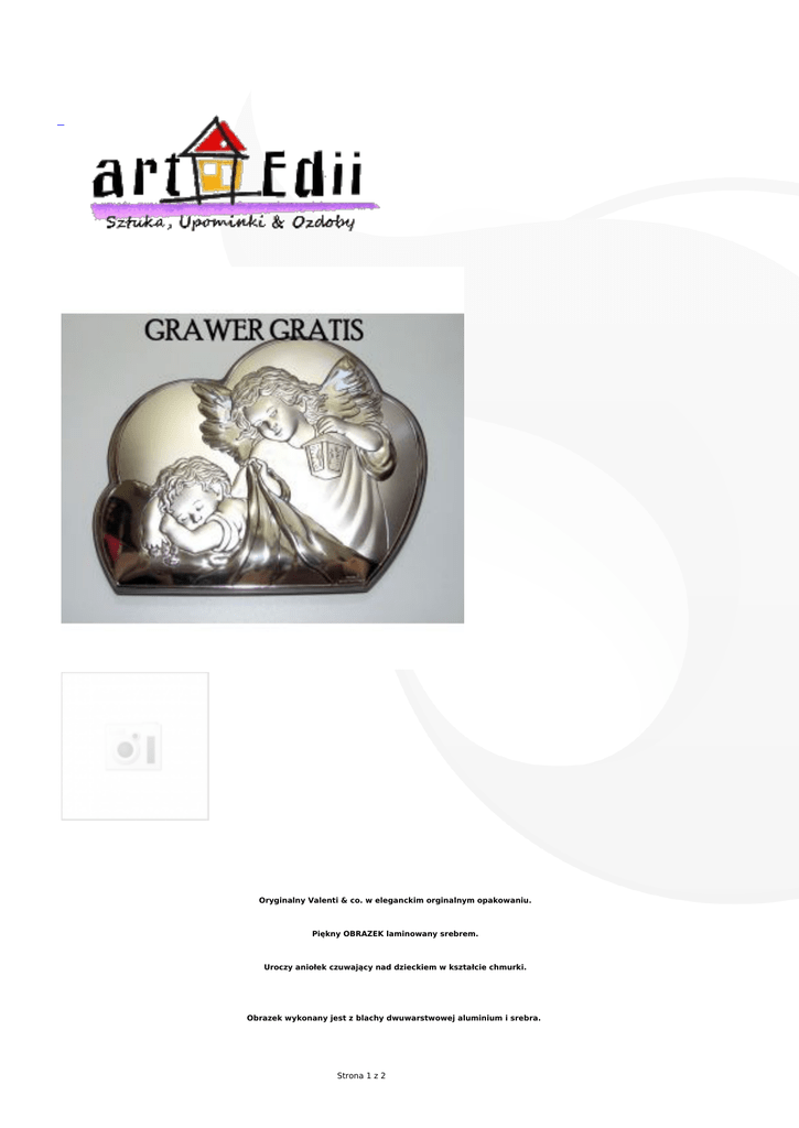 Oryginalny Valenti & co. w eleganckim orginalnym opakowaniu. Piękny OBRAZEK laminowany srebrem. Uroczy aniołek czuwający nad dzieckiem w kształcie chmurki. Obrazek wykonany jest z blachy dwuwarstwowej aluminium i srebra. Strona 1 z 2 Zewnetrzna warstwa srebra pokryta jest zabezpieczającym lakierem, dzięki czemu zachowa swój blask. Nie czyścic chemicznie, wystarczy miękka ściereczka. Obrazek może stać i wisieć. Wymiary całego obrazka: 14,8 x 12 cm Piękny prezent na: KOMUNIĘ, CHRZCINY, URODZINY, IMIENINY. Trwały i bardzo efektowny element dekoracyjny, pamiątka na lata. Strona 2 z 2