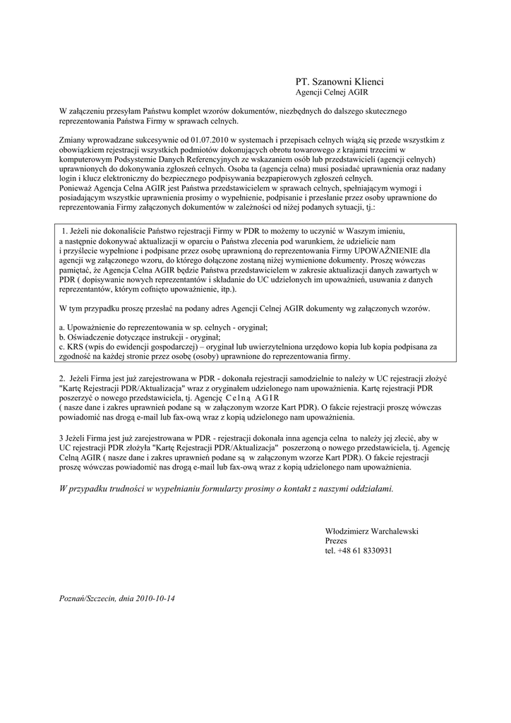 PT. Szanowni Klienci Agencji Celnej AGIR W załączeniu przesyłam Państwu komplet wzorów dokumentów, niezbędnych do dalszego skutecznego reprezentowania Państwa Firmy w sprawach celnych. Zmiany wprowadzane sukcesywnie od 01.07.2010 w systemach i przepisach celnych wiąŜą się przede wszystkim z obowiązkiem rejestracji wszystkich podmiotów dokonujących obrotu towarowego z krajami trzecimi w komputerowym Podsystemie Danych Referencyjnych ze wskazaniem osób lub przedstawicieli (agencji celnych) uprawnionych do dokonywania zgłoszeń celnych. Osoba ta (agencja celna) musi posiadać uprawnienia oraz nadany login i klucz elektroniczny do bezpiecznego podpisywania bezpapierowych zgłoszeń celnych. PoniewaŜ Agencja Celna AGIR jest Państwa przedstawicielem w sprawach celnych, spełniającym wymogi i posiadającym wszystkie uprawnienia prosimy o wypełnienie, podpisanie i przesłanie przez osoby uprawnione do reprezentowania Firmy załączonych dokumentów w zaleŜności od niŜej podanych sytuacji, tj.: 1. JeŜeli nie dokonaliście Państwo rejestracji Firmy w PDR to moŜemy to uczynić w Waszym imieniu, a następnie dokonywać aktualizacji w oparciu o Państwa zlecenia pod warunkiem, Ŝe udzielicie nam i przyślecie wypełnione i podpisane przez osobę uprawnioną do reprezentowania Firmy UPOWAśNIENIE dla agencji wg załączonego wzoru, do którego dołączone zostaną niŜej wymienione dokumenty. Proszę wówczas pamiętać, Ŝe Agencja Celna AGIR będzie Państwa przedstawicielem w zakresie aktualizacji danych zawartych w PDR ( dopisywanie nowych reprezentantów i składanie do UC udzielonych im upowaŜnień, usuwania z danych reprezentantów, którym cofnięto upowaŜnienie, itp.). W tym przypadku proszę przesłać na podany adres Agencji Celnej AGIR dokumenty wg załączonych wzorów. a. UpowaŜnienie do reprezentowania w sp. celnych - oryginał; b. Oświadczenie dotyczące instrukcji - oryginał; c. KRS (wpis do ewidencji gospodarczej) – oryginał lub uwierzytelniona urzędowo kopia lub kopia podpisana za zgodność na kaŜdej stronie przez osobę (osoby) uprawnione do reprezentowania firmy. 2. JeŜeli Firma jest juŜ zarejestrowana w PDR - dokonała rejestracji samodzielnie to naleŜy w UC rejestracji złoŜyć "Kartę Rejestracji PDR/Aktualizacja" wraz z oryginałem udzielonego nam upowaŜnienia. Kartę rejestracji PDR poszerzyć o nowego przedstawiciela, tj. Agencję C e l n ą A G I R ( nasze dane i zakres uprawnień podane są w załączonym wzorze Kart PDR). O fakcie rejestracji proszę wówczas powiadomić nas drogą e-mail lub fax-ową wraz z kopią udzielonego nam upowaŜnienia. 3 JeŜeli Firma jest juŜ zarejestrowana w PDR - rejestracji dokonała inna agencja celna to naleŜy jej zlecić, aby w UC rejestracji PDR złoŜyła "Kartę Rejestracji PDR/Aktualizacja" poszerzoną o nowego przedstawiciela, tj. Agencję Celną AGIR ( nasze dane i zakres uprawnień podane są w załączonym wzorze Kart PDR). O fakcie rejestracji proszę wówczas powiadomić nas drogą e-mail lub fax-ową wraz z kopią udzielonego nam upowaŜnienia. W przypadku trudności w wypełnianiu formularzy prosimy o kontakt z naszymi oddziałami. Włodzimierz Warchalewski Prezes tel. +48 61 8330931 Poznań/Szczecin, dnia 2010-10-14 Informacja dot. : ZASADY WYPEŁNIANIA UPOWAśNIEŃ ORAZ WYKAZ DOKUMENTÓW WYMAGANYCH PRZEZ URZĘDY CELNE DO ODPRAW Przesyłamy Państwu wzór UpowaŜnienia, informując jednocześnie, Ŝe UpowaŜnienie bezpośrednie wyłącza moŜliwość dokonywania przez agencję celną zgłoszeń celnych w wywozie poza siedzibą eksportera lub miejscem załadunku ( np. odprawa celna w wywozie na granicy celnej UE wymaga posiadania przez agencję celną upowaŜnienia pośredniego ). Udzielenie upowaŜnienie do wielokrotnych odpraw celnych – proszę pozostawić charakter upowaŜnienia „stały”. Zasada wypełniania upowaŜnienia : musi być na trwałym druku (wykluczony np. fax) wg załączonego wzoru, nazwa i siedziba firmy wpisana ręcznie lub maszynowo; skreślenie zakresu czynności i daty waŜności parafowane podpisem; upowaŜnienie podpisane przez osobę (osoby) prawnie zdolne do reprezentowania firmy na zewnątrz. .Opłatą skarbową w kwocie 17 zł. (do rozliczenia) wniesie Agencja Celna AGIR. Oryginał upowaŜnienia zostanie złoŜony w Izbie Celnej wraz z wnioskiem PDR, zgodnie Z „INSTRUKCJĄ NADANIA KODU IDENTYFIKACJI PDR” w.1.0 z dnia 2010-07-01. Do UpowaŜnienia udzielonego Agencji Celnej AGIR proszę dołączyć następujące dokumenty wymagane przez urząd celny dla rejestracji udzielonych agencji pełnomocnictw ( w przypadku kontynuacji upowaŜnienia proszę przesłać kopie tylko tych dokumentów które zmieniły treść): 1. 2. 3. 4. Rejestr handlowy (KRS) – (uwierzytelniona urzędowo kopia dla potrzeb rejestracji w PDR); Regon (numer statystyczny) - kopia; Zaświadczenie o nadaniu NIP - kopia ; Informacja (załączona) - osoba odpowiedzialna za sprawy finansowe, logistykę, itp.; UpowaŜnienie i dokumenty wyŜej wymienione proszę przesłać w zaleŜności od miejsca zlecanej usługi wraz z upowaŜnieniem wypisanym i podpisanym przez osobę (osoby) uprawnioną (e) zgodnie z rejestrem na poniŜsze adresy: Oddział POZNAŃ: Oddział SZCZECIN: Agencja Celna AGIR Sp. z o.o. ul. Wichrowa 4, 60-449 Poznań Agencja Celna AGIR Sp. z o.o. ul. Hryniewieckiego 1 / 38, 70-606 Szczecin Wszelkich dodatkowych informacji udzielimy Państwu telefonicznie, fax-em, pocztą e-mail w naszych oddziałach, zgodnie z danymi zawartymi na stronie www.agir.com.pl Z powaŜaniem Włodzimierz Warchalewski Prezes tel. +48 61 8330931 e-mail : zarzad @agir.com.pl tel. 61 8330931 www.agir.com.pl ............................................ (miejscowość) (dnia) place date UPOWAśNIENIE AUTHORIZATION do działania w formie przedstawicielstwa POŚREDNIEGO / BEZPOŚREDNIEGO to act in the capacity of DIRECT/ INDIRECT representation Niniejszym upowaŜniam agencję celną i wszystkich zatrudni