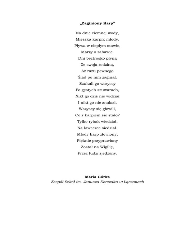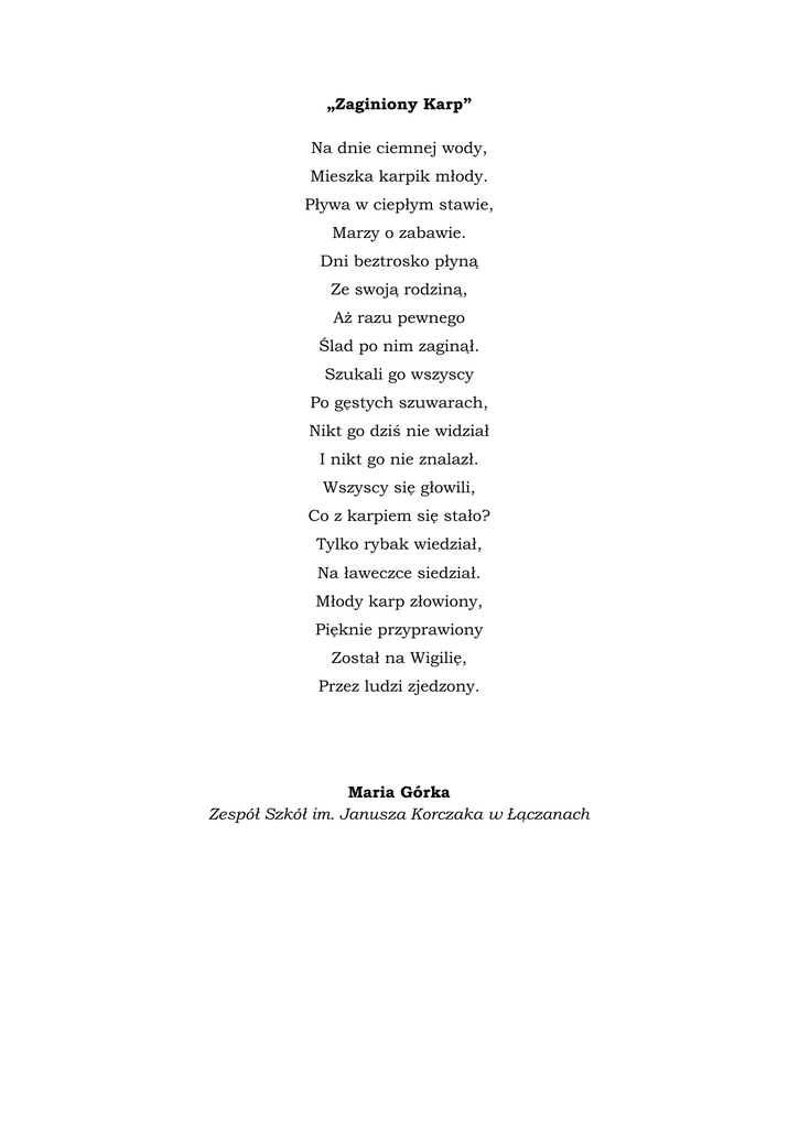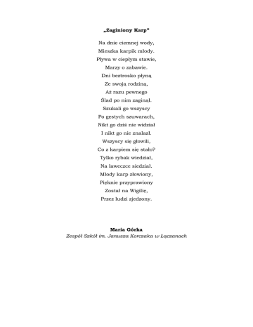 „Zaginiony Karp” Na dnie ciemnej wody, Mieszka karpik młody. Pływa w ciepłym stawie, Marzy o zabawie. Dni beztrosko płyną Ze swoją rodziną, Aż razu pewnego Ślad po nim zaginął. Szukali go wszyscy Po gęstych szuwarach, Nikt go dziś nie widział I nikt go nie znalazł. Wszyscy się głowili, Co z karpiem się stało? Tylko rybak wiedział, Na ławeczce siedział. Młody karp złowiony, Pięknie przyprawiony Został na Wigilię, Przez ludzi zjedzony. Maria Górka Zespół Szkół im. Janusza Korczaka w Łączanach