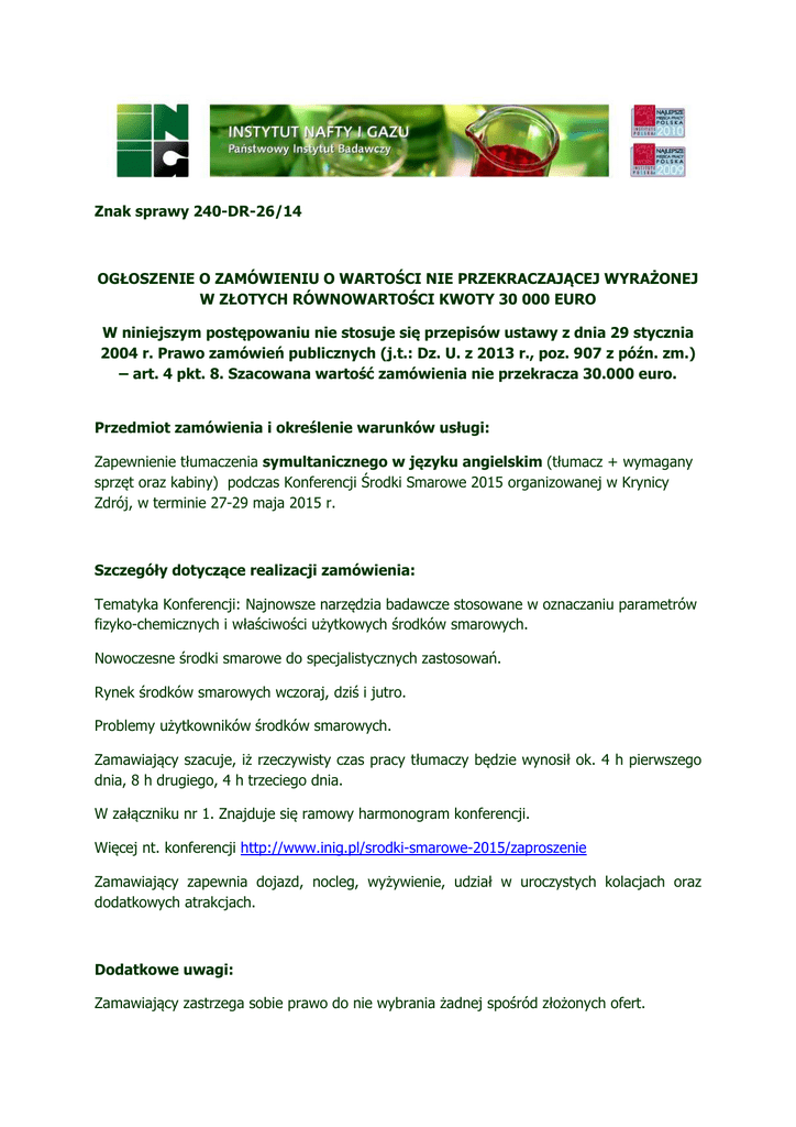 Znak sprawy 240-DR-26/14 OGŁOSZENIE O ZAMÓWIENIU O WARTOŚCI NIE PRZEKRACZAJĄCEJ WYRAŻONEJ W ZŁOTYCH RÓWNOWARTOŚCI KWOTY 30 000 EURO W niniejszym postępowaniu nie stosuje się przepisów ustawy z dnia 29 stycznia 2004 r. Prawo zamówień publicznych (j.t.: Dz. U. z 2013 r., poz. 907 z późn. zm.) – art. 4 pkt. 8. Szacowana wartość zamówienia nie przekracza 30.000 euro. Przedmiot zamówienia i określenie warunków usługi: Zapewnienie tłumaczenia symultanicznego w języku angielskim (tłumacz + wymagany sprzęt oraz kabiny) podczas Konferencji Środki Smarowe 2015 organizowanej w Krynicy Zdrój, w terminie 27-29 maja 2015 r. Szczegóły dotyczące realizacji zamówienia: Tematyka Konferencji: Najnowsze narzędzia badawcze stosowane w oznaczaniu parametrów fizyko-chemicznych i właściwości użytkowych środków smarowych. Nowoczesne środki smarowe do specjalistycznych zastosowań. Rynek środków smarowych wczoraj, dziś i jutro. Problemy użytkowników środków smarowych. Zamawiający szacuje, iż rzeczywisty czas pracy tłumaczy będzie wynosił ok. 4 h pierwszego dnia, 8 h drugiego, 4 h trzeciego dnia. W załączniku nr 1. Znajduje się ramowy harmonogram konferencji. Więcej nt. konferencji http://www.inig.pl/srodki-smarowe-2015/zaproszenie Zamawiający zapewnia dojazd, nocleg, wyżywienie, udział w uroczystych kolacjach oraz dodatkowych atrakcjach. Dodatkowe uwagi: Zamawiający zastrzega sobie prawo do nie wybrania żadnej spośród złożonych ofert. Zamawiający zastrzega sobie prawo do weryfikacji jakości i doświadczenia tłumacza przed wyborem oferty. Oferty należy składać w dwóch wariantach: I – usługa tłumaczenia symultanicznego. II - usługa tłumaczenia symultanicznego wraz z kabiną i słuchawkami dla 80-100 osób. Kryteria wyboru ofert: Przy wyborze najkorzystniejszej oferty Zamawiający będzie kierował się następującymi kryteriami: - cena oferty netto - 80% - jakość i doświadczenie tłumacza - 20% Data realizacji zamówienia: 27 – 29 maja 2015 r. Termin i forma składania ofert: Ofertę cenową należy przysłać e-mailem na adres: [email protected], do 10 grudnia 2014 r. Osoba do kontaktów z Wykonawcami: Magdalena Skórska-Sawina e-mail: [email protected] tel.: +48 12 617 74 95