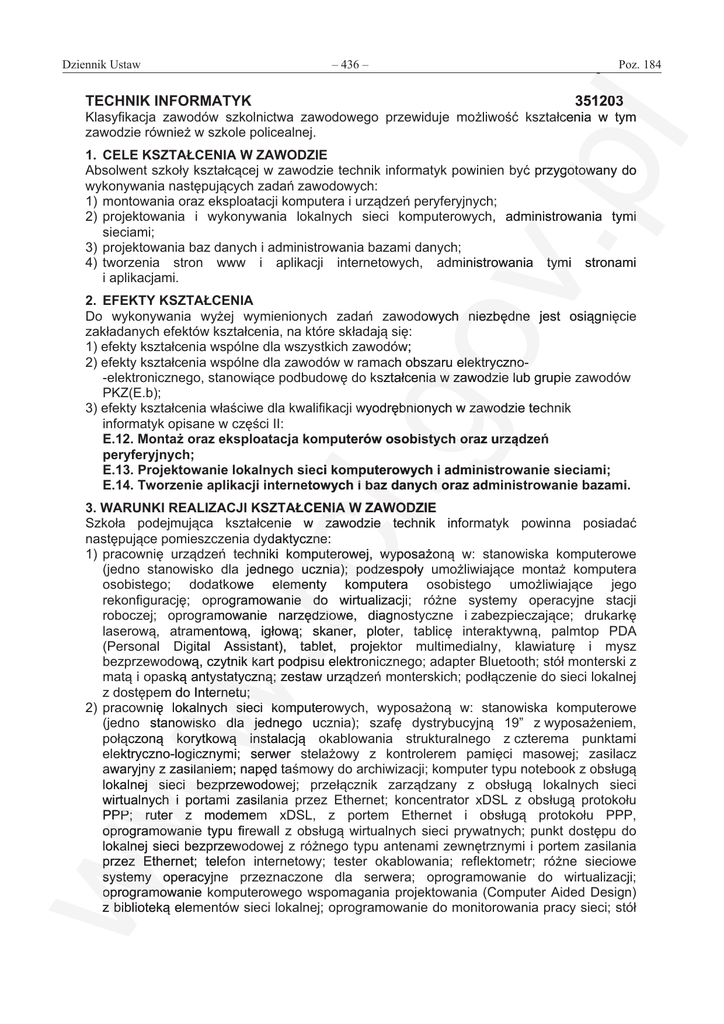 !"#$$"%&'()*+& ,&-./&,& TECHNIK INFORMATYK Poz. 184 351203 l.g ov .pl Klasyfikacja zawodów szkolnictwa zawodowego przewiduje mo liwo!" kszta#cenia cenia w tym zawodzie równie w szkole policealnej. 1. CELE KSZTA CENIA W ZAWODZIE Absolwent szko y kszta c!cej w zawodzie technik informatyk powinien by" " przygotowany do wykonywania nast#puj!cych zada$ zawodowych: 1) montowania oraz eksploatacji komputera i urz!dze$ peryferyjnych; 2) projektowania i wykonywania lokalnych sieci komputerowych, administrowania tymi sieciami; 3) projektowania baz danych i administrowania bazami danych; 4) tworzenia stron www i aplikacji internetowych, administrowania tymi stronami i aplikacjami. 2. EFEKTY KSZTA CENIA Do wykonywania wy%ej wymienionych zada$ zawodowych niezb# niezb#dne osi!gni#cie niezb #dne jest osi!gni osi zak adanych efektów kszta cenia, na które sk adaj! si#: 1) efekty kszta cenia wspólne dla wszystkich zawodów; 2) efekty kszta cenia wspólne dla zawodów w ramach obszaru elektryczno-elektronicznego, stanowi!ce podbudow# do kszta cenia w zawodzie lub grupie zawodów PKZ(E.b); 3) efekty kszta cenia w a&ciwe ciwe dla kwalifikacji wyodr#bnionych bnionych w zawodzie technik informatyk opisane w cz#&ci II: urz "dze E.12. Monta! oraz eksploatacja komputerów osobistych oraz urz" urz"dze# peryferyjnych; E.13. Projektowanie lokalnych sieci komputerowych i administrowanie sieciami; E.14. Tworzenie aplikacji internetowych i baz danych oraz administrowanie bazami. ww w. rc 3. WARUNKI REALIZACJI KSZTA CENIA W ZAWODZIE Szko a podejmuj!ca kszta cenie w zawodzie technik informatyk powinna posiada posiada" ce pomieszczenia dydaktyczne: nast#puj!ce wyposa 1) pracowni# urz!dze$ techniki komputerowej, wyposa%on wyposa%on! w: stanowiska komputerowe (jedno stanowisko dla jednego ucznia); podzespo y umo umo%liwiaj!ce monta% komputera osobistego; dodatkowe elementy komputera osobistego umo umo%liwiaj!ce jego rekonfiguracj#;; oprogramowanie do wirtualizacji; ró ró%ne systemy operacyjne stacji roboczej; oprogramowanie narz#dziowe, dziowe, diagnostyczne i zabezpieczaj zabezpieczaj!ce; drukark# atramentow !, ig ow!;; skaner, ploter, tablic laserow!,, atramentow! atramentow!, tablic# interaktywn!, palmtop PDA (Personal Digital Assistant), tablet, projektor multimedialny, klawiatur klawiatur# i mysz bezprzewodow!,, czytnik kart podpisu elektronicznego; adapter Bluetooth; stó monterski z antystatyczn! !; zestaw urz!dze urz mat! i opask! antystatyczn antystatyczn!; urz!dze$ monterskich; pod !czenie do sieci lokalnej pem do Internetu; z dost#pem 2) pracowni# lokalnych sieci komputerowych, wyposa wyposa%on! w: stanowiska komputerowe (jedno stanowisko dla jednego ucznia); szaf szaf# dystrybucyjn! 19” z wyposa%eniem, korytkow! ! instalacj instalacj! okablowania strukturalnego z czterema punktami po !czon! korytkow elektryczno-logicznymi; serwer stela stela%owy z kontrolerem pami#ci masowej; zasilacz awaryjny z zasilaniem; nap#d nap ta ta&mowy do archiwizacji; komputer typu notebook z obs ug! lokalnej sieci bezprzewodowej; prze !cznik zarz!dzany z obs ug! lokalnych sieci wirtualnych i portami zasilania przez Ethernet; koncentrator xDSL z obs ug! protoko u PPP; ruter z modemem xDSL, z portem Ethernet i obs ug! protoko u PPP, oprogramowanie typu firewall z obs ug! wirtualnych sieci prywatnych; punkt dost#pu do lokalnej sieci bezprzewodowej z ró ró%nego typu antenami zewn#trznymi i portem zasilania przez Ethernet; telefon internetowy; tester okablowania; reflektometr; ró ró%ne sieciowe systemy operacyjne przeznaczone dla serwera; oprogramowanie do wirtualizacji; oprogramowanie komputerowego wspomagania projektowania (Computer Aided Design) z bibliotek! bibliotek elementów sieci lokalnej; oprogramowanie do monitorowania pracy sieci; stó ! !"#$$"%&'()*+& ,&-./&,& Poz. 184 l.g ov .pl monterski z mat i opask antystatyczn ; zestaw narz!dzi monterskich; pod"#"czenie czenie do sieci lokalnej z dost!pem do Internetu; 3) pracowni! sieciowych systemów operacyjnych, wyposa#on w: stanowiska komputerowe (jedno stanowisko dla jednego ucznia); laptop lub notebook dla nauczyciela ne serwerowe systemy operacyjne z us#ugami us z oprogramowaniem do wirtualizacji; ró#ne us"ugami katalogowymi i internetowymi; serwerowe oprogramowanie typu firewall; oprogramowanie ów sieciowych; oprogramowanie do monitorowania pracy sieci; do analizy protoko"ów pod" czenie do sieci lokalnej z dost!pem do Internetu; 4) pracowni! aplikacji internetowych, wyposa#on w: stanowiska komputerowe (jedno stanowisko dla jednego ucznia); laptop lub notebook dla nauczyciela z oprogramowaniem do wirtualizacji; edytor WYSIWYG stron internetowych z mo liwo$ci" edycji liwo mo#liwo$ci zyka znaczników i kaskadowych arkuszy stylów, z mo liwo$ci" hipertekstowego j!zyka mo#liwo$ci walidacji strony; oprogramowanie do tworzenia grafiki i animacji, obróbki materia# materia #ów audio materia"ów i wideo; oprogramowanie serwera relacyjnej bazy danych z programami narz% narz %dziowymi; narz!dziowymi; oprogramowanie umo#liwiaj ce tworzenie aplikacji internetowych po stronie serwera zykach programowania; pod#"czenie i klienta w wybranych j!zykach pod" czenie do sieci lokalnej z dost dost!pem publikacj do Internetu; dost!p do serwera umo#liwiaj cego publikacj% publikacj! stron www i aplikacji % grupow grupow" ", komunikacj%, komunikacj internetowych; dost!p do portalu wspieraj cego prac% prac! komunikacj!, publikacj publikacj! wiadomo$ci i materia"ów. cenie w zawodzie technik informatyk j%zykiem jj!zykiem obcym W szkole prowadz cej kszta"cenie zyk angielski. ukierunkowanym zawodowo jest j!zyk Kszta"cenie praktyczne mo#e odbywa% si% si! w: pracowniach szkolnych, placówkach cenia ustawicznego, placówkach kszta#cenia cenia praktycznego oraz podmiotach kszta"cenia kszta"cenia szkó stanowi cych potencjalne miejsca zatrudnienia absolwentów szkó# szkó" kszta kszta"c cych w zawodzie. a organizuje praktyki zawodowe w podmiocie zapewniaj" zapewniaj"cym rzeczywiste warunki Szko"a 
