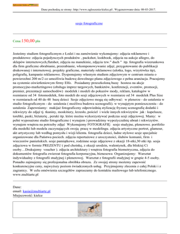 Dane pochodzą ze strony: http://www.ogloszenia-kielce.pl/. Wygenerowano dnia: 08-03-2017. sesje fotograficzne Cena:150,00 pln Jesteśmy studiem fotograficznym z Łodzi i na zamówienie wykonujemy: zdjęcia reklamowe i produktowe: zdjęcia pojedynczych produktów , packshot, lookbook, zdjęcia na aukcje allegro, do sklepów internetowych,flatshot, zdjęcia na manekinie, zdjęcia tzw." duch " itp. fotografia wizerunkowa dla firm graficzne obrabianie, przerabianie, wkomponowywanie zdjęć, przygotowanie do publikacji drukowanej i internetowej. projekty graficzne, materiały reklamowe (ulotka, logo, wizytówka itp), poligrafię, kampanie reklamowe. Dysponujemy własnym studiem zdjęciowym w centrum miasta o powierzchni 200 m/2 co umożliwia budowę dowolnego planu zdjęciowego z pełna aranżacja. Pracujemy na systemie oświetleniowym firmy Elfo. Posiadamy przeszkoloną bazę: hostess na akcje promocyjno-marketingowe (obsługa imprez targowych, bankietów, konferencji, eventów, promocji, premier, prezentacji samochodów) modelek i modeli do pokazów mody, reklam, katalogów w rozmiarze od 34 fotomodelek, foto modeli do sesji zdjęciowych w rozmiarze od 34 modelek Plus Size w rozmiarach od 40 do 48 bazę dzieci Sesje zdjęciowe mogą się odbywać: w plenerze - do ustalenia w studio fotograficznym - do ustalenia ( możliwa budowa scenografii). w wynajętym pomieszczeniu - do ustalenia Zapewniamy: makijaż fotograficzny odpowiednią stylizację fryzurę scenografię dodatki i rekwizyty do zdjęć tj. tkaniny, moskitiery, krzesło, pościel i wiele innych rekwizytów jak : kapelusze, torebki, paski, biżuterię , peruki itp. które można wykorzystywać podczas sesji zdjęciowej. Mamy: w pełni wyposażone studio fotograficzne ( wynajem ) prowadzimy wypożyczalnię ubrań i rekwizytów. wynajem wnętrza na potrzeby zdjęć Wykonujemy FOTOGRAFIĘ: sesje studyjne, plenerowe. portfolio dla modelki lub modela zaczynających swoją pracę w modelingu. zdjęcia artystyczne portret, glamour, akt artystyczny lub według pomysłu i wizji klienta. fotografia dzieci, ładne stylowe sesje specjalnie organizowane dla Państwa pociech. zdjęcia reportażowe z uroczystości, ślubów komunii, firm i wieczorów panieńskich. sesje pamiątkowe, rodzinne sesje zdjęciowe z okazji 18-stki,30 stki itp. sesja zdjęciowa w formie PREZENTU ( pod choinkę, z okazji urodzin, walentynek, dla bliskiej Ci osoby…Drukujemy voucher ). zdjęcia architektury i wnętrza fotografia biometryczna, zdjęcia do dokumentów fotografia zwierzat fotografia korporacyjna, biznesowa Organizujemy: Warsztat indywidualny z fotografii studyjnej i plenerowej. Warsztat z fotografii studyjnej w grupie 4-5 osoby. Ponadto zajmujemy się profesjonalna obróbka obrazu. Ze swojej strony możemy zapewnić konkurencyjne ceny, najwyższy poziom świadczonych usług. Przyjmujemy zlecenia z całej Polski i z zagranicy. W celu omówienia szczegółów zapraszamy do kontaktu mailowego lub telefonicznego. www.multiarte.pl Dane: email: [email protected] Miejscowość: kielce Dane pochodzą ze strony: http://www.ogloszenia-kielce.pl/. Wygenerowano dnia: 08-03-2017.