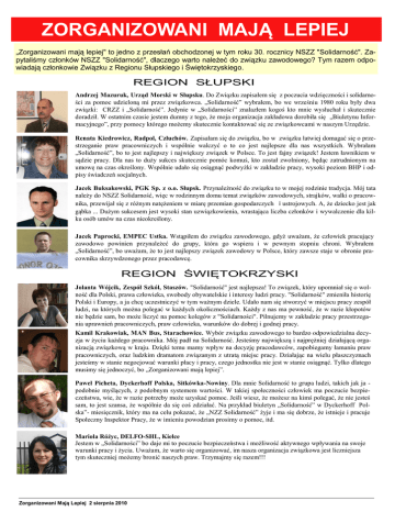 ZORGANIZOWANI MAJĄ LEPIEJ „Zorganizowani mają lepiej" to jedno z przesłań obchodzonej w tym roku 30. rocznicy NSZZ "Solidarność". Zapytaliśmy członków NSZZ "Solidarność", dlaczego warto należeć do związku zawodowego? Tym razem odpowiadają członkowie Związku z Regionu Słupskiego i Świętokrzyskiego. REGION SŁUPSKI Andrzej Mazuruk, Urząd Morski w Słupsku. Do Związku zapisałem się z poczucia wdzięczności i solidarności za pomoc udzieloną mi przez związkowca. „Solidarność” wybrałem, bo we wrześniu 1980 roku były dwa związki: CRZZ i „Solidarność”. Jedynie w „Solidarności” znalazłem kogoś kto mnie wysłuchał i skutecznie doradził. W ostatnim czasie jestem dumny z tego, że moja organizacja zakładowa dorobiła się „Biuletynu Informacyjnego”, przy pomocy którego możemy skutecznie kontaktować się ze związkowcami w naszym Urzędzie. Renata Kiedrowicz, Radpol, Człuchów. Zapisałam się do związku, bo w związku łatwiej domagać się o przestrzeganie praw pracowniczych i wspólnie walczyć o to co jest najlepsze dla nas wszystkich. Wybrałam „Solidarność”, bo to jest najlepszy i największy związek w Polsce. To jest fajny związek! Jestem ławnikiem w sądzie pracy. Dla nas to duży sukces skutecznie pomóc komuś, kto został zwolniony, będąc zatrudnionym na umowę na czas określony. Wspólnie udało się osiągnąć podwyżki w zakładzie pracy, wysoki poziom BHP i odpisy świadczeń socjalnych. Jacek Buksakowski, PGK Sp. z o.o. Słupsk. Przynależność do związku to w mojej rodzinie tradycja. Mój tata należy do NSZZ Solidarność, więc w rodzinnym domu temat związków zawodowych, strajków, walki o pracownika, przewijał się z różnym natężeniem w miarę przemian gospodarczych i ustrojowych. A, że dziecko jest jak gąbka ... Dużym sukcesem jest wysoki stan uzwiązkowienia, wrastająca liczba członków i wywalczenie dla kilku osób umów na czas nieokreślony. Jacek Paprocki, EMPEC Ustka. Wstąpiłem do związku zawodowego, gdyż uważam, że człowiek pracujący zawodowo powinien przynależeć do grupy, która go wspiera i w pewnym stopniu chroni. Wybrałem „Solidarność”, bo uważam, że to jest najlepszy związek zawodowy w Polsce, który zawsze staje w obronie pracownika skrzywdzonego przez pracodawcę. REGION ŚWIĘTOKRZYSKI Jolanta Wójcik, Zespół Szkół, Staszów. "Solidarność" jest najlepsza! To związek, który upomniał się o wolność dla Polski, prawa człowieka, swobody obywatelskie i interesy ludzi pracy. "Solidarność" zmieniła historię Polski i Europy, a ja chcę uczestniczyć w tym ważnym dziele. Udało nam się stworzyć w miejscu pracy zespół ludzi, na których można polegać w każdych okolicznościach. Każdy z nas ma pewność, że w razie kłopotów nie będzie sam, bo może liczyć na pomoc kolegów z "Solidarności". Pilnujemy w zakładzie pracy przestrzegania uprawnień pracowniczych, praw człowieka, warunków do dobrej i godnej pracy. Kamil Krakowiak, MAN Bus, Starachowice. Wybór związku zawodowego to bardzo odpowiedzialna decyzja w życiu każdego pracownika. Mój padł na Solidarność. Jesteśmy największą i najprężniej działającą organizacją związkową w kraju. Dzięki temu mamy wpływ na decyzję pracodawców, zapobiegamy łamaniu praw pracowniczych, oraz ludzkim dramatom związanym z utratą miejsc pracy. Działając na wielu płaszczyznach jesteśmy w stanie negocjować warunki płacy i pracy, czego jednostka nie jest w stanie osiągnąć. Tylko dlatego musimy się jednoczyć, bo „Zorganizowani mają lepiej”. Paweł Picheta, Dyckerhoff Polska, Sitkówka-Nowiny. Dla mnie Solidarność to grupa ludzi, takich jak ja podobnie myślących, z podobnym systemem wartości. W takiej społeczności człowiek ma poczucie bezpieczeństwa, wie, że w razie potrzeby może uzyskać pomoc. Jeśli wiesz, że możesz na kimś polegać, że nie jesteś sam, to jest szansa, że wspólnie da się coś zdziałać. Na przykład biuletyn „Solidarność” w Dyckerhoff Polska”- miesięcznik, który ma na celu pokazać, że „NZZ Solidarność” żyje i ma się dobrze, że istnieje i pracuje Społeczny Inspektor Pracy, że w imieniu powodzian prosimy o pomoc, itd. Mariola Różyc, DELFO-SHL, Kielce Jestem w „Solidarności” bo daje mi to poczucie bezpieczeństwa i możliwość aktywnego wpływania na swoje warunki pracy i życia. Uważam, że warto się organizować, im nasza organizacja związkowa jest liczniejsza tym skuteczniej możemy bronić naszych praw. Trzymajmy się razem!!! Zorganizowani Mają Lepiej 2 sierpnia 2010