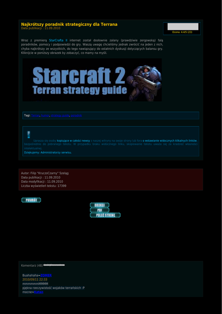 Najkrótszy poradnik strategiczny dla Terrana Data publikacji : 11.09.2010 Ocena: 4.4/5 (23) Wraz z premierą StarCrafta II internet został dosłownie zalany (prawdziwie zergowską) falą poradników, pomocy i podpowiedzi do gry. Waszą uwagę chcieliśmy jednak zwrócić na jeden z nich, chyba najkrótszy ze wszystkich, do tego nawiązujący do ostatnich dyskusji dotyczących balansu gry. Kliknijcie w poniższy obrazek by zobaczyć, co mamy na myśli. Tagi: Terran, humor, strategy guide, poradnik Uprasza się osoby kopiujące w całości newsy z naszej witryny na swoje strony lub fora o wstawianie widocznych klikalnych linków, bezpośrednio do pobranego tekstu. W przypadku braku widocznego linku, skopiowanie tekstu uważa się za kradzież własności intelektualnej. Dziękujemy: Administratorzy serwisu. Autor: Filip "KruczoCzarny" Szeląg Data publikacji : 11.09.2010 Data modyfikacji : 11.09.2010 Liczba wyświetleń tekstu: 17399 Komentarz (48) dodaj komentarz Buahahaha~ZOMER 2010/09/11 22:33 mmmmmmMMMM pjękna rzeczywistość wojaków terrańskich :P mocne~Katan 2010/09/11 22:34 Kurczę, najbardziej absurdalna wydaje mi się wspomniana kontra na Carriery. :D~vms 2010/09/11 22:36 to nie absurd, kupa marinów na stimpaku tak szybko zabije interceptory że carriery mogą tylko łeb w piasek schować~ krecik123 2010/09/11 22:39 nie pasuje tylko ze marudy sa kontra na carriery, mothershipa, vikingi reszta to prawda, jeszcze z kolos immo to moze byc problem dla mm~nozownik 2010/09/11 22:52 Krecik ma rację. Marines zniszczy interceptory zanim te w ogole zdolaja oddc strzal @@~Vargazz 2010/09/11 23:02 ehh przykre ale, prawdziwe ps. smialem sie przez LZY:(((((~Pmaker 2010/09/12 00:03 heh podpisuje się pod postem~LOGO 2010/09/12 00:12 Co do Protossów to też uważam, że na Mothershipa i Carriery Maruderzy mogą co najwyżej po pierdzieć. Jak już to sami Marines. Powiedziałbym z Goliatami, ale ich nie ma poza kampanią więc mogą być jeszcze Ghosty na Cloacku :P~fiwabar 2010/09/12 01:23 Co jak co ale mothership i carriery za mocne na mass marine - niewidzialność.~Razor 2010/09/12 01:43 Proste aż boli .... taka jest taktyka Terka~Jedien 2010/09/12 01:45 Heh, chciałbym żeby terek grał przeciwko moim kolosom i immortalom mariny i marudy.~Duppon 2010/09/12 02:26 No nie wiem z tymi carrierami. Trafił mi się przeciwnik, który zastosował "oldskoolowe" cannon + carrier. Moje trzy grupki hydralisków nie dały rady ośmiu carrierom - zostały zaganiane na śmierć. Skoro hyderki są silniejsze w porównaniu do jedynki, to jakoś nie widzę na ich miejscu marines - nawet w dwukrotnie większej liczbie.~Bor5uczka 2010/09/12 10:34 Ja mam jeszcze prostszy poradnik dla Terrana :) Mass Marines + Tank rush i GG ;D~SzRaPnEL 2010/09/12 11:04 vs Carriery + MS: Mariny ściągają Interceptory (z pomoca scannera z Orbital Command) a potem Mothershipa. Marudery robią za tanki/zbijają budynki (cannony na przykład). Da się tak zagrać terranem? Da się, chociaż ma on optymalniejszą strategię (dodać tam ravena i parę vikingów zamiast kilku maruderów).~KruczoCzarny Battlenet Network 2010/09/12 11:19 to o kazdej rasie mozna taki poradnik zrobic ;) ale faktycznie, usmialem sie, wiec +1~nagg 2010/09/12 12:32 KruczoCzarny, Nie wiem ile masz lat, ale na miłość Bożą, co Ty wyprawiasz z polskim językiem ?! :/ Optymalniejszie?! Pomijam już sam fakt, że "optymalne" jest przymiotnikiem NIESTOPNIOWALNYM. Ale jak coś może być BARDZIEJ optymalne i MNIEJ optymalne? Albo coś jest optymalne, albo nie jest. Jeżeli jakieś rozwiązanie jest "bardziej optymalne" od innego, to znaczy, że to poprzednie nie jest optymalne! Przepraszam najmocniej, że offtopuje, ale jak widzę co ludzie wyprawiają z naszym językiem, to aż serce się kraja...~maertin 2010/09/12 16:50 pan miodek atakuje :O~kosi 2010/09/12 17:02 100% prawda!~Omgzpwnd 2010/09/12 17:29 http://www.gamespot.com/greatest-video-game-villain/vote/battle-hub/index.html?battle_id=58 Głosujcie~rev678 2010/09/12 17:59 @maertin Zapraszam na serwisy miłośników poprawnej polszczyzny, gdzie zauważa się takie rzeczy. Jaki stanowisz pan autorytet aby wyskakiwać z tekstem "ile ty masz lat"? Rozumiem, że magister nauk humanistycznych może być zirytowany, że niema dla niego pracy w kraju jednak polecam nie wyżywać się na ludziach. Ewentualnie zapraszam tutaj - http://wisnia.wrzuta.pl/audio/6cSmDP3Q0cL/prof._jan_miodek_-_cyc~xrasnolud Battlenet Network 2010/09/12 18:32 tarson teraz: http://www.ustream.tv/glhf~Garik 2010/09/12 18:53 xrasnolud, Stojąc w jego obronie czerstwymi ripostami tylko zwiększasz żałość tej sytuacji. Na tak karygodne błędy będę zwracał uwagę wszędzie i zawsze. I nawet twoje śmieszne linki tego nie zmienią. Co trzeba było, zostało powiedziane.~maertin 2010/09/12 20:32 siema, ostatnio interesuje sie rapem ,znalazlem ciekawy hip hop z Poznania: http://w283.wrzuta.pl/audio/3XftBAUkzyN/ptc_squad_-_demony_poznania~Moono 2010/09/12 22:01 Zgadzam się z maertinem. Jestem po polibudzie, więc wykształcenie nie ma nic do rzeczy w tym momencie, a poprawność językowa obowiązuje wszystkich, nie tylko miłośników poprawnej polszczyzny. Szczególnie jak się jest redaktorem poważnego serwisu. Mylić się jest rzeczą ludzką, więc dlaczego zamiast na zwróconą uwagę zareagować pozytywnie i przyjąć do wiadomości fakt, którego się nie znało, odwracacie kota ogonem i bronicie się odbijając piłeczkę? Maertin mógł to zrobić łagodniej, więc rozumiem zdenerwowanie, ale koniec końców ma rację. "Najbardziej optymalny" to taka "większa połowa".~Ugm 2010/09/12 22:05 Zgadzam się z Ugm. Również jestem po PWR. Również miałem ochotę skomentować ten rażący błąd, zwłaszcza popełniony przez użytkownika należącego do grupy 'Redakcja', czyli osobę, której powinnością jest dbanie o poziom wypowiedzi na portalu. Tak jak napisał poprzednik - błądzić jest rzeczą ludzką, ale trzeba