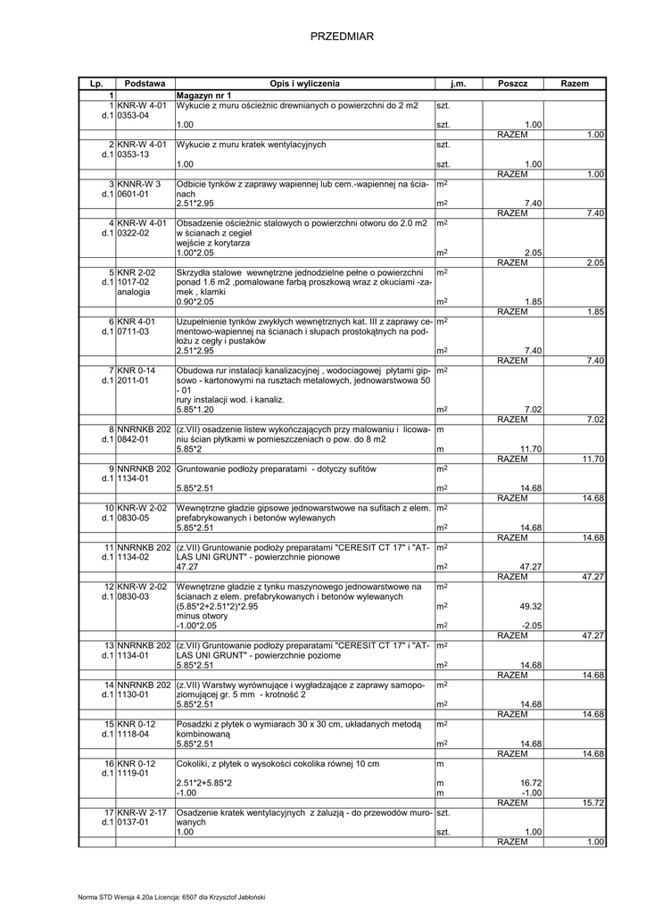 PRZEDMIAR Lp. Podstawa 1 1 KNR-W 4-01 d.1 0353-04 2 KNR-W 4-01 d.1 0353-13 3 KNNR-W 3 d.1 0601-01 4 KNR-W 4-01 d.1 0322-02 5 KNR 2-02 d.1 1017-02 analogia 6 KNR 4-01 d.1 0711-03 7 KNR 0-14 d.1 2011-01 Opis i wyliczenia Magazyn nr 1 Wykucie z muru ościeżnic drewnianych o powierzchni do 2 m2 j.m. szt. 1.00 szt. Wykucie z muru kratek wentylacyjnych szt. 1.00 szt. Odbicie tynków z zaprawy wapiennej lub cem.-wapiennej na ścia- m2 nach 2.51*2.95 m2 Obsadzenie ościeżnic stalowych o powierzchni otworu do 2.0 m2 w ścianach z cegieł wejście z korytarza 1.00*2.05 m2 Uzupełnienie tynków zwykłych wewnętrznych kat. III z zaprawy ce- m2 mentowo-wapiennej na ścianach i słupach prostokątnych na podłożu z cegły i pustaków 2.51*2.95 m2 Obudowa rur instalacji kanalizacyjnej , wodociagowej płytami gip- m2 sowo - kartonowymi na rusztach metalowych, jednowarstwowa 50 - 01 rury instalacji wod. i kanaliz. 5.85*1.20 m2 8 NNRNKB 202 (z.VII) osadzenie listew wykończających przy malowaniu i licowa- m d.1 0842-01 niu ścian płytkami w pomieszczeniach o pow. do 8 m2 5.85*2 m 10 KNR-W 2-02 d.1 0830-05 m2 Wewnętrzne gładzie gipsowe jednowarstwowe na sufitach z elem. m2 prefabrykowanych i betonów wylewanych 5.85*2.51 m2 Wewnętrzne gładzie z tynku maszynowego jednowarstwowe na ścianach z elem. prefabrykowanych i betonów wylewanych (5.85*2+2.51*2)*2.95 minus otwory -1.00*2.05 1.00 7.40 RAZEM 7.40 2.05 RAZEM 2.05 1.85 RAZEM 1.85 7.40 RAZEM 7.40 7.02 RAZEM 7.02 11.70 RAZEM 11.70 14.68 RAZEM 14.68 14.68 RAZEM 14.68 47.27 RAZEM 47.27 49.32 m2 -2.05 RAZEM 47.27 14.68 RAZEM 14.68 14.68 RAZEM 14.68 14.68 RAZEM 14.68 16.72 -1.00 RAZEM 15.72 1.00 RAZEM 1.00 m2 15 KNR 0-12 d.1 1118-04 Posadzki z płytek o wymiarach 30 x 30 cm, układanych metodą kombinowaną 5.85*2.51 m2 Cokoliki, z płytek o wysokości cokolika równej 10 cm m 2.51*2+5.85*2 -1.00 m m m2 m2 Osadzenie kratek wentylacyjnych z żaluzją - do przewodów muro- szt. wanych 1.00 szt. Norma STD Wersja 4.20a Licencja: 6507 dla Krzysztof Jabłoński 1.00 RAZEM m2 14 NNRNKB 202 (z.VII) Warstwy wyrównujące i wygładzające z zaprawy samopod.1 1130-01 ziomującej gr. 5 mm - krotność 2 5.85*2.51 17 KNR-W 2-17 d.1 0137-01 1.00 m2 13 NNRNKB 202 (z.VII) Gruntowanie podłoży preparatami "CERESIT CT 17" i "AT- m2 d.1 1134-01 LAS UNI GRUNT" - powierzchnie poziome 5.85*2.51 m2 16 KNR 0-12 d.1 1119-01 1.00 RAZEM m2 11 NNRNKB 202 (z.VII) Gruntowanie podłoży preparatami "CERESIT CT 17" i "AT- m2 d.1 1134-02 LAS UNI GRUNT" - powierzchnie pionowe 47.27 m2 12 KNR-W 2-02 d.1 0830-03 Razem m2 Skrzydła stalowe wewnętrzne jednodzielne pełne o powierzchni m2 ponad 1.6 m2 ,pomalowane farbą proszkową wraz z okuciami -zamek , klamki 0.90*2.05 m2 9 NNRNKB 202 Gruntowanie podłoży preparatami - dotyczy sufitów d.1 1134-01 5.85*2.51 Poszcz PRZEDMIAR Lp. Podstawa 18 KNR-W 2-02 d.1 1510-01 19 KNR-W 4-01 d.1 1206-02 20 KNR-W 4-03 d.1 0204-01 21 KNNR 5 d.1 0308-05 22 KNR 4-03 d.1 0606-02 23 KNNR 5 d.1 0306-02 2 24 KNR-W 4-01 d.2 0353-04 25 KNR-W 4-01 d.2 0353-13 26 KNNR-W 3 d.2 0601-01 27 KNR-W 4-01 d.2 0322-02 28 KNR 2-02 d.2 1017-02 analogia 29 KNR 4-01 d.2 0711-03 30 KNR 0-14 d.2 2011-01 Opis i wyliczenia Dwukrotne malowanie farbami emulsyjnymi powierzchni wewnętrznych - tynków gładkich bez gruntowania - sufit i ściany 5.85*2.51+(5.85*2+2.51*2)*1.45 j.m. m2 Dwukrotne malowanie farbami olejnymi starych tynków wewnętrz- m2 nych ścian bez szpachlowania 5.85*2.51+(5.85*2+2.51*2)*1.50 m2 Wymiana przewodów kabelkowych instalacji oświetleniowej o m łącznym przekroju żył do 7.5 mm2 na istniejącym podłożu z mocowaniem paskami lub klamerkami 22.00 m Gniazda instalacyjne wtyczkowe ze stykiem ochronnym bryzgosz- szt. czelne 2-biegunowe przykręcane o obciążalności do 16 A i przekroju przewodów do 2.5 - mm2 2.00 szt. 2.00 szt. Przełączniki podtynkowe w puszce instalacyjnej szt. 1.00 szt. Magazyn nr 2 Wykucie z muru ościeżnic drewnianych o powierzchni do 2 m2 szt. 1.00 szt. Wykucie z muru kratek wentylacyjnych szt. 2.00 szt. Odbicie tynków z zaprawy wapiennej lub cem.-wapiennej na ścia- m2 nach 2.50*2.95*3 m2 Obsadzenie ościeżnic stalowych o powierzchni otworu do 2.0 m2 w ścianach z cegieł wejście z korytarza 1.00*2.05 38.93 RAZEM 38.93 39.76 RAZEM 39.76 22.00 RAZEM 22.00 2.00 RAZEM 2.00 2.00 RAZEM 2.00 1.00 RAZEM 1.00 1.00 RAZEM 1.00 2.00 RAZEM 2.00 22.13 RAZEM 22.13 2.05 RAZEM 2.05 1.85 RAZEM 1.85 22.13 RAZEM 22.13 12.29 RAZEM 12.29 35.20 RAZEM 35.20 45.92 RAZEM 45.92 45.92 RAZEM 45.92 m2 m2 Skrzydła stalowe wewnętrzne jednodzielne pełne o powierzchni m2 ponad 1.6 m2 ,pomalowane farbą proszkową wraz z okuciami -zamek , klamki 0.90*2.05 m2 Uzupełnienie tynków zwykłych wewnętrznych kat. III z zaprawy ce- m2 mentowo-wapiennej na ścianach i słupach prostokątnych na podłożu z cegły i pustaków 2.50*2.95*3 m2 Obudowa rur instalacji kanalizacyjnej , wodociagowej płytami gip- m2 sowo - kartonowymi na rusztach metalowych, jednowarstwowa 50 - 01 rury instalacji wod. i kanaliz. 5.85*2.10 m2 32 NNRNKB 202 Gruntowanie podłoży preparatami - dotyczy sufitów d.2 1134-01 5.85*7.85 34 KNR-W 2-02 d.2 0830-03 Razem Wymiana opraw świetlówkowych z tworzyw sztucznych - 2x38 W szt. 31 NNRNKB 202 (z.VII) osadzenie listew wykończających przy malowaniu i licowa- m d.2 0842-01 niu ścian płytkami w pomieszczeniach o pow. do 8 m2 5.85*4+2.95*4 m 33 KNR-W 2-02 d.2 0830-05 Poszcz m2 m2 m2 Wewnętrzne gładzie gipsowe jednowarstwowe na sufitach z elem. m2 prefabrykowanych i betonów wylewanych 5.85*7.85 m2 Wewnętrzne gładzie z tynku maszynowego jednowarstwowe na ścianach z elem. prefabrykowanych i betonów wylewanych (5.85*2+7.85*2)*2.95 minus otwory -1.00*2.05 Norma STD Wersja 4.20a Licencja: 6507 dla Krzysztof Jabłoński m2 m2 80.83 m2 -2.05 PRZEDMIAR Lp. Podstawa Opis i wyliczenia j.m. 35 NNRNKB 202 (z.VII) Gruntowanie podłoży preparatami "CERESIT CT 17" i "AT- m2 d.2 1134-02 LAS UNI GRUNT" - powierzchnie pionowe poz.36 m2 36 NNRNKB 202 (z