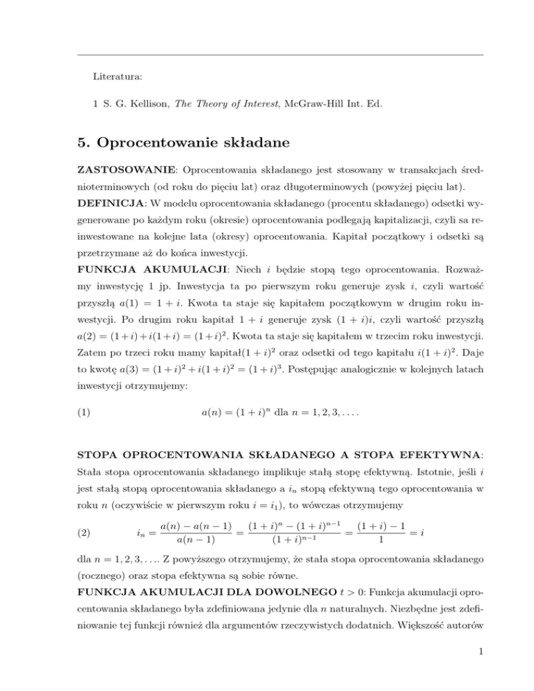 Literatura: 1 S. G. Kellison, The Theory of Interest, McGraw-Hill Int. Ed. 5. Oprocentowanie składane ZASTOSOWANIE: Oprocentowania składanego jest stosowany w transakcjach średnioterminowych (od roku do pięciu lat) oraz długoterminowych (powyżej pięciu lat). DEFINICJA: W modelu oprocentowania składanego (procentu składanego) odsetki wygenerowane po każdym roku (okresie) oprocentowania podlegają kapitalizacji, czyli sa reinwestowane na kolejne lata (okresy) oprocentowania. Kapitał początkowy i odsetki są przetrzymane aż do końca inwestycji. FUNKCJA AKUMULACJI: Niech i będzie stopą tego oprocentowania. Rozważmy inwestycję 1 jp. Inwestycja ta po pierwszym roku generuje zysk i, czyli wartość przyszłą a(1) = 1 + i. Kwota ta staje się kapitałem początkowym w drugim roku inwestycji. Po drugim roku kapitał 1 + i generuje zysk (1 + i)i, czyli wartość przyszłą a(2) = (1 + i) + i(1 + i) = (1 + i)2 . Kwota ta staje się kapitałem w trzecim roku inwestycji. Zatem po trzeci roku mamy kapitał(1 + i)2 oraz odsetki od tego kapitału i(1 + i)2 . Daje to kwotę a(3) = (1 + i)2 + i(1 + i)2 = (1 + i)3 . Postępując analogicznie w kolejnych latach inwestycji otrzymujemy: a(n) = (1 + i)n dla n = 1, 2, 3, . . . . (1) STOPA OPROCENTOWANIA SKŁADANEGO A STOPA EFEKTYWNA: Stała stopa oprocentowania składanego implikuje stałą stopę efektywną. Istotnie, jeśli i jest stałą stopą oprocentowania składanego a in stopą efektywną tego oprocentowania w roku n (oczywiście w pierwszym roku i = i1 ), to wówczas otrzymujemy (2) in = (1 + i) − 1 (1 + i)n − (1 + i)n−1 a(n) − a(n − 1) = = =i n−1 a(n − 1) (1 + i) 1 dla n = 1, 2, 3, . . .. Z powyższego otrzymujemy, że stała stopa oprocentowania składanego (rocznego) oraz stopa efektywna są sobie równe. FUNKCJA AKUMULACJI DLA DOWOLNEGO t > 0: Funkcja akumulacji oprocentowania składanego była zdefiniowana jedynie dla n naturalnych. Niezbędne jest zdefiniowanie tej funkcji również dla argumentów rzeczywistych dodatnich. Większość autorów 1 czyni to zakładając po prostu, że wzór (1) jest prawdziwy dla dowolnego t > 0, czyli (3) a(t) = (1 + i)t , dla t > 0. Istnieje jeszcze jedna metoda wyznaczania funkcji akumulacji po czasie t nie będącym całkowitą wielokrotności roku. Otóż niech t = n + k, gdzie n jest nieujemną liczbą całkowitą zaś k liczbą z przedziału [0, 1]. Korzystając z liniowej interpolacji pomiędzy (1 + i)n a (1 + i)n+1 otrzymujemy: (4) (1 + i)n+k = (1 − k)(1 + i)n + k(1 + i)n+1 = (1 + i)n [1 − k + k(1 + i)] = (1 + i)n (1 + ki). Widzimy, że ostatnie wyrażenie jest iloczynem funkcji akumulacji oprocentowania składanego (po czasie będącym całkowitą wielokrotnością roku) i prostego (w czasie ułamkowym). 2