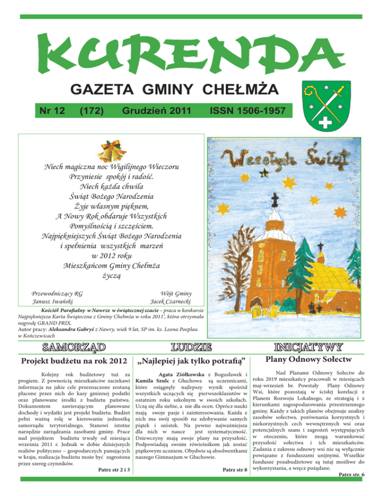 GAZETA GMINY CHEŁMŻA Nr 12 (172) Grudzień 2011 ISSN 1506-1957 Niech magiczna noc Wigilijnego Wieczoru Przyniesie spokój i radość. Niech każda chwila Świąt Bożego Narodzenia Żyje własnym pięknem, A Nowy Rok obdaruje Wszystkich Pomyślnością i szczęściem. Najpiękniejszych Świąt Bożego Narodzenia i spełnienia wszystkich marzeń w 2012 roku Mieszkańcom Gminy Chełmża życzą Przewodniczący RG Janusz Iwański Wójt Gminy Jacek Czarnecki Kościół Parafialny w Nawrze w świątecznej szacie – praca w konkursie Najpiękniejsza Karta Świąteczna z Gminy Chełmża w roku 2011’, która otrzymała nagrodę GRAND PRIX. Autor pracy: Aleksandra Gabryś z Nawry, wiek 9 lat, SP im. ks. Leona Poeplau w Kończewicach SAMORZĄD LUDZIE INICJATYWY Projekt budżetu na rok 2012 „Najlepiej jak tylko potrafią” Plany Odnowy Sołectw Kolejny rok budżetowy tuż za progiem. Z pewnością mieszkańców zaciekawi informacja na jakie cele przeznaczone zostaną płacone przez nich do kasy gminnej podatki oraz planowane środki z budżetu państwa. Dokumentem zawierającym planowane dochody i wydatki jest projekt budżetu. Budżet pełni ważną rolę w kierowaniu jednostką samorządu terytorialnego. Stanowi istotne narzędzie zarządzania zasobami gminy. Prace nad projektem budżetu trwały od miesiąca września 2011 r. Jednak w dobie dzisiejszych realiów polityczno – gospodarczych panujących w kraju, realizacja budżetu może być zagrożona przez szereg czynników. Patrz str 2 i 3 Agata Ziółkowska z Bogusławek i Kamila Szulc z Głuchowa są uczennicami, które osiągnęły najlepszy wynik spośród wszystkich uczących się pierwszoklasistów w ostatnim roku szkolnym w swoich szkołach. Uczą się dla siebie, a nie dla ocen. Oprócz nauki mają swoje pasje i zainteresowania. Każda z nich ma swój sposób na zdobywanie samych piątek i szóstek. Na pewno najważniejsza dla nich w nauce jest systematyczność. Dziewczyny mają swoje plany na przyszłość. Podpowiadają swoim rówieśnikom jak zostać piątkowym uczniem. Obydwie są absolwentkami naszego Gimnazjum w Głuchowie. Nad Planami Odnowy Sołectw do roku 2019 mieszkańcy pracowali w miesiącach maj-wrzesień br. Powstały Plany Odnowy Wsi, które pozostają w ścisłej korelacji z Planem Rozwoju Lokalnego, ze strategią i z kierunkami zagospodarowania przestrzennego gminy. Każdy z takich planów obejmuje analizy zasobów sołectwa, porównania korzystnych i niekorzystnych cech wewnętrznych wsi oraz potencjalnych szans i zagrożeń występujących w otoczeniu, które mogą warunkować przyszłość sołectwa i ich mieszkańców. Zadania z zakresu odnowy wsi nie są wyłącznie powiązane z funduszami unijnymi. Wszelkie fundusze pozabudżetowe są tutaj możliwe do Patrz str 8 wykorzystania, a wręcz pożądane. Patrz str. 6 Samorządowy serwis informacyjny BUDŻET 2012’ Wykonanie a zagrożenia O budżecie Gminy Chełmża na 2012 rok można śmiało powiedzieć, że jest budżetem ambitnym. Charakteryzuje go wysoki poziom dochodów i wydatków, przy którym nie przekracza się dopuszczalnych wskaźników zadłużenia. Nie jest możliwe dalsze zwiększanie poziomu wydatków bez znalezienia pokrycia dodatkowych odpowiednich środków na ten cel. Dlatego, aby wprowadzać do budżetu nowe zadania należy znaleźć dodatkowe dochody lub zrezygnować z jakichś zadań ujętych w proponowanym projekcie (np. zamiana zadań). Realizacja tak ambitnego budżetu może jednak być zagrożona przez szereg czynników, nie zawsze wynikających z działalności władz Gminy Chełmża. Podstawowe zagrożenie to niezrealizowanie dochodów – może wystąpić szereg czynników, które o tym zadecydują: a) korekta na początku 2012 r subwencji oświatowej wynikająca z rzeczywistej spadającej liczby uczniów wg danych z aktualnych sprawozdań b) korekta udziału Gminy w podatkach PIT i CIT – przyjęta do budżetu kwota jest szacowana i może okazać się, że Minister Finansów przeszacował prognozę i będzie korekta w dół c) niewykonanie niektórych dochodów zaplanowanych na wysokim poziomie np. wpływy z mandatów, wpływy z podatków (przyjęto wysoki (90%) wskaźnik ściągalności), wpływy ze sprzedaży mienia komunalnego (stagnacja na rynku), ograniczenie wpływów z dodatkowych źródeł dochodów (żwirownie) d) opóźnienia w przekazywaniu należnych gminie za zrealizowane projekty środków z Urzędu Marszałkowskiego (aktualnie opóźnienia sięgają ponad roku) e) gorszy niż planowany wynik budżetu Gminy osiągnięty w 2011, co oznacza mniej wolnych środków w 2012. Z drugiej strony zagrożeniem może być przekroczenie założonych wydatków. Należy się liczyć ze skutkami następujących zjawisk: a) ogólnokrajowe tendencje do wzrostu kosztów – wzrost cen paliw, energii, kosztów bankowych, spadek wartości złotówki, inflacja b) wzrost płacy minimalnej oraz obciążeń pracodawców (wyższe koszty pracy) c) przekroczenie w przetargach założonych cen kosztorysowych d) niekorzystny przebieg zimy powodujący przekroczenie planu wydatków na odśnieżanie, zwalczanie gołoledzi, naprawy wiosenne dróg e) wzrost wydatków na pomoc społeczną wskutek wzrostu liczby osób uprawnionych (gmina musi dać do należnych świadczeń swój udział). Odrębną grupę zagrożeń dla realizacji budżetu stanowią nieprzewidywalne na dziś działania rządu. Budżet Gminy Chełmża został zaprojektowany w oparciu o wskaźniki makroekonomiczne przekazane przez Ministerstwo Finansów na przełomie września i października br, Wówczas mówiło się o budżecie państwa opartym na 4% wzroście PKB w 2012 r. Ostatnie doniesienia przewidują przyjęcie wariantu budżetu centralnego, który zakłada wzrost PKB o 2,5%. To, jaki zostanie ostatecznie przyjęty budżet centralny będzie miało wpływ na budżety lokalne. Budżet Gminy Chełmża nie jest przygotowany na korektę w dół wskaźników, ponieważ powstaje wó
