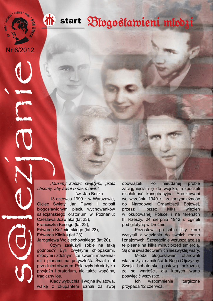 start Błogosławieni młodzi s@lezjanie Nr 6/2012 „Musimy zostać świętymi, jeżeli chcemy, aby świat o nas mówił.” św. Jan Bosko 13 czerwca 1999 r. w Warszawie, Ojciec Święty Jan Paweł II ogłosił błogosławionymi pięciu wychowanków salezjańskiego oratorium w Poznaniu: Czesława Jóźwiaka (lat 23), Franciszka Kęsego (lat 22), Edwarda Kaźmierskiego (lat 23), Edwarda Klinika (lat 23) Jarogniewa Wojciechowskiego (lat 20). Czym zasłużyli sobie na taką godność? Byli zwykłymi chłopakami, młodymi i zdolnymi, ze swoimi marzeniami i planami na przyszłość. Świat stał przed nimi otworem. Połączyły ich nie tylko przyjaźń i oratorium, ale także wspólny, tragiczny los. Kiedy wybuchła II wojna światowa, walkę z okupantem uznali za swój obowiązek. Po nieudanej próbie zaciągnięcia się do wojska, rozpoczęli działalność konspiracyjną. Aresztowani we wrześniu 1940 r. za przynależność do Narodowej Organizacji Bojowej, przeszli przez kilka więzień w okupowanej Polsce i na terenach III Rzeszy. 24 sierpnia 1942 r. zginęli pod gilotyną w Dreźnie. Pozostawili po sobie listy, które wysyłali z więzienia do swoich rodzin i znajomych. Szczególnie wzruszające są te pisane na kilka minut przed śmiercią. Są one świadectwem ich niezwykłej wiary. Młodzi błogosławieni ofiarowali własne życie z miłości do Boga i Ojczyzny. Swoją bohaterską postawą pokazują, że są wartości, dla których warto poświęcić wszystko. Ich wspomnienie liturgiczne przypada 12 czerwca. w sieci Kapłan - Dobry Pasterz „Salezjanów poznałem w Lutomiersku, w salezjańskiej Szkole Muzycznej II stopnia. Chciałem być organistą, lecz Bóg poprowadził mnie inną drogą. Salezjanie, których spotkałem podczas pobytu w szkole oraz na różnych spotkaniach w seminarium, w Łodzi, mieli ogromny wpływ na moje powołanie. Po zdaniu matury postanowiłem więc wstąpić do nowicjatu, aby dalej odkrywać i rozwijać swoje powołanie. Po kilku latach razem z moim współbratem i przyjacielem Karolem, złożyłem śluby wieczyste. On został salezjaninem koadiutorem (bratem zakonnym), a ja... 19 maja 2012 r. otrzymałem z rąk ks. bpa Ireneusza Pękalskiego święcenia kapłańskie. fot. Sebastian Smelkowski Moment święceń był dla mnie bardzo wzruszającym przeżyciem. Szczególnie, kiedy podczas litanii do wszystkich świętych leżałem w uniżeniu przed Jezusem i modliłem się o potrzebne dary i łaski. Najważniejszą jednak chwilą i nie mniej wzruszającą, było nałożenie przez księdza biskupa i kapłanów rąk na moją głowę oraz słowa konsekracji. Odczułem wówczas jedność i wspólnotę ze wszystkimi współbraćmi. Wdzięczny Bogu, rodzinie oraz młodzieży i wszystkim współbraciom salezjanom dziękuję za czas, który pozwolił mi wzrastać w tych wszystkich środowiskach. Zachęcam wszystkich młodych ludzi do zatrzymania i zastanowienia się nad swoim - Bożym - powołaniem oraz zapoznania się z księdzem Bosko, który nieustannie czeka i zaprasza wielu młodych do „swojego życia””. ks. Darek poznać ks. Bosko Dzieciństwo Jan Bosko przyszedł na świat 16 sierpnia 1815 r. Urodził się we Włoszech, w małej wiosce Becchi, obecnie Castelnuovo Don Bosco. W miejscu jego narodzin stoi teraz wspaniała Bazylika, w której, w dolnym kościele za ołtarzem umieszczono na pamiątkę portret i relikwie świętego. W dzień po narodzeniu Jan Malchior Bosko został ochrzczony w kościele pw. św. Andrzeja w Castelnuovo. Do dziś w świątyni znajduje się chrzcielnica, w której był chrzczony, a w archiwum parafialnym zachował się wpis umieszczony w księdze chrztów. Dom, w którym urodził się Jan Bosko już nie istnieje. Zachował się natomiast dom, który Franciszek Bosko, ojciec Janka nabył na własność trzy miesiące przed swoją śmiercią (maj 1817 r.). Janek mieszkał w nim od drugiego do szesnastego roku życia. Matusia Małgorzata przystosowała to miejsce do zamieszkania. Budynek pozostał do dzisiaj w nienaruszonym stanie, z wyjątkiem koniecznych konserwacji. Pomieszczenia są nieliczne i ubogie: obora, kuchnia, pokój mamy i babci, sypialnia dzieci (zwana też pokojem snu z dziewiątego roku życia), pomieszczenie na siano. newsy 5 maja, w Czerwińsku n/Wisłą ministranci z parafii salezjańskich inspektorii warszawskiej obchodzili święto swojego patrona - św. Dominika Savio. W uroczystościach uczestniczyło 160 osób z Ełku, Płocka, Kutna, Sępopola, Sokołowa Podlaskiego, Warszawy, Tolkmicka, Pogrodzia i Czerwińska. Spotkanie rozpoczęło się Eucharystią, sprawowaną w Sanktuarium Matki Bożej Pani Mazowsza. Po modlitwie zorganizowany został polecane Dominikalia konkurs wiedzy o św. Dominiku Savio, jak również odbyły się zawody sportowe. Rozegrany został turniej piłkarski, tenisa stołowego i koszykówki. Najlepszą drużyną piłkarską w kategorii ministranci młodsi (szkoła podstawowa) był Ełk, a w kategorii starszej (gimnazjum) - Płock. W turnieju koszykówki zwyciężył również Ełk, a nagrodę za postawę fair play w całym turnieju otrzymał Sokołów Podlaski. Komiks Komiks poświęcony błogosławionym męczennikom, wychowankom salezjańskiego oratorium w Poznaniu jest niezwykłą opowieścią o życiu i przygodach pięciu młodych przyjaciół, których losy brutalnie przerwała wojna... Campo Bosco www.piatkafilm.com/komiks-piatka-2-2 Już po raz XIX odbędzie się ogólnopolskie spotkanie młodzieży salezjańskiej Campo Bosco. W programie m.in. modlitwa, spotkania z ciekawymi ludźmi, koncerty i dużo zabawy. Wymagane ukończone 16 lat. Zapraszamy! 23-26 sierpnia 2012 Czerwińsk n/Wisłą Ośrodek Młodzieżowo-Powołaniowy „Emaus” ul. Klasztorna 23 09-150 Czerwińsk n/Wisłą e-mail: [email protected] www.emaus.salezjanie.pl Duszpasterstwo Powołań ks. Piotr Wyszyński sdb e-mail: [email protected] modlitwa Panie Jezu, który powołujesz tego, kogo zechcesz, naucz mnie odcz