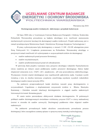 UCZELNIANE CENTRUM BADAWCZE ENERGETYKI I OCHRONY SRODOWISKA POLITECHNIKA VVARSZAVVSKA Warszawa maj 2010 Dezintegracja osad6w sciekowyc h - informa cja 0 projekcie badawczym Od lipca 2008 roku w Uczelnianym Centrum Badawczym Energetyki i Ochrony Srodowiska Politechniki Warszawskiej prowadzone s't badania okres laj'tce m.in. mozliwosc zastosowania mechanicznych wytwornic kawitacji do dezintegracji osadow sciekowych . Projekt realizowany jest w ramach przed s i~wzi~cia Ministerstwa Nauki i Szkolnictwa Wyzszego Inicjatywa Technologiczna I. W pracy wykorzystywane by-ty dezintegratory fLrm~ 0 mocach 11 kW i 30 kW udost~pnione przez Podwysocki S.J . Urzqdzenia przetestowano na Politechnice Warszawskiej okreslaj'tc w porcjowych testach mozliwosc ich wykorzystania w oczyszczalniach sciek6w do dezintegracji: • osad6w nadmiernych przed procesem fermentacji ; • osadow recyrkulowanych; • osadow przefermentowanych przed ich odwadnianiem. W pierwszej fazie projektu wykonano testy porcjowe okreslaj'tce wskainiki fizykochemiczne cieczy osadowej po r6Znym czasie poddawania osad6w procesowi dezintegracji. Zakres badan obejmowal oznaczenia m.in.: ChZ T, LKT, zasadowosci, pH oraz przewodnictwa elektrolitycznego . Wyznaczano rowniez stopien dezintegracji oraz wsp61czynnik up-tynnienia osadu. Uzyskane wyniki swiadc z't 0 tym, ze obydwa testowane urz'tdzenia umozliwiaj't uzyskanie wysokich wskainik6w dezintegracji osadow (nawet powyzej 40%) . Na podstawie przeprowadzonych badan okreslono warunki pracy dezintegrator6w w oczyszczalniach . Uzgodniono z eksploatatorami oczyszczalni sciek6w w Kamiennej i Ostr6dzie warunki Bloniu, Skartysku lokalizacji dezintegratorow w ciqgach osad6w nadmiernych kierowanych do kom6r fermentacyjnych. W czasie test6w potwierdzono efektywnosc dziabnia dezintegrator6w. W pobieranych pr6bkach osad6w dezintegrowanych stwierdzano wielokrotny przyrost ChZT w cieczy nadosadowej (wzrost w stosunku do osad6w surowych). Dezintegracji poddawano r6zne obj~tosci osad6w nadmiernych. Na pod stawie prowadzonych badan okres lono uwarunkowania prowadzenia procesu dezintegracji, ktore szczeg6lowo zostan't opisane w opracowywanej instrukcji technologicznej. Prof nz 'dr h8b. Zbigniew Heidnch I il:/~ l l1 i al1l: C~lltrlll11 f3achmot: [w.!rg.l.!l~kl NIP: "l'l-O()()-'lX- )-t. Id . (-tX 12) 112.- ,'-n 7A. i 11\: 1111,,111) ~roJ(\\\I~"a Lli. I~I\' . H,' 22) :-:2: xt) 64 N\I\\\\\\i .... hka .25. OO-M1) \\' ar.Zi\\\<J