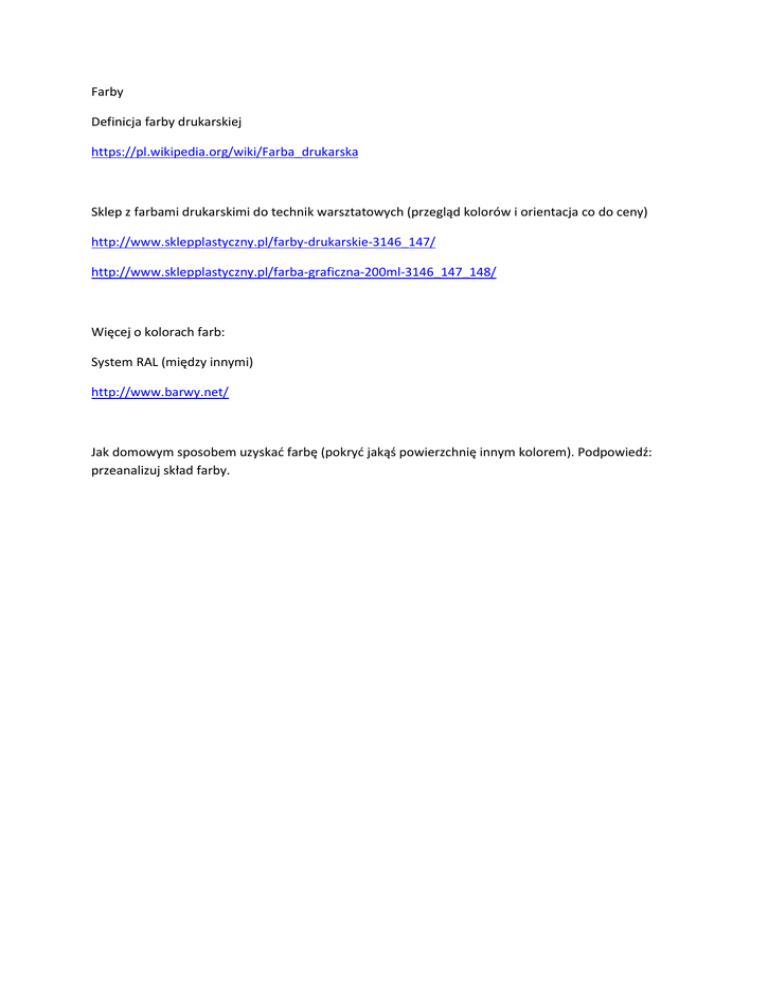 Farby Definicja farby drukarskiej https://pl.wikipedia.org/wiki/Farba_drukarska Sklep z farbami drukarskimi do technik warsztatowych (przegląd kolorów i orientacja co do ceny) http://www.sklepplastyczny.pl/farby-drukarskie-3146_147/ http://www.sklepplastyczny.pl/farba-graficzna-200ml-3146_147_148/ Więcej o kolorach farb: System RAL (między innymi) http://www.barwy.net/ Jak domowym sposobem uzyskać farbę (pokryć jakąś powierzchnię innym kolorem). Podpowiedź: przeanalizuj skład farby.