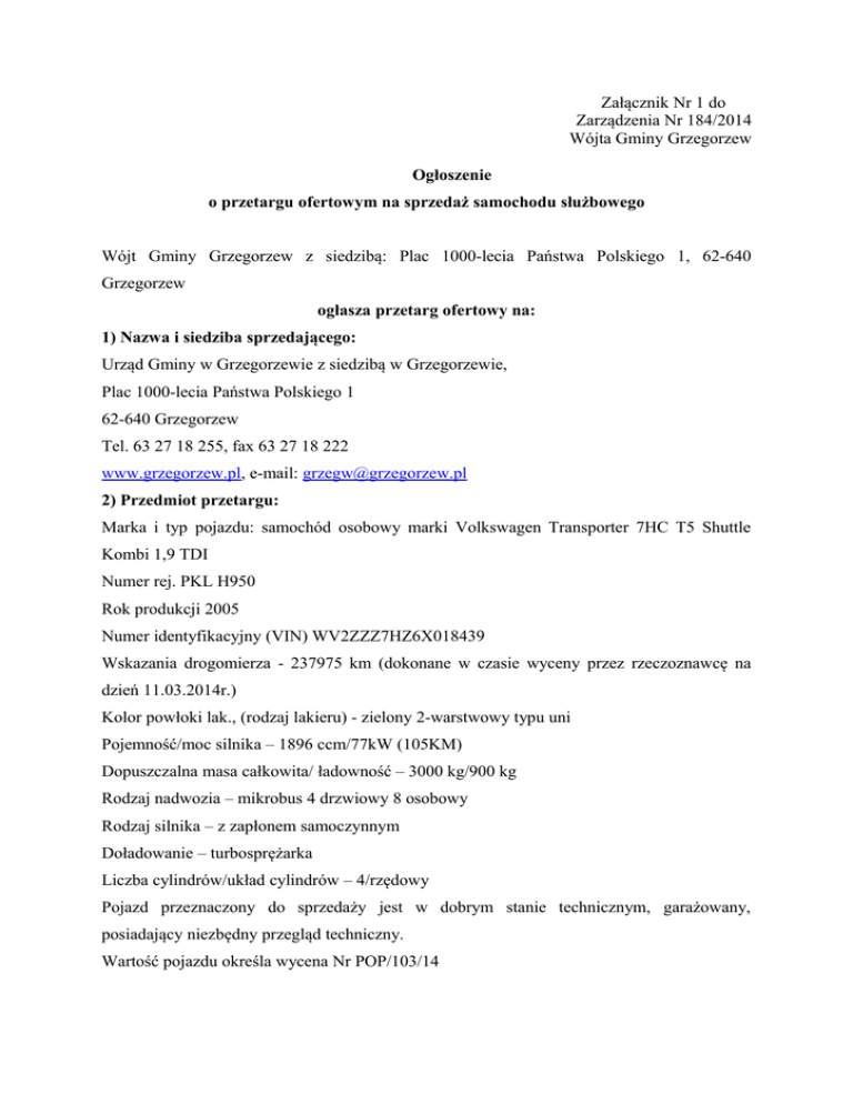 Załącznik Nr 1 do Zarządzenia Nr 184/2014 Wójta Gminy Grzegorzew Ogłoszenie o przetargu ofertowym na sprzedaż samochodu służbowego Wójt Gminy Grzegorzew z siedzibą: Plac 1000-lecia Państwa Polskiego 1, 62-640 Grzegorzew ogłasza przetarg ofertowy na: 1) Nazwa i siedziba sprzedającego: Urząd Gminy w Grzegorzewie z siedzibą w Grzegorzewie, Plac 1000-lecia Państwa Polskiego 1 62-640 Grzegorzew Tel. 63 27 18 255, fax 63 27 18 222 www.grzegorzew.pl, e-mail: [email protected] 2) Przedmiot przetargu: Marka i typ pojazdu: samochód osobowy marki Volkswagen Transporter 7HC T5 Shuttle Kombi 1,9 TDI Numer rej. PKL H950 Rok produkcji 2005 Numer identyfikacyjny (VIN) WV2ZZZ7HZ6X018439 Wskazania drogomierza - 237975 km (dokonane w czasie wyceny przez rzeczoznawcę na dzień 11.03.2014r.) Kolor powłoki lak., (rodzaj lakieru) - zielony 2-warstwowy typu uni Pojemność/moc silnika – 1896 ccm/77kW (105KM) Dopuszczalna masa całkowita/ ładowność – 3000 kg/900 kg Rodzaj nadwozia – mikrobus 4 drzwiowy 8 osobowy Rodzaj silnika – z zapłonem samoczynnym Doładowanie – turbosprężarka Liczba cylindrów/układ cylindrów – 4/rzędowy Pojazd przeznaczony do sprzedaży jest w dobrym stanie technicznym, garażowany, posiadający niezbędny przegląd techniczny. Wartość pojazdu określa wycena Nr POP/103/14 3) Tryb przetargu: Pisemny przetarg ofertowy. 4) Cena wywoławcza: Cenę wywoławczą ustalono w wysokości: 33 400,00 zł brutto (słownie: trzydzieści trzy tysiące czterysta złotych). 5) Termin i miejsce składania ofert. Ofertę należy złożyć do dnia 10 lipca 2014r. do 9.45 w zamkniętej kopercie, adresowanej według wzoru: Urząd Gminy w Grzegorzewie Plac 1000-lecia Państwa Polskiego 1 62-640 Grzegorzew „Oferta kupna samochodu marki Volkswagen Transporter – nie otwierać przed dniem 10 lipca 2014r. przed godz. 10.00” 6) Wymagania jakim powinna odpowiadać oferta w prowadzonym przetargu. Oferty s składane w języku polskim w formie pisemnej. Oferta musi zawierać: 1) imię i nazwisko oraz adres uczestnika przetargu będącego osobą fizyczną albo nazwę lub firmę oraz siedzibę, jeżeli uczestnikiem przetargu jest osoba prawna lub inny podmiot; 2) datę sporządzenia oferty; 3) oferowaną cenę, nie niższą niż cena wywoławcza; 4) oświadczenie oferenta, że znany jest mu stan techniczny przedmiotu przetargu, iż z tytułu ewentualnych wad ukrytych nie będzie wnosił roszczeń w stosunku w stosunku do Urzędu Gminy w Grzegorzewie, 5) oświadczenie o zapoznaniu się z regulaminem przeprowadzenia przetargu ofertowego pisemnego na sprzedaż samochodu służbowego Volkswagen Transporter i przyjęcie go bez zastrzeżeń, oraz załączniki: 6) dowód wpłaty wadium 7) aktualne zaświadczenie o wpisie do ewidencji działalności gospodarczej lub odpis aktualny z Rejestru przedsiębiorców prowadzonego przez Krajowy Rejestr Sadowy, gdy uczestnik przetargu jest przedsiębiorcą, a w pozostałym przypadku kserokopie dowodu osobistego, 8) oryginał lub kopie pełnomocnictwa poświadczoną za zgodność z oryginałem, jeżeli oferent działa przez pełnomocnika. Wzór formularza, na którym należy składać oferty jest w załączniku nr 1 do „Regulaminu przetargu ofertowego pisemnego, którego przedmiotem jest sprzedaż samochodu służbowego Volkswagen Transporter stanowiący własność Gminy Grzegorzew”. Oferta powinna być podpisana przez uczestnika. 7) Czas i miejsce otwarcia ofert. Otwarcie ofert nastąpi w dniu 10 lipca 2014r. o godz. 10.00 w siedzibie Sprzedającego. 8) Wysokość wadium. Przystępujący do przetargu winni okazać się dowodem wpłacenia wadium w wysokości 3 340,00 zł (słownie: trzy tysiące trzysta czterdzieści złotych). Wadium należy wnieść przelewem na konto Urzędu Gminy w Grzegorzewie nr 40 8543 0000 2007 7000 0260 0003 z dopiskiem na blankiecie przelewu „Wadium przetargowe na zakup samochodu marki Volkswagen Transporter 7HC T5 Shuttle Kombi 1,9 TDI nr rejestracyjny PKL H950 ” . 9) Miejsce i termin, w którym można obejrzeć zbywany oraz osoba, z którą można kontaktować się w sprawie przetargu. Zbywany pojazd można obejrzeć w obecności pracownika Urzędu Gminy w Grzegorzewie w dni powszednie w godzinach: 8:00 do 15:00 w terminie od dnia ogłoszenia przetargu do dnia 9 lipca 2014r. po wcześniejszym uzgodnieniu pod numerem telefonu 63 27 18 255. Szczegółowych informacji na temat: - przetargu - Katarzyna Fila inspektor ds. Rolnictwa, gospodarki gruntami i geodezji tel. 63 27 18 255 - pojazdu – Andrzej Badyński kierowca tel. 663 487 025 10) Regulamin Pozostałe warunki przetargu określone są w Regulaminie przetargu ofertowego pisemnego, którego przedmiotem jest sprzedaż samochodu służbowego Volkswagen Transporter stanowiący własność Gminy Grzegorzew stanowiący załącznik do niniejszego ogłoszenia. 10) Wzór umowy. Wzór umowy, która będzie zawarta z uczestnikiem wygrywającym przetarg, stanowi załącznik do regulaminu. Wójt Gminy Grzegorzew /-/ Bożena Dominiak