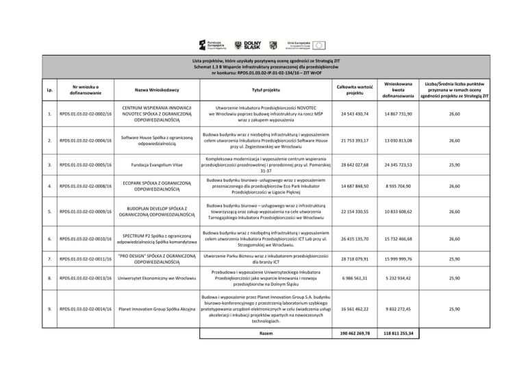 Lista projektów, które uzyskały pozytywną ocenę zgodności ze Strategią ZIT Schemat 1.3 B Wsparcie infrastruktury przeznaczonej dla przedsiębiorców nr konkursu: RPDS.01.03.02-IP.01-02-134/16 – ZIT WrOF Lp. Nr wniosku o dofinansowanie Nazwa Wnioskodawcy Tytuł projektu Całkowita wartość projektu Wnioskowana kwota dofinansowania Liczba/Średnia liczba punktów przyznana w ramach oceny zgodności projektu ze Strategią ZIT 1. RPDS.01.03.02-02-0002/16 CENTRUM WSPIERANIA INNOWACJI NOVOTEC SPÓŁKA Z OGRANICZONĄ ODPOWIEDZIALNOŚCIĄ Utworzenie Inkubatora Przedsiębiorczości NOVOTEC we Wrocławiu poprzez budowę infrastruktury na rzecz MŚP wraz z zakupem wyposażenia 24 543 430,74 14 867 731,90 26,60 2. RPDS.01.03.02-02-0004/16 Software House Spółka z ograniczoną odpowiedzialnością Budowa budynku wraz z niezbędną infrastrukturą i wyposażeniem celem utworzenia Inkubatora Przedsiębiorczości Software House przy ul. Żegiestowskiej we Wrocławiu 21 753 393,17 13 030 813,08 26,60 3. RPDS.01.03.02-02-0005/16 Fundacja Evangelium Vitae Kompleksowa modernizacja i wyposażenie centrum wspierania przedsiębiorczości prozdrowotnej i prorodzinnej przy ul. Pomorskiej 31-37 28 642 027,68 24 345 723,53 25,90 4. RPDS.01.03.02-02-0008/16 ECOPARK SPÓŁKA Z OGRANICZONĄ ODPOWIEDZIALNOŚCIĄ Budowa budynku biurowo- usługowego wraz z wyposażeniem przeznaczonego dla przedsiębiorców Eco Park Inkubator Przedsiębiorczości w Ligocie Pięknej 14 687 848,50 8 935 704,90 26,60 5. RPDS.01.03.02-02-0009/16 BUDOPLAN DEVELOP SPÓŁKA Z OGRANICZONĄ ODPOWIEDZIALNOŚCIĄ Budowa budynku biurowo – usługowego wraz z infrastrukturą towarzyszącą oraz zakup wyposażenia na cele utworzenia Tarnogajskiego Inkubatora Przedsiębiorczości we Wrocławiu 22 154 330,55 10 833 608,62 26,60 6. RPDS.01.03.02-02-0010/16 SPECTRUM P2 Spółka z ograniczoną odpowiedzialnością Spółka komandytowa Budowa budynku wraz z niezbędną infrastrukturą i wyposażeniem celem utworzenia Inkubatora Przedsiębiorczości ICT Lab przy ul. Strzegomskiej we Wrocławiu. 26 415 135,70 15 732 466,68 26,60 7. RPDS.01.03.02-02-0011/16 "PRO DESIGN" SPÓŁKA Z OGRANICZONĄ ODPOWIEDZIALNOŚCIĄ Utworzenie Parku Biznesu wraz z inkubatorem przedsiębiorczości dla branży ICT 28 718 079,91 15 999 999,76 25,90 8. RPDS.01.03.02-02-0013/16 Uniwersytet Ekonomiczny we Wrocławiu Przebudowa i wyposażenie Uniwersyteckiego Inkubatora Przedsiębiorczości jako wsparcie kreowania i rozwoju przedsiębiorstw na Dolnym Śląsku 6 986 561,31 5 232 934,42 25,90 Planet Innovation Group Spółka Akcyjna Budowa i wyposażenie przez Planet Innovation Group S.A. budynku biurowo-konferencyjnego z przestrzenią laboratorium szybkiego prototypowania urządzeń elektronicznych w celu świadczenia usługi akceleracji i inkubacji projektów opartych na nowoczesnych technologiach. 16 561 462,22 9 832 272,45 25,90 Razem 190 462 269,78 118 811 255,34 9. RPDS.01.03.02-02-0014/16
