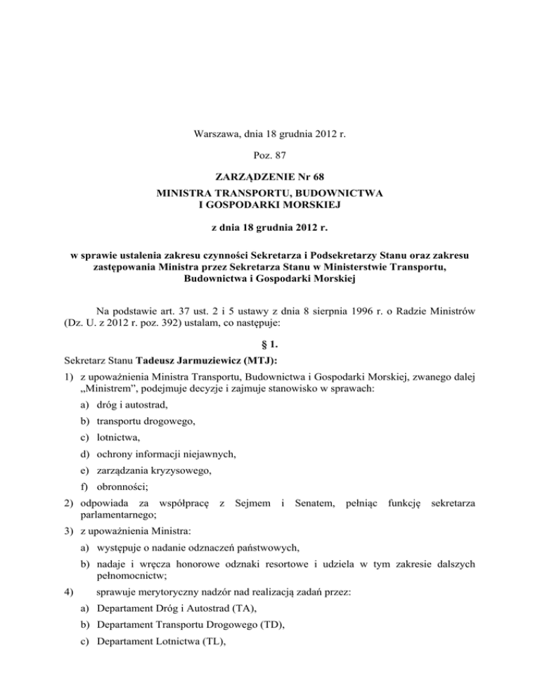 Warszawa, dnia 18 grudnia 2012 r. Poz. 87 ZARZĄDZENIE Nr 68 MINISTRA TRANSPORTU, BUDOWNICTWA I GOSPODARKI MORSKIEJ z dnia 18 grudnia 2012 r. w sprawie ustalenia zakresu czynności Sekretarza i Podsekretarzy Stanu oraz zakresu zastępowania Ministra przez Sekretarza Stanu w Ministerstwie Transportu, Budownictwa i Gospodarki Morskiej Na podstawie art. 37 ust. 2 i 5 ustawy z dnia 8 sierpnia 1996 r. o Radzie Ministrów (Dz. U. z 2012 r. poz. 392) ustalam, co następuje: § 1. Sekretarz Stanu Tadeusz Jarmuziewicz (MTJ): 1) z upoważnienia Ministra Transportu, Budownictwa i Gospodarki Morskiej, zwanego dalej „Ministrem”, podejmuje decyzje i zajmuje stanowisko w sprawach: a) dróg i autostrad, b) transportu drogowego, c) lotnictwa, d) ochrony informacji niejawnych, e) zarządzania kryzysowego, f) obronności; 2) odpowiada za współpracę z Sejmem i Senatem, pełniąc funkcję sekretarza parlamentarnego; 3) z upoważnienia Ministra: a) występuje o nadanie odznaczeń państwowych, b) nadaje i wręcza honorowe odznaki resortowe i udziela w tym zakresie dalszych pełnomocnictw; 4) sprawuje merytoryczny nadzór nad realizacją zadań przez: a) Departament Dróg i Autostrad (TA), b) Departament Transportu Drogowego (TD), c) Departament Lotnictwa (TL), d) Biuro Zarządzania Kryzysowego i Ochrony Informacji Niejawnych (BZK); 5) w imieniu Ministra sprawuje nadzór nad: a) Generalnym Dyrektorem Dróg Krajowych i Autostrad, b) Głównym Inspektorem Transportu Drogowego, c) Prezesem Urzędu Lotnictwa Cywilnego, d) Przedsiębiorstwem Państwowym „Porty Lotnicze”, e) Polską Agencją Żeglugi Powietrznej, f) Instytutem Transportu Samochodowego, g) Transportowym Dozorem Technicznym, h) Instytutem Badawczym Dróg i Mostów; 6) wykonuje zadania Ministra w stosunku do Państwowej Komisji Badania Wypadków Lotniczych. § 2. Podsekretarz Stanu Andrzej Massel (MAM): 1) z upoważnienia Ministra podejmuje decyzje i zajmuje stanowisko w sprawach kolejnictwa; 2) sprawuje merytoryczny nadzór nad realizacją zadań przez Departament Transportu Kolejowego (TK); 3) w imieniu Ministra sprawuje nadzór nad: a) Prezesem Urzędu Transportu Kolejowego, b) Instytutem Kolejnictwa; 4) wykonuje zadania Ministra w stosunku do Państwowej Komisji Badania Wypadków Kolejowych; 5) w imieniu Ministra reprezentuje Skarb Państwa w spółkach PKP SA i PKP PLK SA. § 3. Podsekretarz Stanu Maciej Jankowski (MMJ): 1) z upoważnienia Ministra podejmuje decyzje i zajmuje stanowisko w sprawach: a) polityki transportowej, b) współpracy z Unią Europejską i organizacjami międzynarodowymi; 2) odpowiada za: a) koordynację procesu wdrażania prawa Unii Europejskiej do polskiego systemu prawnego, b) koordynację działalności legislacyjnej w Ministerstwie Transportu, Budownictwa i Gospodarki Morskiej, zwanym dalej „Ministerstwem”; 3) sprawuje merytoryczny nadzór nad realizacją zadań przez: a) Departament Polityki Transportowej i Współpracy Międzynarodowej (TP), 2 b) Departament Prawny (DP); 4) reprezentuje Ministra w Komitecie do Spraw Europejskich oraz uczestniczy w posiedzeniach stałego komitetu Rady Ministrów. § 4. Podsekretarz Stanu Patrycja Wolińska-Bartkiewicz (MPW): 1) z upoważnienia Ministra: a) podejmuje decyzje i zajmuje stanowisko w sprawach: wykorzystania środków z funduszy UE, związanych z przygotowaniem i wykonywaniem budżetu państwa w częściach, których dysponentem jest Minister, b) pełni funkcję Sektorowego Urzędnika Zatwierdzającego dla projektów Funduszu Spójności 2004-2006 w sektorze transport, c) pełni funkcję Pełnomocnika ds. Realizacji Projektów Phare pozostających w kompetencji Ministra Transportu, Budownictwa i Gospodarki Morskiej; 2) wykonuje zadania Instytucji Pośredniczącej (IP) w zarządzaniu Funduszem Spójności 2004-2006; 3) wykonuje zadania Instytucji Pośredniczącej (IP) w zarządzaniu Sektorowym Programem Operacyjnym Transport (SPOT); 4) wykonuje zadania Instytucji Pośredniczącej (IP) dla priorytetów transportowych Programu Operacyjnego Infrastruktura i Środowisko (POIiŚ); 5) wykonuje zadania Instytucji Zarządzającej dla Funduszu TENT; 6) sprawuje merytoryczny nadzór nad realizacją zadań przez: a) Departament Funduszy UE (DF), b) Departament Budżetu (DB); 7) 8) uczestniczy w posiedzeniach Komitetu Rady Ministrów do spraw Cyfryzacji; prowadzi sprawy wynikające Transportowych Ministrowi. z podległości Centrum Unijnych Projektów § 5. Podsekretarz Stanu Anna Wypych – Namiotko (MAW): 1) z upoważnienia Ministra podejmuje decyzje i zajmuje stanowisko w sprawach gospodarki morskiej oraz żeglugi śródlądowej; 2) nadzoruje merytorycznie realizację zadań przez Departament Transportu Morskiego i Bezpieczeństwa Żeglugi (GT); 3) w imieniu Ministra sprawuje nadzór nad: a) Dyrektorami Urzędów Morskich, b) Dyrektorami Urzędów Żeglugi Śródlądowej, c) Akademią Morską w Gdyni, d) Akademią Morską w Szczecinie, 3 e) Instytutem Morskim w Gdańsku, f) Morską Służbą Poszukiwania i Ratownictwa, g) Izbą Morską w Gdańsku z siedzibą w Gdyni, h) Izbą Morską w Szczecinie, i) Odwoławczą Izbą Morską w Gdańsku z siedzibą w Gdyni; 4) wykonuje zadania Ministra w stosunku do Państwowej Komisji Badania Wypadków Morskich. § 6. Podsekretarz Stanu Piotr Styczeń (MPS): 1) 2) z upoważnienia Ministra podejmuje decyzje i zajmuje stanowisko w sprawach mieszkalnictwa i gospodarki nieruchomościami; sprawuje merytoryczny nadzór nad realizacją zadań przez: a) Departament Mieszkalnictwa (BS), b) Departament Gospodarki Nieruchomościami (BN). § 7. Podsekretarz Stanu Janusz Żbik (MJZ): 1) 2) z upoważnienia Ministra podejmuje decyzje i zajmuje stanowisko w sprawach planowania i zagospodarowania przestrzennego na poziomie lokalnym oraz budownictwa; sprawuje merytoryczny nadzór nad realizacją zadań przez: a) Departament Gospodarki Przestrzennej i Budownictwa (BP), b) Departament Orzecznictwa I (BO I), c) Departament Orzecznictwa II (BO II); 3) w i