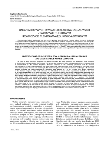 KOMPOZYTY (COMPOSITES) 2(2002)5 Magdalena Szutkowska1 Instytut Obróbki Skrawaniem, Zakład Inżynierii Materiałowej, ul. Wrocławska 37a, 30-011 Kraków Marek Boniecki2 Instytut Technologii Materiałów Elektronicznych, Zakład Unikalnych Metod Pomiarowych, ul. Wólczyńska 133, 01-919 Warszawa BADANIA KRZYWYCH R W MATERIAŁACH NARZĘDZIOWYCH - TWORZYWIE TLENKOWYM I KOMPOZYCIE TLENKOWO-WĘGLIKOWO-AZOTKOWYM Przedstawiono badania zachowania się krzywych R podczas kontrolowanego rozwoju pęknięć tworzywa tlenkowego i kompozytu tlenkowo-węglikowo-azotkowego (Al2O3+TiC+TiN). Zbiory punktów, otrzymane podczas pomiaru KI w funkcji długości pęknięcia, opisano równaniem prostej. Wielkość współczynnika kierunkowego prostej ma wpływ na zachowanie się krzywych R. Zmierzono parametry rozwoju pęknięć podkrytycznych n i log A, pracę pękania WOF, współczynnik intensywności naprężeń, przy którym rozpoczyna się rozwój pęknięć podkrytycznych KIi. Pomiary odporności na pękanie przeprowadzono na próbkach w kształcie belek o przekroju prostokątnym, z podwójnie naciętym karbem, poddanych trójpunktowemu statycznemu zginaniu. INVESTIGATIONS OF R-CURVES IN TOOL CERAMICS-ALUMINA CERAMICS AND OXIDE-CARBIDE-NITRIDE COMPOSITE In spite of many attractive properties of alumina ceramics the main drawbacks are brittleness, week resistance of thermal shock and subcritical crack extension. This fact can also be expressed in low resistance against crack extension, which is characterized by the fracture toughness. Fracture toughness is the commonly parameter used to measure the resistance to brittle crack propagation, but many tool ceramic materials exhibit R-curve behaviour in which the critical stress intensity factor increases with crack length. The fracture toughness and relations of Kr versus crack length c (R-curve) for alumina ceramics and oxide-carbide-nitride composite with addition of 2% wt. zirconia were tested. Behaviour of the fracture toughness with crack extension was determined by means of the experimental method on the basis of the three-point bending (3PB). These specimens with wide polished side surface and vacuum evaporated thin aluminium layer (about 150 nm thick) were notched. An initial 0.9 mm deep notch was produced by diamond saw (0.20 mm thick) and then the notch tip was sharpened manually a razor blade (0.025 mm thick) up to deep 1.1 mm. The controlled crack growth of specimens with double notch was carried with using Zwick testing machine with speed of 1 μm/min. The loading of the specimens has been broken at the moment of crack propagation. The procedure has been repeated many times up to obtaining definite increase of crack length. Individual stages of crack growth at given load has been observed on the computer screen. When the crack length (including length of double notch) has achieved value 2.5 mm the test has been interrupted. The observation of the controlled crack growth reveals the existence of increasing R-curve in the pure alumina ceramics. Addition of TiC-TiN with 2% wt. zirconia limits the occurrence of R-curve. It suggests disappearing of bridging mechanism responsible for appearance of R-curve. The investigations of subcritical crack growth have indicated two times greater fracture energy and slightly greater resistance to crack initiation for the oxide-carbide-nitride composite. WPROWADZENIE Wybór materiału narzędziowego, szczególnie w przy- padkach dokładnej i wysoko wydajnej obróbki, jest kompromisem pomiędzy materiałem o wysokiej i bardzo wysokiej odporności na ścieranie a jego ciągliwością. Do obróbki materiałów trudno obrabialnych, takich jak żeliwo, stal węglowa, stal ulepszana cieplnie, o twardości powyżej 50 HRC, stosuje się ceramiczne materiały narzędziowe, które zajmują ustabilizowaną już pozycję pod względem zakresu zastosowania oraz asortymentu gatunków. Ocenia się, że stanowią one ok. 9% wszystkich stosowanych materiałów narzędzio- 1 dr inż., 2 dr inż. wych. Najbardziej znaną i najstarszą grupę ceramicznych materiałów narzędziowych stanowi tworzywo tlenkowe, tzw. biała ceramika, bazująca na chemicznie i termicznie stabilnym tlenku glinu Al2O3, o odmianie krystalograficznej alfa, zwanej korundem. Tworzywo tlenkowe przeznaczone jest głównie do ciągłego toczenia stali węglowej i żeliwa szarego o twardości do 240 HB, w warunkach obróbki wykańczającej i średniodokładnej, z prędkościami skrawania do kilkuset m/min. Charakteryzuje się ona wysoką twardością (do 2000 HV10), wysoką wytrzymałością w temperaturach do 1473 K, odpornością na ścieranie oraz obojętnością Badania krzywych R w materiałach narzędziowych - tworzywie tlenkowym ... chemiczną względem obrabianych materiałów w temperaturze występującej na ostrzu. Ceramika mieszana, do której zalicza się kompozyt tlenkowo-węglikowo-azotkowy, dzięki dużej stabilności termodynamicznej, dużej twardości i wytrzymałości na ściskanie dodatków TiC/TiN ma znacznie lepsze właściwości skrawne od tworzywa tlenkowego. Z powodu małej rozszerzalności cieplnej i dobrej przewodności cieplnej wykazuje on znaczną odporność na szoki termiczne. Stosowanie ostrzy z kompozytu tlenkowo-węglikowo-azotkowego w obróbce skrawaniem umożliwia w wielu przypadkach zastąpienie operacji szlifowania i to przy niższych kosztach narzędzia i większej wydajności produkcji. Narzędzia te są stosowane do obróbki średniodokładnej i wykańczającej stali ulepszanej cieplnie, o podwyższonej twardości, oraz żeliwa modyfikowanego. Przy wielu zaletach spiekanych materiałów ceramicznych na bazie Al2O3 (takich jak odporność chemiczna, stabilność w atmosferze obojętnej i utleniającej, a także odporność na ścieranie, dostępność surowców, stosunkowo prosta i tania technologia) znaczna kruchość i zmęczenie cieplne ograniczają ich szersze zastosowanie w przemyśle narzędziowym. Ocena podatności na
