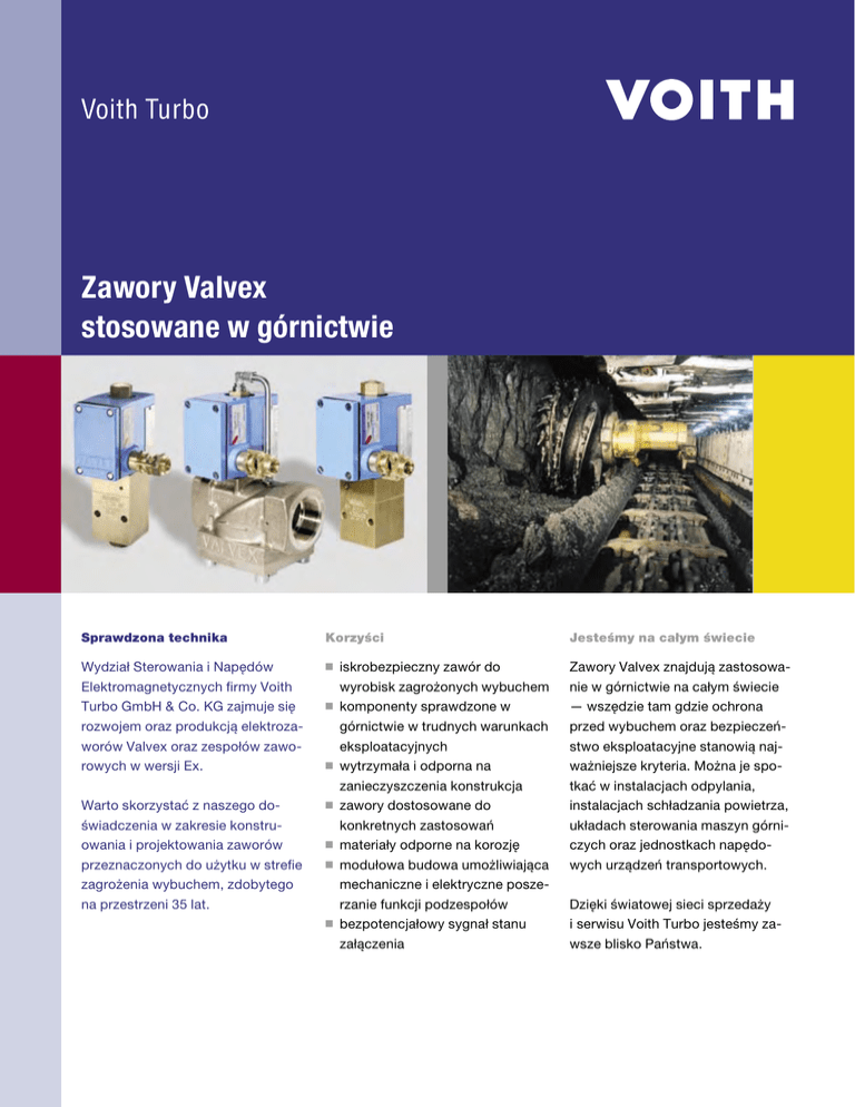 Zawory Valvex stosowane w górnictwie Sprawdzona technika Korzyści Wydział Sterowania i Napędów Elektromagnetycznych firmy Voith Turbo GmbH & Co. KG zajmuje się rozwojem oraz produkcją elektrozaworów Valvex oraz zespołów zaworowych w wersji Ex. ■ Warto skorzystać z naszego doświadczenia w zakresie konstruowania i projektowania zaworów przeznaczonych do użytku w strefie zagrożenia wybuchem, zdobytego na przestrzeni 35 lat. ■ ■ ■ ■ ■ ■ iskrobezpieczny zawór do wyrobisk zagrożonych wybuchem komponenty sprawdzone w górnictwie w trudnych warunkach eksploatacyjnych wytrzymała i odporna na zanieczyszczenia konstrukcja zawory dostosowane do konkretnych zastosowań materiały odporne na korozję modułowa budowa umożliwiająca mechaniczne i elektryczne poszerzanie funkcji podzespołów bezpotencjałowy sygnał stanu załączenia Jesteśmy na całym świecie Zawory Valvex znajdują zastosowanie w górnictwie na całym świecie — wszędzie tam gdzie ochrona przed wybuchem oraz bezpieczeństwo eksploatacyjne stanowią najważniejsze kryteria. Można je spotkać w instalacjach odpylania, instalacjach schładzania powietrza, układach sterowania maszyn górniczych oraz jednostkach napędowych urządzeń transportowych. Dzięki światowej sieci sprzedaży i serwisu Voith Turbo jesteśmy zawsze blisko Państwa. Elektrozawór 2/2-drogowy EV 2120 NC / NO Przeznaczenie ■ ■ sterowanie gazowymi i ciekłymi neutralnymi mediami w wyrobiskach zagrożonych wybuchem utrudnione warunki eksploatacji podziemnej z wysoką częstotliwością załączania, na przykład w instalacjach zraszania urządzeń strugowych i kruszarek Charakterystyka ■ ■ ■ ■ ■ ■ sterowany wewnętrznie zawór tłokowy, normalnie zamknięty (NC) lub normalnie otwarty (NO) styk sygnalizacji stanu załączenia zakres ciśnień do 80 bar wytrzymała konstrukcja zaworu odporny na skoki ciśnienia polecany szczególnie przy dużej częstotliwości załączania NC ■ ■ ■ ■ wykonany jako zawór blokowy montowany na płycie możliwość szeregowego podłączenia kilku zaworów na przewodzie zasilającym wykonanie jako zawór kołnierzowy z osobną płytą przyłączeniową (na zapytanie) Zawór obsługi ręcznej (na zapytanie) 128 A 67 192 40 P widok X ø25 ø9 A 52 A 12,5 71 X o-ring 19x3 90 120 42 72 42 5 60 10 12,5 90 60 38 P 129 R3/4“ P 44 ø11 ø19 128 NO 67 A R3/4“ 60 90 120 2 129 52 A 42 72 42 60 12,5 A X ø25 71 90 ø9 widok X 38 P P 44 ø11 ø19 12,5 40 199 P o-ring 19x3 5 10 Parametry techniczne EV 2120 NC / NO Zawór z napędem elektromagnetycznym Zasada działania zawór 2/2-drogowy, normalnie zamknięty(NC) lub normalnie otwarty (NO) Działanie sterowany wewnętrznie Zakres ciśnień NC od 0,5 do 80 bar NO od 0,5 do 15 bar Średnica nominalna 20 mm Współczynnik KV (woda) 110 l/min = 6,6 m3/h (pomiar przy 20°C i różnicy ciśnień 1 bar) Przyłącze przewodu płyta kołnierzowa, gwint wewnętrzny R 3/4“ Czasy załączania NC NO Atesty Otwieranie 600 ms Zamykanie sterowane ciśnieniem, eliminacja uderzeń wody Zamykanie 600 ms Otwieranie sterowane ciśnieniem, eliminacja uderzeń wody Różnica ciśnień min. 1,0 bar do pełnego otwarcia średnicy zaworu Ciężar 5,7 kg Materiał korpusu zaworu mosiądz Elementy wewnętrzne zaworu stal nierdzewna Materiały uszczelniające NBR, FPM (Viton) na zapytanie Media neutralne, gazowe lub ciekłe Temperatura medium maks. +80°C Temperatura otoczenia do +60°C Stopień ochrony IP 65 Sposób montażu dowolny, zalecany montaż napędu elektromagnetycznego pionowo do góry Napięcie znamionowe 12 VDC, -30%/+10% Pobór prądu 150 mA Rodzaj pracy praca ciągła, czas włączenia 100% Złącze elektryczne gwintowana złączka kablowa M20 x 1,5 lub złącze wtykowe PROMOS Moc załączalna styków pomocniczych 24 VDC, 1 A, bezpotencjałowe styki przekaźnikowe (zestyki przełączne) Materiał obudowy napędu elektromagnetycznego mosiądz ATEX Stopień ochrony „iskrobezpieczny“ IM2, EEx ib I, BVS 03 ATEX E 281 MSHA (Stany Zjednoczone) Intrinsic Safety Evaluation No. 18-ISA080003-0, Certification No. 18-NXA080001-0 SIMTARS (Australia) Ex ib I, IP 66, AUS Ex 02.2553X Inne atesty na zapytanie 3 Elektrozawór 2/2-drogowy EV 2132 NC Przeznaczenie ■ sterowanie gazowymi i ciekłymi neutralnymi mediami w wyrobiskach zagrożonych wybuchem ■ trudne warunki eksploatacyjne pod ziemią, przeznaczony w szczególności do podziemnych instalacji wodnych o dużym zanieczyszczeniu wody i niskich ciśnieniach zasilania, na przykład do sterowania sprzęgieł hydraulicznych w napędach przenośników taśmowych NC 134 A 67 P widok X 36 242 Charakterystyka ■ ■ ■ ■ ■ ■ 4 sterowany pneumatycznie zawór gniazdowy, normalnie zamknięty (NC) do otwarcia nie jest konieczna różnica ciśnień na gnieździe zaworu styk sygnalizacji stanu załączenia zakres ciśnień do 12 bar ciśnienie sterujące min. 3,5 bar wytrzymała konstrukcja zaworu ■ ■ ■ ■ odporny na zanieczyszczenia medium (z reguły woda) duża szybkość załączania budowa modułowa z osobną płytą kołnierzową wykonanie jako zawór kołnierzowy z osobną płytą przyłączeniową (na zapytanie) 72 42 ø4 2 ø3 ø42 2 ø3 125 125 150 192 51 25 25 51 P ø9 X 50 2 16,5 ø10 R1“ 61 P A R1/4“ 50 39 A ø32 R1“ sprężone powietrze ø3 86 116 ø13 sprężone powietrze o-ring 6x2 150 ø4 2 o-ring 32x5 Parametry techniczne EV 2132 NC Zawór z napędem elektromagnetycznym Zasada działania zawór 2/2-drogowy, normalnie zamknięty (NC) Działanie sterowany pneumatycznie Ciśnienie sterujące od 3,5 do 7 bar Zakres ciśnień od 0 do 12 bar Średnica nominalna 32 mm Współczynnik KV (woda) 260 l/min = 15,6 m3/h (pomiar przy 20°C i różnicy ciśnień 1 bar) Przyłącze przewodu płyta kołnierzowa, gwint wewnętrzny R 1“ Czasy załączania Atesty Otwieranie 600 ms Zamykanie 100 ms Przyłącze sprężonego powietrza R 1/4“ Ciężar zaworu 11,5 kg Ciężar płyty kołnierzowej 5,