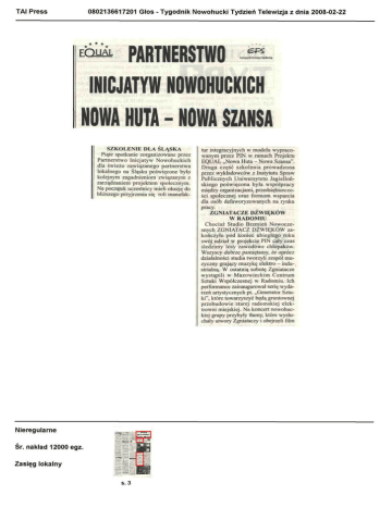 TAI Press 0802136617201 Głos - Tygodnik Nowohucki Tydzień Telewizja z dnia 2008-02-22 * ** PARTNERSTWO INICJATYW NOWOHUCKICH Europejski Funduv Snołeony NOWA HUTA - NOWA SZANSA SZKOLENIE DLA ŚLĄSKA Piąte spotkanie zorganizowane przez Partnerstwo Inicjatyw Nowohuckich dla świeżo zawiązanego partnerstwa lokalnego na Śląsku poświęcone było kolejnym zagadnieniom związanym z zarządzaniem projektem społecznym. Na początek uczestnicy mieli okazję do bliższego przyjrzenia się roli manufak- tur integracyjnych w modelu wypracowanym przez PIN w ramach Projektu EQUAL „Nowa Huta - Nowa Szansa". Druga część szkolenia prowadzona przez wykładowców z Instytutu Spraw Publicznych Uniwersytetu Jagiellońskiego poświęcona była współpracy między organizacjami, przedsiębiorczości społecznej oraz formom wsparcia dla osób defaworyzowanych na rynku pracy. ZGNIATACZE DŹWIĘKÓW W RADOMIU Chociaż Studio Brzmień Nowoczesnych ZGNIATACZ DŹWIĘKÓW zakończyło pod koniec ubiegłego roku swój udział w projekcie PIN cały czas śledzimy losy zawodowe chłopaków. Wszyscy dobrze pamiętamy, że oprócz działalności studia tworzyli zespół muzyczny grający muzykę elektro - indu-. strialną. W ostatnią sobotę Zgniatacze wystąpili w Mazowieckim Centrum Sztuki Współczesnej w Radomiu. Ich performance zainaugurował serię wydarzeń artystycznych pt. „Generator Sztuki", które towarzyszyć będą gruntownej przebudowie starej radomskiej elektrowni miejskiej. Na koncert nowohuckiej grupy przybyły tłumy, które wysłuchały utwory Zgniataczy i obejrzeli film Nieregularne Śr. nakład 12000egz. Zasięg lokalny s. 3 TAI Press 0802136617203 Głos - Tygodnik Nowohucki Tydzień Telewizja z dnia 2008-02-22 Nieregularne Śr. nakład 12000egz. KJ Zasięg lokalny s. 3 TAI Press 0802136617202 Głos - Tygodnik Nowohucki Tydzień Telewizja z dnia 2008-02-22 powstały podczas warsztatów u naszych francuskich partnerów w Redon. Oczywiście, jak na każdym koncercie chłopaków, nie obyło się bez bisowania. NOWft Nieregularne • IM Śr. nakład 12000egz. Zasięg lokalny s. 3 POKAZ MODY DZIANINOWEJ W NOWEJ HUCIE Ośrodek Kultury im. C. K. Norwida i Partnerstwo Inicjatyw Nowohuckich realizujące Projekt EQUAL „Nowa Huta - Nowa Szansa" zapraszają na pokaz unikatowych kreacji dziewiarskich. DZIANINOWE CUDA - autorskie kolekcje ubiorów - zaprezentują Pracownia Dziewiarstwa Artystycznego, Ma-Dra i znana pracownia Zuza Bart z Wrocławia. Podczas pokazu ogłosimy też wyniki II konkursu na dzianinę unikatową. Z koncertem wystąpi znany w Polsce i na świecie zespól Kroke. Pokaz odbędzie się w Teatrze Ludowym w niedzielę, 9 marca 2008 r. o godz. 17.00. Bezpłatne zaproszenia można będzie odbierać (w terminie, który podamy w kolejnym numerze Głosu) w Sali Tańca Ośrodka Kultury im. C. K. Norwida, os. Górali 4, tel. 012 644 38 98, 012 642 28 70. Promocyjny pokaz sfinansowano ze środków Europejskiego Funduszu Społecznego w ramach Inicjatywy Wspólnotowej EQUAL. Bezpośrednio po pokazie zapraszamy osoby zainteresowane udziałem w tworzącym się Stowarzyszeniu Dziewiarek do punktu informacyjnego w holu teatru.
