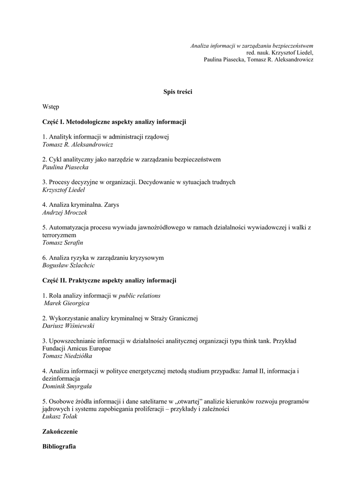 Analiza informacji w zarządzaniu bezpieczeństwem red. nauk. Krzysztof Liedel, Paulina Piasecka, Tomasz R. Aleksandrowicz Spis treści Wstęp Część I. Metodologiczne aspekty analizy informacji 1. Analityk informacji w administracji rządowej Tomasz R. Aleksandrowicz 2. Cykl analityczny jako narzędzie w zarządzaniu bezpieczeństwem Paulina Piasecka 3. Procesy decyzyjne w organizacji. Decydowanie w sytuacjach trudnych Krzysztof Liedel 4. Analiza kryminalna. Zarys Andrzej Mroczek 5. Automatyzacja procesu wywiadu jawnoźródłowego w ramach działalności wywiadowczej i walki z terroryzmem Tomasz Serafin 6. Analiza ryzyka w zarządzaniu kryzysowym Bogusław Szlachcic Część II. Praktyczne aspekty analizy informacji 1. Rola analizy informacji w public relations Marek Gieorgica 2. Wykorzystanie analizy kryminalnej w Straży Granicznej Dariusz Wiśniewski 3. Upowszechnianie informacji w działalności analitycznej organizacji typu think tank. Przykład Fundacji Amicus Europae Tomasz Niedziółka 4. Analiza informacji w polityce energetycznej metodą studium przypadku: Jamał II, informacja i dezinformacja Dominik Smyrgała 5. Osobowe źródła informacji i dane satelitarne w „otwartej” analizie kierunków rozwoju programów jądrowych i systemu zapobiegania proliferacji – przykłady i zależności Łukasz Tolak Zakończenie Bibliografia