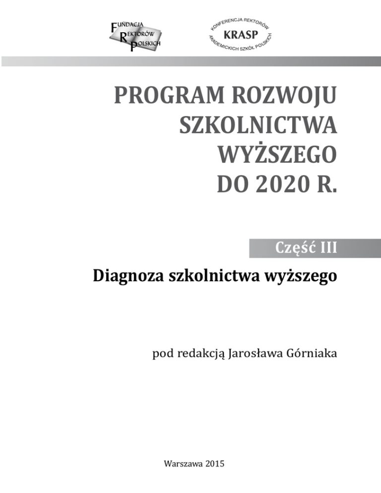 PROGRAM ROZWOJU SZKOLNICTWA WYŻSZEGO DO 2020 R. Część III Diagnoza szkolnictwa wyższego pod redakcją Jarosława Górniaka Warszawa 2015 Zespół wykonawców: mgr Patrycja Antosz, dr Agnieszka Chłoń-Domińczak, prof. Jarosław Górniak, dr Magdalena Jelonek, dr Marcin Kocór, prof. Andrzej Kraśniewski, dr Seweryn Krupnik, dr Jacek Lewicki, dr Piotr Prokopowicz, dr Adam Szot, prof. Urszula Sztanderska Cytowanie: Górniak J., red. (2015). Diagnoza szkolnictwa wyższego. Program rozwoju szkolnictwa wyższego do 2020 r. Część III, FRP, KRASP, Warszawa. Recenzent Prof. dr hab. Zbigniew Marciniak Fundacja Rektorów Polskich ul. Górnośląska 14 00-432 Warszawa Polska e-mail: [email protected] tel.: +22 621 09 72 faks: +22 621 09 73 Utwór w całości ani we fragmentach nie może być powielany, ani rozpowszechniany za pomocą urządzeń elektronicznych, mechanicznych, kopiujących, nagrywających i innych, bez pisemnej zgody posiadaczy praw autorskich. © Copyright by Fundacja Rektorów Polskich, Warszawa 2015 © Copyright by Konferencja Rektorów Akademickich Szkół Polskich, Warszawa 2015 ISBN 978-83-7583-619-6 Wydawnictwo SGGW, ul. Nowoursynowska 166, 02-787 Warszawa tel. 22 593 55 20 (-22, -25 – sprzedaż), fax 22 593 55 21 e-mail: [email protected] www.wydawnictwosggw.pl Druk i oprawa: Agencja Reklamowo-Wydawnicza A. Grzegorczyk, www.grzeg.com.pl Wydanie I, nakład: 600 egz. Projekt zrealizowany przez Fundację Rektorów Polskich w ramach Programu rozwoju szkolnictwa wyższego do 2020 r., na podstawie decyzji Zgromadzenia Plenarnego Konferencji Rektorów Akademickich Szkół Polskich z dnia 26 kwietnia 2013 r., sfinansowany przez uczelnie członkowskie KRASP (KRePSZ) Spis treści Przedmowa ........................................................................................................................................................... 9 Wstęp ....................................................................................................................................................................... 11 Streszczenie ......................................................................................................................................................... 13 Rozdział 1. Ogólne uwarunkowania sytuacji szkolnictwa wyższego w Polsce ..................................... 25 Jarosław Górniak 1.1. 1.2. 1.3. 1.4. Szkolnictwo wyższe w perspektywie cywilizacyjnej ............................................................. Innowacyjność i konkurencyjność gospodarki a szkolnictwo wyższe ........................... Sytuacja demograficzna a szkolnictwo wyższe ......................................................................... Uwagi końcowe ....................................................................................................................................... 25 30 33 36 Rozdział 2. Ramy prawne w procesie zmian w szkolnictwie wyższym .................................................... 37 Adam Szot 2.1. Wprowadzenie ......................................................................................................................................... 2.2. Polski system szkolnictwa wyższego – podstawy prawne .................................................. 2.3. Ramy prawne a wizja polskiego szkolnictwa wyższego ....................................................... 2.3.1. Powiązanie misji szkolnictwa wyższego z potrzebami społecznymi i gospodarczymi ...................................................................................................................... 2.3.2. Powszechność i jakość kształcenia ................................................................................. 2.3.3. Działalność naukowa i badawczo-rozwojowa uczelni ........................................... 2.3.4. Polityka kadrowa i ścieżki awansu naukowego ........................................................ 2.3.5. Obecność i pozycja polskiego szkolnictwa wyższego w świecie ....................... 2.3.6. Ład instytucjonalny ............................................................................................................... 2.3.7. Ustrój uczelni i reguły zarządcze .................................................................................... 2.3.8. Konsolidacja, konwergencja i transparentność systemu szkolnictwa wyższego ........................................................................................ 2.3.9. Zasady finansowania ............................................................................................................. 2.3.10. Zasady etyki zawodowej i dobre praktyki w działaniu uczelni .......................... 2.4. Uwagi końcowe ....................................................................................................................................... 37 38 39 40 42 45 46 49 50 50 51 52 52 53 Rozdział 3. Polskie szkoły wyższe w kontekście międzynarodowym ....................................................... 55 3.1. Międzynarodowe uwarunkowania działalności polskich uczelni .................................... 55 Agnieszka Chłoń-Domińczak 3.1.1. Proces boloński i jego wdrożenie .................................................................................... 55 3.1.2. Europejska Rama Kwalifikacji .......................................................................................... 59 3.1.3. Europejskie programy wspierania edukacji i mobilności w szkolnictwie wyższym ..................................................................................................... 61 6 Program rozwoju szkolnictwa wyższego do 2020 r. 3.2. Współpraca międzynarodowa polskich uczelni w zakresie kształcenia ....................... 63 Jacek Lewicki 3.3. Rankingi i oceny międzynarodowe ................................................................................................ 64 Jacek Lewicki 3.3.1. Pozycja polskich uczelni w rankingach między