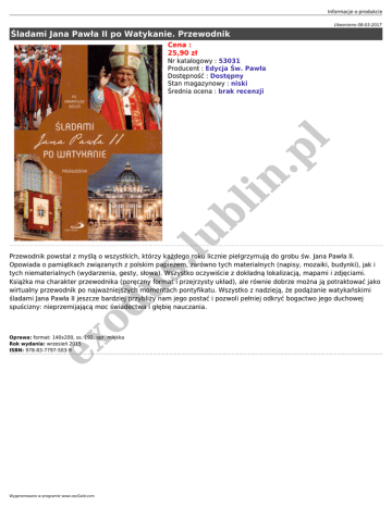 Informacje o produkcie Utworzono 08-03-2017 Śladami Jana Pawła II po Watykanie. Przewodnik Cena : 25,90 zł .lu bl in .p l Nr katalogowy : 53031 Producent : Edycja Św. Pawła Dostępność : Dostępny Stan magazynowy : niski Średnia ocena : brak recenzji od us Przewodnik powstał z myślą o wszystkich, którzy każdego roku licznie pielgrzymują do grobu św. Jana Pawła II. Opowiada o pamiątkach związanych z polskim papieżem, zarówno tych materialnych (napisy, mozaiki, budynki), jak i tych niematerialnych (wydarzenia, gesty, słowa). Wszystko oczywiście z dokładną lokalizacją, mapami i zdjęciami. Książka ma charakter przewodnika (poręczny format i przejrzysty układ), ale równie dobrze można ją potraktować jako wirtualny przewodnik po najważniejszych momentach pontyfikatu. Wszystko z nadzieją, że podążanie watykańskimi śladami Jana Pawła II jeszcze bardziej przybliży nam jego postać i pozwoli pełniej odkryć bogactwo jego duchowej spuścizny: nieprzemijającą moc świadectwa i głębię nauczania. ex Oprawa: format: 140x200, ss. 192, opr. miękka Rok wydania: wrzesień 2015 ISBN: 978-83-7797-503-9 Wygenerowano w programie www.oscGold.com