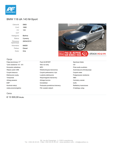 BMW 118 dA 143 M-Sport Odnonik 5965 Cm3 1995 CV 143 CO² Kategoria Status Pierwsza rejestracja Berline Uywany 28/04/2010 Kilometra 84600 Paliwo Diesel Kolor Gris Opcje Felgi aluminiowe 17" Pack M-SPORT Sportowe fotele Tylne siedzenie 1/3 - 2/3 Waz na narty CD Komputer pokadowy MP3 Prise audio auxiliaire Wejcie audio USB Wielofunkcyjna kierownica Automatyczna klimatyzacja Czujnik deszczu Czujnik parkowania z tylu Czujnik wiata Elektryczne szyby Lusterka elektryczne Podgrzewane siedzenia Tempomat Wspomaganie kierownicy ABS Airbag pasaera Airbags boczna Centralny zamek ESP Immobiliser Isofix Kontrola trakcji Poduszka powietrzna kierowcy Reflektory ksenonowe wiata przeciwmgielne Filtr czastek stalych Z katalogu uslug Cena € 13 500,00 Brutto 56, rue de Cessange - L-1320 Luxembourg Tel. +352 26 25 25 - Faks +352 26 25 26 22 - www.autofecc.com - [email protected]