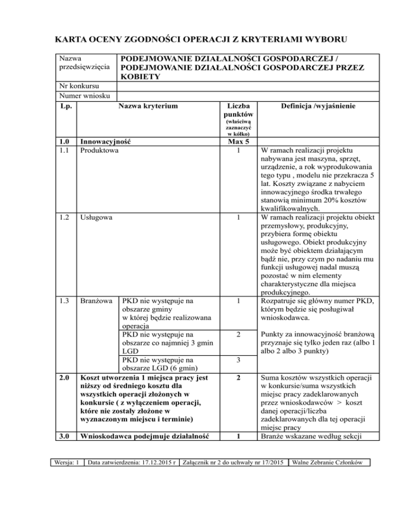 KARTA OCENY ZGODNOŚCI OPERACJI Z KRYTERIAMI WYBORU Nazwa przedsięwzięcia Nr konkursu Numer wniosku Lp. PODEJMOWANIE DZIAŁALNOŚCI GOSPODARCZEJ / PODEJMOWANIE DZIAŁALNOŚCI GOSPODARCZEJ PRZEZ KOBIETY Nazwa kryterium Liczba punktów Definicja /wyjaśnienie (właściwą zaznaczyć w kółko) 1.0 1.1 Innowacyjność Produktowa 1.2 Usługowa 1 1.3 Branżowa PKD nie występuje na obszarze gminy w której będzie realizowana operacja PKD nie występuje na obszarze co najmniej 3 gmin LGD PKD nie występuje na obszarze LGD (6 gmin) Koszt utworzenia 1 miejsca pracy jest niższy od średniego kosztu dla wszystkich operacji złożonych w konkursie ( z wyłączeniem operacji, które nie zostały złożone w wyznaczonym miejscu i terminie) 1 Wnioskodawca podejmuje działalność 1 2.0 3.0 Wersja: 1 Data zatwierdzenia: 17.12.2015 r Max 5 1 2 W ramach realizacji projektu nabywana jest maszyna, sprzęt, urządzenie, a rok wyprodukowania tego typu , modelu nie przekracza 5 lat. Koszty związane z nabyciem innowacyjnego środka trwałego stanowią minimum 20% kosztów kwalifikowalnych. W ramach realizacji projektu obiekt przemysłowy, produkcyjny, przybiera formę obiektu usługowego. Obiekt produkcyjny może być obiektem działającym bądź nie, przy czym po nadaniu mu funkcji usługowej nadal muszą pozostać w nim elementy charakterystyczne dla miejsca produkcyjnego. Rozpatruje się główny numer PKD, którym będzie się posługiwał wnioskodawca. Punkty za innowacyjność branżową przyznaje się tylko jeden raz (albo 1 albo 2 albo 3 punkty) 3 2 Suma kosztów wszystkich operacji w konkursie/suma wszystkich miejsc pracy zadeklarowanych przez wnioskodawców > koszt danej operacji/liczba zadeklarowanych dla tej operacji miejsc pracy Branże wskazane według sekcji Załącznik nr 2 do uchwały nr 17/2015 Walne Zebranie Członków w branży kluczowej dla rozwoju obszaru LSR zgodnie z nr sekcji PKD wskazanym w LSR 4.0 W ramach prowadzonej działalności gospodarczej planuje się sprzedaż usług i/lub produktów za pośrednictwem platformy internetowej 5.0 Wpływ operacji na ochronę środowiska i/lub przeciwdziałające zmianom klimatu 5.1 W budżecie operacji zaplanowano min. 5% środków na działania mające wpływ na ochronę środowiska i/lub przeciwdziałające zmianom klimatu 5.2 W budżecie operacji zaplanowano min. 50% środków na działania mające wpływ na ochronę środowiska i/lub przeciwdziałające zmianom klimatu 6.0 Udział procentowy wnioskowanej kwoty wsparcia w wielkości środków przeznaczonych na konkurs jest równy lub mniejszy udziałowi % wskaźnika produktu osiąganego przez operację w stosunku do wskaźnika zakładanego do osiągnięcia w konkursie 7.0 Udział procentowy wnioskowanej kwoty wsparcia w wielkości środków przeznaczonych na konkurs jest równy lub mniejszy udziałowi % wskaźnika rezultatu osiąganego przez operację w stosunku do wskaźnika zakładanego do osiągnięcia w konkursie 8.0 Wnioskodawca wnosi wkład własny w realizację operacji stanowiący: 8.1 minimum 5% wysokości premii 8.2 powyżej 10% wysokości premii 9.0 Operacja jest realizowana w miejscowości zamieszkałej poniżej: 9.1 5 000 mieszkańców 9.2 4 000 mieszkańców 9.3 2 000 mieszkańców 10.0 Promocja LGD 10.1 W budżecie operacji zaplanowano min. 0,5 % środków na działania informujące o przyznaniu wsparcia przez LGD w ramach Wersja: 1 Data zatwierdzenia: 17.12.2015 r 3 Max 3 2 PKD 2007 – Usługi związane z zakwaterowaniem i usługami gastronomicznymi (I), Działalność związana z kulturą, rozrywką i rekreacją (R), Handel hurtowy i detaliczny (G). Punkty są przyznawane na podstawie biznesplanu i budżetu, w którym wykazano, iż faktycznie taka sprzedaż będzie prowadzona. Punkty są przyznawane na podstawie budżetu oraz specyfikacji planowanego do zakupu sprzętu np. maszyny, urządzenia, zmniejszającego emisję trujących substancji do środowiska, o mniejszym zużyciu energii. 3 1 (wnioskowana kwota wsparcia / środki na konkurs) x 100% ≤ (wielkość wskaźnika produktu operacji / wielkość wskaźnika dla konkursu) x 100% 1 (wnioskowana kwota wsparcia / środki na konkurs) x 100% ≤ (wielkość wskaźnika rezultatu operacji / wielkość wskaźnika dla konkursu) x 100% Max 2 1 2 Max 3 1 2 3 Max 2 1 Wkład własny liczony jest od kosztów kwalifikowanych. Weryfikacja na podstawie bieżących danych gminnych wg złożonego oświadczenia. Punktacja przyznawana na podstawie wniosku. Przykładową formą promocji może być tablica informacyjna z nazwą i logiem Załącznik nr 2 do uchwały nr 17/2015 Walne Zebranie Członków LSR 10.2 W budżecie operacji zaplanowano powyżej 1 % środków na działania informujące o przyznaniu wsparcia przez LGD w ramach LSR 11.0 Wnioskodawca posiada doświadczenie i kwalifikacje i zasoby zgodne z zakresem planowej operacji 12.0 Wnioskodawca korzystał z doradztwa LGD 12.1 Telefonicznie lub w biurze LGD 12.2 Uczestniczył w spotkaniu o charakterze szkoleniowym z zakresu pozyskiwania środków z PROW 2014-2020 organizowanych przez LGD. 13.0 Złożony wniosek jest kompletny LGD. 2 1 Max 2 1 2 1 Punktacja przyznana na podstawie wniosku i załączonej dokumentacji. Punktacja przyznawana na podstawie rejestru osób, którym udzielono doradztwa oraz list obecności na szkoleniach organizowanych przez LGD. W przypadku szkolenia musi to być szkolenie odbywające się przed danym naborem wniosków. Wypełnione są poprawnie wszystkie pola wniosku i złożono wszystkie niezbędne załączniki SUMA PUNKTÓW Maksymalna liczba - 27 punktów Minimalna liczba, której uzyskanie jest warunkiem wyboru operacji – 30% Imię i nazwisko członka Rady Wersja: 1 Podpis na posiedzeniu Rady Data zatwierdzenia: 17.12.2015 r Data posiedzenia Załącznik nr 2 do uchwały nr 17/2015 Walne Zebranie Członków
