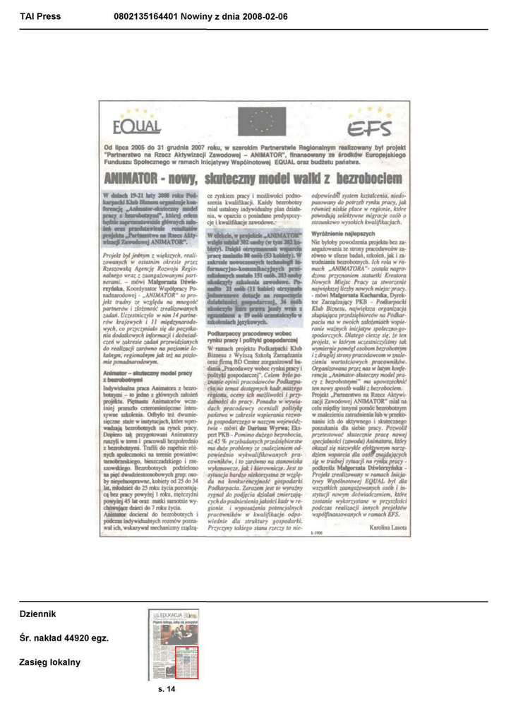 TAI Press 0802135164401 Nowiny z dnia 2008-02-06 FOLIAŁ Od lipca 2005 do 31 grudnia 2007 roku, w szerokim Partnerstwie Regionalnym realizowany był projekt "Partnerstwo na Rzecz Aktywizacji Zawodowej - ANIMATOR", finansowany ze środków Europejskiego Funduszu Społecznego w ramach Inicjatywy Wspólnotowej EOUAL oraz budżetu państwa. ANIMATOR - nowy, skuteczny model walki z bezrobociem 19-21 taty 2t«8 rolro PodBiznesu organizuje konferencje „Anmurtw-skuttcnij model pracy x bezrobotnymi". której cełem bedrie zajireMHtowaiiie głównych załoani onz pfBEoatnneBie muttatow projdrta J"irtnestwo M Rwcz AktyProjekt był jednym z większych, realizowanych w ostatnim okresie przez Rzeszowską Agencję Rozwoju Regionalnego wraz z zaangażowanymi partnerami. - mówi Małgorzata Diwierzyńska. Koordynator Współpracy Ponadnarodowej - „ANIMATOR" to projekt trudny ze względu na mnogość partnerów i zloionofć zrealizowanych zadań. Uczestniczyło w nim 14 partnerów krajowych i II międzynarodowych, co przyczyniało się do pozyskania dodatkowych informacji i doświadczeń w zakresie zadań przewidzianych do realizacji zarówno na poziomie lokalnym, regionalnym jak też na poziomie ponadnarodowym. Aninwtof — skuteczny model pracy Indywidualna pnca Animatora z bezrobotnymi - to jedno z głównych założeń projektu. Piętnastu Animatorów wcześniej przeszło czteromiesięczne intensywne szkolenia. Odbyło też dwumiesięczne staże w instytucjach, które wprowadzają bezrobotnych na rynek pracy. Dopiero tak przygotowani Animatorzy ruszyli w teren i pracowali bezpośrednio z bezrobotnymi. Trafili do zupełnie różnych społeczności na terenie powiatów: tarnobrzeskiego, bieszczadzkiego i rzeszowskiego Bezrobotnych podzielono na piec dwudziestoosobowych grup: osoby niepełnosprawne, kobiety od 25 do 34 lat, młodzież do 25 roku życia pozostającą bez pracy powyżej l roku, mężczyźni powyżej 45 lat oraz matki samotnie wychowujące dzieci do 7 roku życia. Animator docierał do bezrobotnych i podczas indywidualnych rozmów poznawał ich, wskazywał mechanizmy rządzą- Dziennik •.";, EDUKACJA | •, |r« aTd Śr. nakład 44920 egz. Zasięg lokalny s. 14 ce rynkiem pracy i możliwości podnoszenia kwalifikacji. Każdy bezrobotny miał ustalony indywidualny plan działania, w oparciu o posiadane predyspozycje i kwalifikacje zawodowe.' odpowiedni system kształcenia, niedopasowany do potrzeb rynku pracy, jak również niskie place w regionie, które powodują selektywne migracje osób o stosunkowo wysokich kwalifikacjach. W efekcie, w projekcie „ANIMATOR" wdetoodiW 302 omby (w t]«2t2 kobiety), LWekl otiijaiun.il mparcta prace matołów MD* (53 kobiety), W utratę nowocnanych Udamalogl htrormacyjno-komimllucyJBjscfc pra111 iniih TT n«iln Po31 wób(U kobiet) otrzymało dotacje M Wyróżnienie najlepszych Nie byłoby powodzenia projektu bez zaangażowania ze strony pracodawców zarówno w sferze badań, szkoleń, jak i zatrudniania bezrobotnych. Ich rola w ramach „ANIMATORA"- została nagrodzona przyznaniem statuetki Kreatora Nowych Miejsc Pracy za stworzenie największej liczby nowych miejscpracy. - mówi Małgorzata Kucharska, Dyrektor Zarządzający PKB - Podkarpacki Klub Biznesu, największa organizacja skupiająca przedsiębiorców na Podkarpaciu ma w swoich założeniach wspieranie ważnych inicjatyw spoleczno-gospodarczych. Dlatego cieszę się, że ten projekt, w którym uczestniczyliśmy tak wymiemie pomógł osobom bezrobotnym i z drugiej strony pracodawcom w znalezieniu wartościowych pracowników. Organizowana przez nas w lutym konferencja „Animator-skuteczny model pracy z bezrobotnymi" ma upowszechnić ten nowy sposób walki z bezrobociem. Projekt „Partnerstwo na Rzecz Aktywizacji Zawodowej ANIMATOR" miał na celu miedzy innymi pomóc bezrobotnym w znalezieniu zatrudnienia lub w przekonaniu ich do aktywnego i skutecznego poszukania dla siebie pracy. Pozwolił przetestować skutecznie pracę nowej specjalności (zawodu) Animatora, który okazał się niezwykle efektywnym narzędziem wsparcia dla osof znajdujących s(f w trudnej sytuacji na rynku pracy podkreśla Małgorzata Dżwierzyńska Projekt zrealizowany w ramach Inicjatywy Wspólnotowej EQVAL był dla wszystkich zaangażowanych osób i instytucji nowym doświadczeniem, które zostanie wykorzystane w przyszłości podczas realizacji innych projektów wspótfuiansowanych w ramach EFS. , okoóczylo tatra praw* jaidy wraz z egzaminem a 99 OBOP m H'§tiiiii.yto w szkoteniach językowych. rynku pracy l polityki j W ramach projektu Podkarpacki Klub Biznesu z Wyższą Szkolą 7*rnflinma oraz firmą BD Center zorganizował badania „Pracodawcy wobec rynku pracy i polityki gospodarczej". Celem było poznanie opinii pracodawców Podkarpacia na temat dostępnych kadr naszego regionu, oceny kh możliwości i przydatności do pracy. Ponadto w wywiadach pracodawcy oceniali politykę państwa w zakresie wspierania rozwoju gospodarczego w naszym województwie - mówi dr Dariusz Wyrwa; Ekspert PKB - Pomimo dużego bezrobocia, aż 45% przebadanych przedsiębiorstw ma duże problemy ze znalezieniem odpowiednio wykwalifikowanych pracowników, i to zarówno na stanowiska wykonawcze, jak i kierownicze. Jest to sytuacja bardzo niekorzystna Zf względu na konkurencyjność gospodarki Podkarpacia. Zarazem jest to wyraźny sygnał do podjęcia dzialań zmierzających do podniesienia jakości kadr w regionie i wyposażenia potencjalnych pracowników w kwalifikacje odpowiednie dla struktury gospodarki. Przyczyny takiego stanu rzeczy to nie- Karolina Lasota