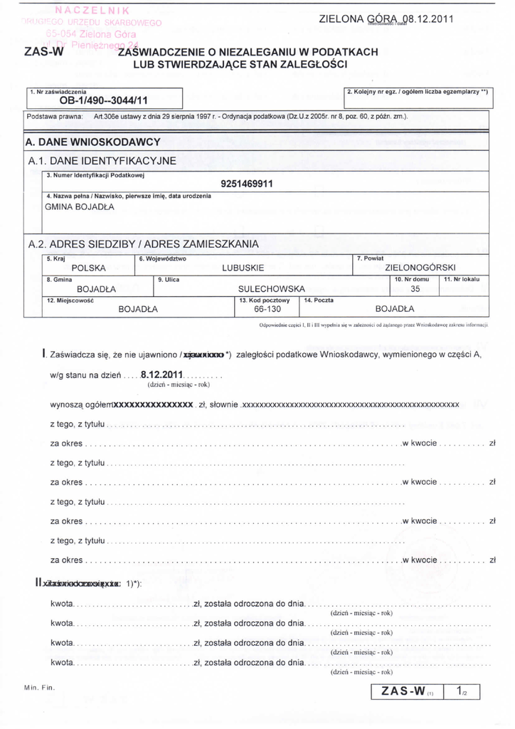 ZIELONAfi£BAJ)8.12.2011 Gora m 9-d ZAS-W ZASWIADCZENIE O NIEZALEGANIU W PODATKACH LUB STWIERDZAJ^CE STAN ZALEGLOSCI 1. Nrzaswiadczenia 2. Kolejny nr egz. / og6tem liczba egzemplarzy **) OB-1/490-3044/11 Podstawa prawna: Art.306eustawyzdnia29sierpnia 1997r. -Ordynacja podatkowa (Dz.U.z 2005r. nr8, poz. 60, zpozn. zm.). A. DANE WNIOSKODAWCY A.1. DANE IDENTYFIKACYJNE 3. Numer Identyfikacji Podatkowej 9251469911 4. Nazwa pelna / Nazwisko, pierwsze imie, data urodzenia GMINABOJADLA A.2. ADRES SIEDZIBY / ADRES ZAMIESZKANIA 5. Kraj 7. Powiat 6. Wojew6dztwo LUBUSKIE POLSKA 8. Gmina ZIELONOG6RSKI 10. Nrdomu 9. Ulica BOJADtA SULECHOWSKA 12. Miejscowosd 13. Kod pocztowy 14. Poczta 66-130 BOJADtA 11. Nr lokalu 35 BOJADLA Odpowjednie cz?sci 1, [I i 111 wypelma si? w zaleznosci od zstilantyo przei Wnioskodawci; zakresj infortnacji I. Zaswiadcza SJQ, ze nie ujawniono /xqasMHicxw*) zalegtosci podatkowe Wnioskodawcy, wymienionego w cz^sci A, w/g stanu na dzieh ..... 8.12.2011 .......... (dzicri - micsi^c - rok) wynosza^ ogoierrtXXXXXXXXXXXXXXX zt, sbwnie .xxxxxxxxxxxxxxxxxxxxxxxxxxxxxxxxxxxxxxxxxxxxxxxxxx z tego, z tytutu ............................................................................ za okres ................................................................... z tego, z tytutu w kwocie .......... zJ .......... zt .......... zt .......... zt ............................................................................ za okres ................................................................... z tego, z tytutu w kwocie ............................................................................ za okres ................................................................... z tego, z tytufu w kwocie ............................................................................ za okres ................................................................... w kwocie ; 1)*): kwota ............................... zt, zostala odroczona do dnia kwota ............................... z\ zostaia odroczona do dnia. kwota ............................... z\ zostafa odroczona do dnia. (dziei'i - miesi^c - rok) (dzieh - miesi^c - rok) (dzieri - miesiqc - rok) kwota ............................... zt, zostala odroczona do dnia. (dzieh - miesi^c - rok) Min. Fin. Z A S - W (1| 1« kwota zt zostata roztozona na kwota zt zostata roztozona na kwota zl zostata roztozona na kwota. . . zt zostata roztozona na .rat, z terminem ptatnosci ostatniej raty w dniu (dzieh - miesi^c .rat, z terminem ptatnosci ostatniej raty w dniu (dzieh - miesia^c .rat, z terminem ptatnosci ostatniej raty w dniu (dzieh - miesia^c .rat, z terminem ptatnosci ostatniej raty w dniu (dzieh - miesicic - (zaznaczytf wta&iwy kwadrat) a) prowadzone jest postepowanie egzekucyjne w administracji, rowniez w zakresie innych niz podatkowe zobowiazan Wnioskodawcy 1 . tak 2. nie b) prowadzone jest postepowanie w sprawach o przestepstwa skarbowe lub wykroczenia skarbowe l.tak 2. nie IV. Na podstawie art.306e §3 ustawy z dnia 29 sierpnia 1997 r. - Ordynacja podatkowa (Dz.U. z 2005r. nr 8, poz. 60, z pozn. zm. ) informuje si§, ze jjandx/ nie jest *) prowadzone postepowanie maja_ce na celu ustalenie lub okreslenie wysokosci zobowiazari Wnioskodawcy. V. Dokonano zaplaty optaty skarbowej w wysokosci ...................................... 0.00 ....... zt stow nie VI. VII. riiBQDddKgaxsptaineQdraricixauej) / Zwolniono od optaty skarbowej *) na podstawie r art 7 pkt 3 ustawy z dnia 16 listopada 2006 r. o optacie skarbowej Dz.U. Nr 225, poz. 1635 z pozn. zm. Piecz^c urz^dowa Z upowaznie iia Maczelnlka Drugiego Ur« dul fc^rbowego KIEROWh IfC DZIAtU />. V mgf inz. \i dih Lesniak \. ./ \ Podpis z podaniem imieriiar«a2wiskaTstanowiska stuzbowego *) Niepotrzebne skreslic. **) Wypelnic w przypadku wydania zaswiadczenia na wi^cej niz jednym egzemplarzu druku. 1) Jezeli zaptata zalegtosci podatkowej wraz z odsetkami za zwtok? zosta^a odroczona lub roztozona na raty, uznaje si?, ze podatnik, ptatnik lub inkasent do dnia upJywu terminow, o ktorych mowa w art.49 §1 ustawy z dnia 29 sierpnia 1997 r. - Ordynacja podatkowa, nie posiada zalegtosci podatkowych (art.306e §5 ustawy z dnia 29 sierpnia 1997 r. - Ordynacja podatkowa). Min. Fin. ZAS-WM, 2» rok) rok} rok) rok)
