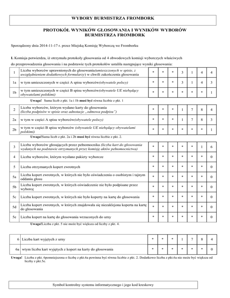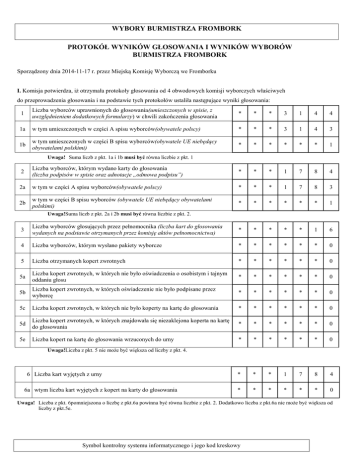WYBORY BURMISTRZA FROMBORK PROTOKÓŁ WYNIKÓW GŁOSOWANIA I WYNIKÓW WYBORÓW BURMISTRZA FROMBORK Sporządzony dnia 2014-11-17 r. przez Miejską Komisję Wyborczą we Fromborku I. Komisja potwierdza, iż otrzymała protokoły głosowania od 4 obwodowych komisji wyborczych właściwych do przeprowadzenia głosowania i na podstawie tych protokołów ustaliła następujące wyniki głosowania: 1 Liczba wyborców uprawnionych do głosowania(umieszczonych w spisie, z uwzględnieniem dodatkowych formularzy) w chwili zakończenia głosowania * * * 3 1 4 4 1a w tym umieszczonych w części A spisu wyborców(obywatele polscy) * * * 3 1 4 3 1b w tym umieszczonych w części B spisu wyborców(obywatele UE niebędący obywatelami polskimi) * * * * * * 1 Uwaga! Suma liczb z pkt. 1a i 1b musi być równa liczbie z pkt. 1 2 Liczba wyborców, którym wydano karty do głosowania (liczba podpisów w spisie oraz adnotacje „odmowa podpisu”) * * * 1 7 8 4 2a w tym w części A spisu wyborców(obywatele polscy) * * * 1 7 8 3 2b w tym w części B spisu wyborców (obywatele UE niebędący obywatelami polskimi) * * * * * * 1 Uwaga!Suma liczb z pkt. 2a i 2b musi być równa liczbie z pkt. 2. 3 Liczba wyborców głosujących przez pełnomocnika (liczba kart do głosowania wydanych na podstawie otrzymanych przez komisję aktów pełnomocnictwa) * * * * * 1 6 4 Liczba wyborców, którym wysłano pakiety wyborcze * * * * * * 0 5 Liczba otrzymanych kopert zwrotnych * * * * * * 0 5a Liczba kopert zwrotnych, w których nie było oświadczenia o osobistym i tajnym oddaniu głosu * * * * * * 0 5b Liczba kopert zwrotnych, w których oświadczenie nie było podpisane przez wyborcę * * * * * * 0 5c Liczba kopert zwrotnych, w których nie było koperty na kartę do głosowania * * * * * * 0 5d Liczba kopert zwrotnych, w których znajdowała się niezaklejona koperta na kartę do głosowania * * * * * * 0 5e Liczba kopert na kartę do głosowania wrzuconych do urny * * * * * * 0 * * * 1 7 8 4 * * * * * * 0 Uwaga!Liczba z pkt. 5 nie może być większa od liczby z pkt. 4. 6 Liczba kart wyjętych z urny 6a wtym liczba kart wyjętych z kopert na karty do głosowania Uwaga! Liczba z pkt. 6pomniejszona o liczbę z pkt.6a powinna być równa liczbie z pkt. 2. Dodatkowo liczba z pkt.6a nie może być większa od liczby z pkt.5e. Symbol kontrolny systemu informatycznego i jego kod kreskowy -2- 7 Liczba kart nieważnych(innych niż urzędowo ustalone lub nieopatrzonych pieczęcią obwodowej komisji wyborczej) * * * * * * 2 8 Liczba kart ważnych * * * 1 7 8 2 9 Liczba głosów nieważnych(z kart ważnych) * * * * * 4 0 9a w tym liczba głosów nieważnych z powodu postawienia znaku „X” obok nazwiska dwóch lub większej liczby kandydatów * * * * * * 2 9b w tym liczba głosów nieważnych z powodu niepostawienia znaku „X” obok nazwiska żadnego kandydata * * * * * 3 8 9c w tym liczba głosów nieważnych z powodu postawienia znaku „X” wyłącznie obok skreślonego nazwiska kandydata * * * * * * 0 * * * 1 7 4 2 Uwaga! Suma liczb z pkt 9a. – 9c. musi być równa lub mniejsza od liczby z pkt 9. 10 Liczba głosów ważnychoddanych łącznie na wszystkich kandydatów (z kart ważnych) Uwaga! Suma liczb z pkt. 9 i 10 musi być równa liczbie z pkt. 8. 11. Lp. Na poszczególnych kandydatów na wójta, burmistrza, prezydenta miasta*)oddano następujące liczby głosów ważnych: Nazwisko i imię - imiona Zgłoszony przez Komitet Wyborczy Liczba głosów ważnych 1 BAKINOWSKI Henryk Konstanty Komitet Wyborczy Wyborców Porozumienie Samorządowe * * * * 6 4 7 2 BRZESKI Rafał Komitet Wyborczy Prawo i Sprawiedliwość * * * * * 4 4 3 KRUSZYŃSKA Kaja Ewa Komitet Wyborczy Wyborców Niezależni * * * * * 5 5 4 WROŃSKA Małgorzata Marta Komitet Wyborczy Wyborców "PRZEMIANY" * * * * 9 9 6 * * * 1 7 4 2 Razem Uwaga! Suma głosów oddanych na wszystkich kandydatów (rubryka „Razem” i głosów nieważnych (pkt 9) musi być równa liczbie z pkt 8, czyli liczbie kart ważnych. Symbol kontrolny systemu informatycznego i jego kod kreskowy -3II. Komisja stwierdziła, że: 12. Liczba głosów stanowiąca więcej niż połowę głosów ważnych wymagana dla wyboru wójta/burmistrza/prezydenta miasta*) wynosi 891 13.1) Wymaganą liczbę głosów uzyskał i został wybrany na wójta/burmistrza/prezydenta miasta *) Nazwisko i imię - imiona WROŃSKA Małgorzata Marta Zgłoszony przez Komitet Wyborczy Komitet Wyborczy Wyborców "PRZEMIANY" 14.1)2) Żaden z kandydatów nie uzyskał wymaganej liczby głosów; do wyborów w ponownym głosowaniu dopuszczeni zostali dwaj kandydaci, którzy uzyskali największą liczbę głosów: - Zgłoszony przez Komitet Wyborczy Nazwisko i imię - imiona Lp. - - 2)3) Następujący kandydaci: - Zgłoszony przez Komitet Wyborczy Nazwisko i imię - imiona Lp. - - uzyskali równe liczby głosów; o dopuszczeniu do wyborów w ponownym głosowaniu zdecydowała większa liczba obwodów, w których kandydat uzyskał więcej głosów. Kandydatem tym jest -, który uzyskał więcej głosów w - obwodach głosowania; natomiast kandydat - uzyskał więcej głosów w -obwodach głosowania. 3)3) Następujący kandydaci: - Zgłoszony przez Komitet Wyborczy Nazwisko i imię - imiona Lp. - - uzyskali równe liczby głosów i otrzymali więcej głosów w takiej samej liczbie - obwodów, o dopuszczeniu do wyborów w ponownym głosowaniu rozstrzygnęło losowanie. Kandydatem wylosowanym jest - . - Symbol kontrolny systemu informatycznego i jego kod kreskowy -4III. UWAGI I ADNOTACJE 15.**) Adnotacja o wniesieniu przez osoby pełniące funkcję mężów zaufania uwag z wymienieniem konkretnych zarzutów***); jeżeli nie ma, wpisać „brak zarzutów” lub „brak osób pełniących funkcję mężów zaufania”: brak zarzutów 16.**) Adnotacja o wniesieniu przez członków Komisji uwag z wymienieniem konkretnych zarzutów***); jeżeli nie ma, wpisać „brak zarzutów”: brak zarzutów 17.**) Inne uwagi; jeżeli nie ma, wpisa