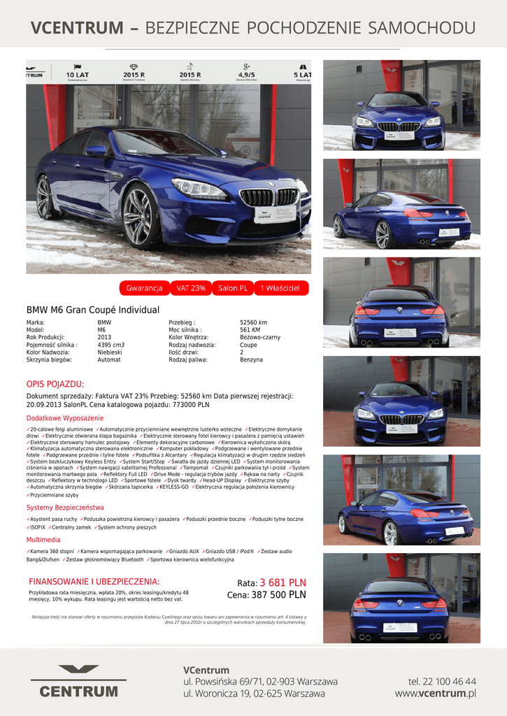 BMW M6 Gran Coupé Individual Marka: Model: Rok Produkcji: Pojemność silnika : Kolor Nadwozia: Skrzynia biegów: BMW M6 2013 4395 cm3 Niebieski Automat Przebieg : Moc silnika : Kolor Wnętrza: Rodzaj nadwozia: Ilość drzwi: Rodzaj paliwa: 52560 km 561 KM Beżowo-czarny Coupe 2 Benzyna OPIS POJAZDU: Dokument sprzedaży: Faktura VAT 23% Przebieg: 52560 km Data pierwszej rejestracji: 20.09.2013 SalonPL Cena katalogowa pojazdu: 773000 PLN Dodatkowe Wyposażenie ✓20-calowe felgi aluminiowe ✓Automatycznie przyciemniane wewnętrzne lusterko wsteczne ✓Elektryczne domykanie drzwi ✓Elektrycznie otwierana klapa bagażnika ✓Elektrycznie sterowany fotel kierowcy i pasażera z pamięcią ustawień ✓Elektrycznie sterowany hamulec postojowy ✓Elementy dekoracyjne carbonowe ✓Kierownica wykończona skórą ✓Klimatyzacja automatyczna sterowana elektronicznie ✓Komputer pokładowy ✓Podgrzewane i wentylowane przednie fotele ✓Podgrzewane przednie i tylne fotele ✓Podsufitka z Alcantary ✓Regulacja klimatyzacji w drugim rzędzie siedzeń ✓System bezkluczykowy Keyless Entry ✓System Start/Stop ✓Światła do jazdy dziennej LED ✓System monitorowania ciśnienia w oponach ✓System nawigacji satelitarnej Professional ✓Tempomat ✓Czujniki parkowania tył i przód ✓System monitorowania martwego pola ✓Reflektory Full LED ✓Drive Mode - regulacja trybów jazdy ✓Rękaw na narty ✓Czujnik deszczu ✓Reflektory w technologii LED ✓Sportowe fotele ✓Dysk twardy ✓Head-UP Display ✓Elektryczne szyby ✓Automatyczna skrzynia biegów ✓Skórzana tapicerka ✓KEYLESS-GO ✓Elektryczna regulacja położenia kierownicy ✓Przyciemniane szyby Systemy Bezpieczeństwa ✓Asystent pasa ruchy ✓Poduszka powietrzna kierowcy i pasażera ✓Poduszki przednie boczne ✓Poduszki tylne boczne ✓ISOFIX ✓Centralny zamek ✓System ochrony pieszych Multimedia ✓Kamera 360 stopni ✓Kamera wspomagająca parkowanie ✓Gniazdo AUX ✓Gniazdo USB / iPod® ✓Zestaw audio Bang&Olufsen ✓Zestaw głośnomówiący Bluetooth ✓Sportowa kierownica wielofunkcyjna FINANSOWANIE I UBEZPIECZENIA: Przykładowa rata miesięczna, wpłata 20%, okres leasingu/kredytu 48 miesięcy, 10% wykupu. Rata leasingu jest wartością netto bez vat. Rata: 3 681 Cena: 387 500 PLN PLN Niniejsza treść nie stanowi oferty w rozumieniu przepisów Kodeksu Cywilnego oraz opisu towaru ani zapewnienia w rozumieniu art. 4 Ustawy z dnia 27 lipca 2002r o szczególnych warunkach sprzedaży konsumenckiej. Powered by TCPDF (www.tcpdf.org)