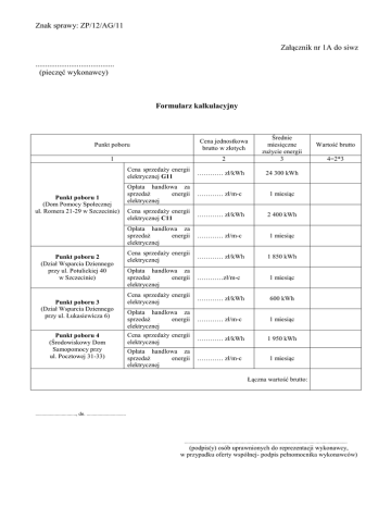 Znak sprawy: ZP/12/AG/11 Załącznik nr 1A do siwz ........................................ (pieczęć wykonawcy) Formularz kalkulacyjny Punkt poboru Cena jednostkowa brutto w złotych 1 2 Punkt poboru 1 (Dom Pomocy Społecznej ul. Romera 21-29 w Szczecinie) Punkt poboru 2 (Dział Wsparcia Dziennego przy ul. Potulickiej 40 w Szczecinie) Punkt poboru 3 (Dział Wsparcia Dziennego przy ul. Łukasiewicza 6) Punkt poboru 4 (Środowiskowy Dom Samopomocy przy ul. Pocztowej 31-33) Średnie miesięczne zużycie energii 3 Cena sprzedaży energii elektrycznej G11 ………… zł/kWh 24 300 kWh Opłata handlowa za sprzedaż energii elektrycznej ………… zł/m-c 1 miesiąc Cena sprzedaży energii elektrycznej C11 ………… zł/kWh 2 400 kWh Opłata handlowa za sprzedaż energii elektrycznej ………… zł/m-c 1 miesiąc Cena sprzedaży energii elektrycznej ………… zł/kWh 1 850 kWh Opłata handlowa za sprzedaż energii elektrycznej …………zł/m-c 1 miesiąc Cena sprzedaży energii elektrycznej ………… zł/kWh 600 kWh ………… zł/m-c 1 miesiąc ………… zł/kWh 1 950 kWh ………… zł/m-c 1 miesiąc Opłata handlowa za sprzedaż energii elektrycznej Cena sprzedaży energii elektrycznej Opłata handlowa za sprzedaż energii elektrycznej Wartość brutto 4=2*3 Łączna wartość brutto: ..............................., dn. .............................. ............................................................................................................................ (podpis(y) osób uprawnionych do reprezentacji wykonawcy, w przypadku oferty wspólnej- podpis pełnomocnika wykonawców)
