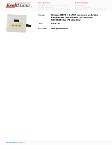 akcesoriamuzyczne.pl Salon Bemowo Salon Białołęka Powstańców Śląskich 87 lok. U10 B 01-466 Warszawa Tel. (22)427-89-95, (22)398-73-32 Kabrioletu 4 03-117 Warszawa Tel. (22)490-31-43, (22)243-36-05 Nazwa: Gniazdo HDMI + 3xRCA naścienne podwójne kwadratowe podtynkowe z przewodem G1HDRGB-KW (PL standard) Cena: 55,00 zł Producent: Inni producenci