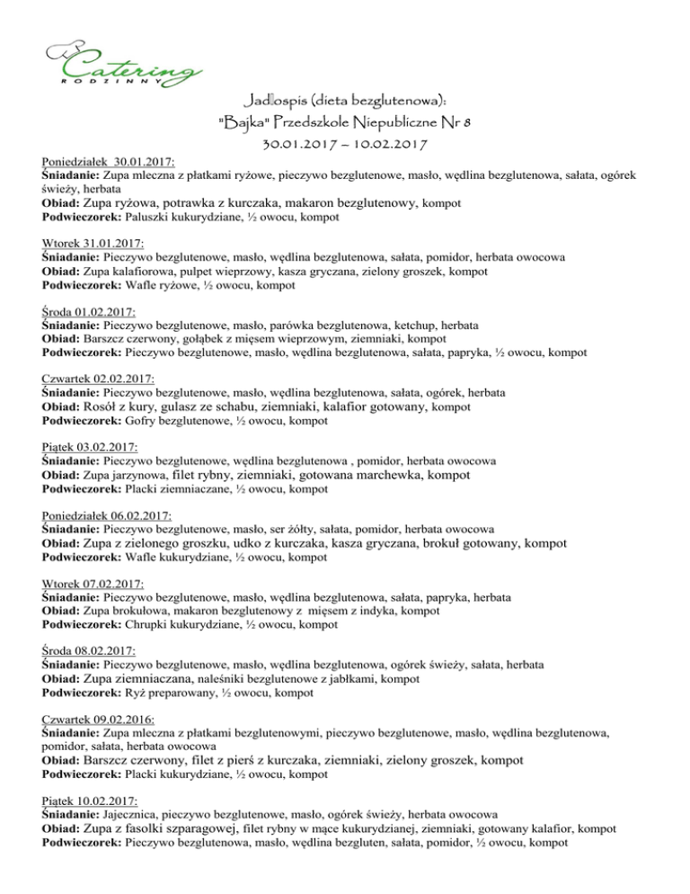 Jadłospis (dieta bezglutenowa): "Bajka" Przedszkole Niepubliczne Nr 8 30.01.2017 – 10.02.2017 Poniedziałek 30.01.2017: Śniadanie: Zupa mleczna z płatkami ryżowe, pieczywo bezglutenowe, masło, wędlina bezglutenowa, sałata, ogórek świeży, herbata Obiad: Zupa ryżowa, potrawka z kurczaka, makaron bezglutenowy, kompot Podwieczorek: Paluszki kukurydziane, ½ owocu, kompot Wtorek 31.01.2017: Śniadanie: Pieczywo bezglutenowe, masło, wędlina bezglutenowa, sałata, pomidor, herbata owocowa Obiad: Zupa kalafiorowa, pulpet wieprzowy, kasza gryczana, zielony groszek, kompot Podwieczorek: Wafle ryżowe, ½ owocu, kompot Środa 01.02.2017: Śniadanie: Pieczywo bezglutenowe, masło, parówka bezglutenowa, ketchup, herbata Obiad: Barszcz czerwony, gołąbek z mięsem wieprzowym, ziemniaki, kompot Podwieczorek: Pieczywo bezglutenowe, masło, wędlina bezglutenowa, sałata, papryka, ½ owocu, kompot Czwartek 02.02.2017: Śniadanie: Pieczywo bezglutenowe, masło, wędlina bezglutenowa, sałata, ogórek, herbata Obiad: Rosół z kury, gulasz ze schabu, ziemniaki, kalafior gotowany, kompot Podwieczorek: Gofry bezglutenowe, ½ owocu, kompot Piątek 03.02.2017: Śniadanie: Pieczywo bezglutenowe, wędlina bezglutenowa , pomidor, herbata owocowa Obiad: Zupa jarzynowa, filet rybny, ziemniaki, gotowana marchewka, kompot Podwieczorek: Placki ziemniaczane, ½ owocu, kompot Poniedziałek 06.02.2017: Śniadanie: Pieczywo bezglutenowe, masło, ser żółty, sałata, pomidor, herbata owocowa Obiad: Zupa z zielonego groszku, udko z kurczaka, kasza gryczana, brokuł gotowany, kompot Podwieczorek: Wafle kukurydziane, ½ owocu, kompot Wtorek 07.02.2017: Śniadanie: Pieczywo bezglutenowe, masło, wędlina bezglutenowa, sałata, papryka, herbata Obiad: Zupa brokułowa, makaron bezglutenowy z mięsem z indyka, kompot Podwieczorek: Chrupki kukurydziane, ½ owocu, kompot Środa 08.02.2017: Śniadanie: Pieczywo bezglutenowe, masło, wędlina bezglutenowa, ogórek świeży, sałata, herbata Obiad: Zupa ziemniaczana, naleśniki bezglutenowe z jabłkami, kompot Podwieczorek: Ryż preparowany, ½ owocu, kompot Czwartek 09.02.2016: Śniadanie: Zupa mleczna z płatkami bezglutenowymi, pieczywo bezglutenowe, masło, wędlina bezglutenowa, pomidor, sałata, herbata owocowa Obiad: Barszcz czerwony, filet z pierś z kurczaka, ziemniaki, zielony groszek, kompot Podwieczorek: Placki kukurydziane, ½ owocu, kompot Piątek 10.02.2017: Śniadanie: Jajecznica, pieczywo bezglutenowe, masło, ogórek świeży, herbata owocowa Obiad: Zupa z fasolki szparagowej, filet rybny w mące kukurydzianej, ziemniaki, gotowany kalafior, kompot Podwieczorek: Pieczywo bezglutenowa, masło, wędlina bezgluten, sałata, pomidor, ½ owocu, kompot
