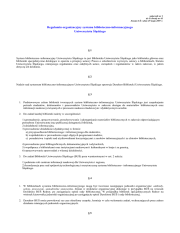 załącznik nr 1 do Uchwały nr 65 Senatu UŚ z dnia 29 maja 2007 r. Regulamin organizacyjny systemu biblioteczno-informacyjnego Uniwersytetu Śląskiego §1 System biblioteczno–informacyjny Uniwersytetu Śląskiego to jest Biblioteka Uniwersytetu Śląskiego jako biblioteka główna oraz biblioteki specjalistyczne działające w oparciu o przepisy ustawy Prawo o szkolnictwie wyższym, ustawy o bibliotekach, Statutu Uniwersytetu Śląskiego, niniejszego regulaminu oraz odrębnych ustaw, zarządzeń i regulaminów w takim zakresie, w jakim dotyczą ich działania. §2 Nadzór nad systemem biblioteczno-informacyjnym Uniwersytetu Śląskiego sprawuje Dyrektor Biblioteki Uniwersytetu Śląskiego. §3 1. Podstawowym celem bibliotek tworzących system biblioteczno–informacyjny Uniwersytetu Śląskiego jest zaspokajanie potrzeb studentów, doktorantów i pracowników Uniwersytetu w zakresie dostępu do materiałów bibliotecznych oraz informacji naukowej związanych z procesem naukowo-badawczym i dydaktycznym uczelni. 2. Do zadań każdej biblioteki należy w szczególności: 1) gromadzenie, opracowywanie, przechowywanie i udostępnianie materiałów bibliotecznych w zakresie odpowiadającym potrzebom Uniwersytetu oraz publicznej dostępności bibliotek, 2) działalność informacyjna, 3) prowadzenie działalności dydaktycznej w formie: a) przysposobienia bibliotecznego i informacyjnego dla studentów, b) współudziału w prowadzeniu zajęć objętych programami studiów, c) poradnictwa i opieki nad użytkownikami korzystającymi z zasobów informacyjnych i ze zbiorów bibliotecznych, 4) prowadzenie prac bibliograficznych, dokumentacyjnych i edytorskich, 5) współpraca z bibliotekami oraz instytucjami naukowymi i kulturalnymi w kraju i za granicą, 6) opracowywanie sprawozdań z własnej działalności. 3. Do zadań Biblioteki Uniwersytetu Śląskiego (BUŚ) poza wymienionymi w ust. 2 należy: 1) pełnienie roli centrum informacji naukowej dla Uniwersytetu i regionu, 2) koordynacja prac nad spójnością technologiczną i merytoryczną systemu biblioteczno– informacyjnego Uniwersytetu Śląskiego. §4 1. W bibliotekach systemu biblioteczno-informacyjnego mogą być tworzone następujące jednostki organizacyjne: oddziały, sekcje, pracownie, samodzielne stanowiska. Zmian w strukturze organizacyjnej dokonuje w przypadku BUŚ na wniosek Dyrektora BUŚ Rektor, po zasięgnięciu opinii rady bibliotecznej. W przypadku bibliotek specjalistycznych Rektor na wniosek kierownika jednostki organizacyjnej po zasięgnięciu opinii Dyrektora BUŚ i rady bibliotecznej. 2. Dyrektor BUŚ może powoływać na czas określony zespoły, komisje w celu wykonania zadań, wykraczających poza zakres działania istniejących jednostek organizacyjnych. §5 1. Kierowników jednostek organizacyjnych BUŚ oraz ich zastępców na wniosek Dyrektora, powołuje i odwołuje Rektor . 2. Kierowników bibliotek specjalistycznych wydziałów na wniosek dziekana powołuje i odwołuje Rektor po zasięgnięciu opinii Dyrektora BUŚ. 3. Kierowników jednostek organizacyjnych systemu biblioteczno-informacyjnego, nie stanowiących bibliotek specjalistycznych wydziałów, na wniosek Dyrektora BUŚ po zasięgnięciu opinii kierownika odpowiedniej jednostki organizacyjnej, powołuje i odwołuje Rektor. 4. Kierownik jednostki organizacyjnej w BUŚ odpowiada przed Dyrektorem BUŚ za realizację zadań ustalonych dla jednostki organizacyjnej .W przypadku braku zastępcy kierownik spośród pracowników wyznacza pisemnie osobę, która w czasie jego nieobecności pełni zastępstwo. 5. Kierownik biblioteki specjalistycznej odpowiada przed kierownikiem jednostki organizacyjnej przy której działa biblioteka, za realizację zadań ustalonych dla biblioteki specjalistycznej a przed Dyrektorem BUŚ za realizację zadań ustalonych dla systemu biblioteczno-informacyjnego Uniwersytetu. Spośród pracowników wyznacza pisemnie osobę, która w czasie jego nieobecności pełni zastępstwo. W przypadku bibliotek o jednoosobowej obsadzie, zastępstwo pełni osoba wyznaczona przez kierownika jednostki organizacyjnej, który ustala zakres zastępstwa. 6. Rzeczowe zakresy działania kierowników jednostek organizacyjnych BUŚ oraz ich zastępców ustala Dyrektor BUŚ, dla kierowników bibliotek specjalistycznych ustalają kierownicy jednostek organizacyjnych, przy których działają biblioteki w uzgodnieniu z Dyrektorem BUŚ, a pozostałych pracowników bibliotek bezpośredni przełożeni. §6 1. Zadania rady bibliotecznej określa § 40 Statutu Uniwersytetu Śląskiego. 2. Obsługę administracyjną i organizacyjną rady zapewnia BUŚ. 3. Dyrektor BUŚ przedstawia radzie bibliotecznej roczne sprawozdanie z działalności Biblioteki Uniwersytetu Śląskiego. §7 Biblioteki, zgodnie z aktualnymi przepisami ustawy o bibliotekach, mogą pobierać opłaty za niektóre usługi biblioteczne. Rodzaj usług za które mogą być pobierane opłaty ustala Rektor odrębnym zarządzeniem, na wniosek Dyrektora BUŚ. §8 Integralną część regulaminu organizacyjnego stanowią załączniki: a. „struktura organizacyjna systemu biblioteczno-informacyjnego Uniwersytetu Śląskiego oraz zakresy działania jej komórek organizacyjnych i stanowisk pracy” – załącznik nr 1, b. ,,schemat struktury Biblioteki Uniwersytetu Śląskiego’’ – załącznik nr 2, c. ,,wykaz bibliotek specjalistycznych’’ – załącznik nr 3. załącznik nr 1 do Regulaminu organizacyjnego systemu biblioteczno-informacyjnego Uniwersytetu Śląskiego Struktura organizacyjna systemu biblioteczno-informacyjnego Uniwersytetu Śląskiego oraz zakresy działania jej komórek organizacyjnych i stanowisk pracy. I. Na strukturę organizacyjną systemu biblioteczno-informacyjnego składają się następujące jednostki organizacyjne i stanowiska pracy: 1. Dyrektor i Zastępca Dyrektora BUŚ 1) Kolegium Biblioteki, 2) Koordynator ds. bibliotek specjalistycznych, a. Biblioteka i Czytelnia 