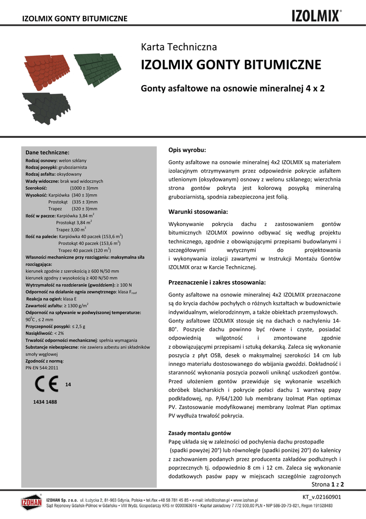 IZOLMIX GONTY BITUMICZNE Karta Techniczna IZOLMIX GONTY BITUMICZNE Gonty asfaltowe na osnowie mineralnej 4 x 2 Dane techniczne: Rodzaj osnowy: welon szklany Rodzaj posypki: gruboziarnista Rodzaj asfaltu: oksydowany Wady widoczne: brak wad widocznych Szerokość: (1000 ± 3)mm Wysokość: Karpiówka (340 ± 3)mm Prostokąt (335 ± 3)mm Trapez (320 ± 3)mm Ilość w paczce: Karpiówka 3,84 m2 Prostokąt 3,84 m2 Trapez 3,00 m2 Ilość na palecie: Karpiówka 40 paczek (153,6 m2) Prostokąt 40 paczek (153,6 m2) Trapez 40 paczek (120 m2) Własności mechaniczne przy rozciąganiu: maksymalna siła rozciągająca: kierunek zgodnie z szerokością ≥ 600 N/50 mm kierunek zgodny z wysokością ≥ 400 N/50 mm Wytrzymałość na rozdzieranie (gwoździem): ≥ 100 N Odporność na działanie ognia zewnętrznego: klasa Froof Reakcja na ogień: klasa E Zawartość asfaltu: ≥ 1300 g/m2 Odporność na spływanie w podwyższonej temperaturze: 900C , ≤ 2 mm Przyczepność posypki: ≤ 2,5 g Nasiąkliwość: < 2% Trwałość odporności mechanicznej: spełnia wymagania Substancje niebezpieczne: nie zawiera azbestu ani składników smoły węglowej Zgodność z normą: PN-EN 544:2011 14 1434 1488 Opis wyrobu: Gonty asfaltowe na osnowie mineralnej 4x2 IZOLMIX są materiałem izolacyjnym otrzymywanym przez odpowiednie pokrycie asfaltem utlenionym (oksydowanym) osnowy z welonu szklanego; wierzchnia strona gontów pokryta jest kolorową posypką mineralną gruboziarnistą, spodnia zabezpieczona jest folią. Warunki stosowania: Wykonywanie pokrycia dachu z zastosowaniem gontów bitumicznych IZOLMIX powinno odbywać się według projektu technicznego, zgodnie z obowiązującymi przepisami budowlanymi i szczegółowymi wytycznymi do projektowania i wykonywania izolacji zawartymi w Instrukcji Montażu Gontów IZOLMIX oraz w Karcie Technicznej. Przeznaczenie i zakres stosowania: Gonty asfaltowe na osnowie mineralnej 4x2 IZOLMIX przeznaczone są do krycia dachów pochyłych o różnych kształtach w budownictwie indywidualnym, wielorodzinnym, a także obiektach przemysłowych. Gonty asfaltowe IZOLMIX stosuje się na dachach o nachyleniu 1480°. Poszycie dachu powinno być równe i czyste, posiadać odpowiednią wilgotność i zmontowane zgodnie z obowiązującymi przepisami i sztuką dekarską. Zaleca się wykonanie poszycia z płyt OSB, desek o maksymalnej szerokości 14 cm lub innego materiału dostosowanego do wbijania gwoździ. Dokładność i staranność wykonania poszycia pozwoli uniknąć uszkodzeń gontów. Przed ułożeniem gontów przewiduje się wykonanie wszelkich obróbek blacharskich i pokrycie połaci dachu 1 warstwą papy podkładowej, np. P/64/1200 lub membrany Izolmat Plan optimax PV. Zastosowanie modyfikowanej membrany Izolmat Plan optimax PV wydłuża trwałość pokrycia. Zasady montażu gontów Papę układa się w zależności od pochylenia dachu prostopadle (spadki powyżej 20°) lub równolegle (spadki poniżej 20°) do kalenicy z zachowaniem podanych przez producenta zakładów podłużnych i poprzecznych tj. odpowiednio 8 cm i 12 cm. Zaleca się wykonanie dodatkowych pasów papy w miejscach szczególnie zagrożonych Strona 1 z 2 KT_v.02160901 IZOLMIX GONTY BITUMICZNE wzmożonym wnikaniem wody (pas nadrynnowy, kosz zlewowy, krawędzie dachu). Gonty wymagają mocowania mechanicznego i dodatkowo podklejania w strefach krawędziowych dachu. Sklejanie się gontów między sobą jest procesem powolnym, uzależnionym od stopnia nasłonecznienia połaci dachowej i nie jest brane pod uwagę w ocenie odporności pokrycia dachu na siłę ssącą wiatru. Gonty można instalować w temperaturach otoczenia powyżej +5°C. W obniżonych temperaturach otoczenia, gonty powinny być przed użyciem przechowywane przez 24 godz. w temperaturze nie niższej niż o +18°C. Optymalna temperatura montażu gontów to 20-25 C. Przed instalacją gontów na dachu należy usunąć folię ze spodniej strony płatów. Układanie gontów zaczyna się od okapu, na pasie nadrynnowym. Pas startowy montuje się tak, aby wcięcia pomiędzy modułami były skierowane ku górze. Mocowanie do podłoża odbywa się przy pomocy kleju i gwoździ. Kolejna warstwa gontów układana jest na gontach pasa startowego po o obróceniu o 180 (wcięciami do dołu). Pierwsza warstwa powinna być przesunięta o połowę szerokości modułu względem pasa startowego. Druga warstwa gontów układana jest tak jak pierwsza, z zachowaniem przesunięcia o połowę modułu. Dolna krawędź listków gontów powinna stykać się z najwyższymi wcięciami gontów na pasie poprzednim – dotyczy to dachów o nachyleniu 25°-80°. Przy mniejszym nachyleniu dachu poniżej 25° zakład płata górnego poniżej wycięcia płata dolnego powinien wynosić 4 cm, który należy uwzględnić przy zużyciu z paczki. Gonty układa się na styk, bez pozostawiania szczelin. Mocuje się poprzez przybijanie ocynkowanych gwoździ papowych nad wcięciami modułowymi w odległości ok. 1 - 2 cm. Długość gwoździ powinna być dobrana odpowiednio do grubości poszycia tak, aby gwóźdź był wbity prostopadle na głębokość min. ¾ grubości poszycia. Nie dopuszcza się wbijania gwoździ papowych, których główka wystaje ponad gont lub nadmiernie się w niego zagłębia. W strefach dachu, narażonych na działanie silnych wiatrów oraz w strefach newralgicznych dachu tj. pas nadrynnowy, wiatrownice, kalenice, kosz zlewowy oraz na stromych powierzchniach o nachyleniu powyżej 55° (na stromych dachach mansardowych) należy podklejać krańce listków gontów masami tj. IZOHAN Klej Dekarski, IZOHAN ROOFIX lub IZOHAN Uszczelniacz dekarski bitumiczny. Pomiędzy termoizolacją a poszyciem dachu należy skonstruować pustkę powietrzną, w której będzie mogła zachodzić cyrkulacja pary wodnej. Okolice kalenicy i okapu są miejscami, gdzie tworzone są specjalne szczeliny pozwalające na przepływ powietrza. Gwarancja: Producent IZOHAN Sp. z o.o. udziela bezpośredni