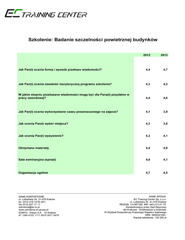 Szkolenie: Badanie szczelności powietrznej budynków 2012 2013 Jak Pan(i) ocenia formę i sposób przekazu wiadomości? 4,4 4,7 Jak Pan(i) ocenia zawatość merytoryczną programu szkolenia? 4,3 4,2 W jakim stopniu przekazane wiadomości mogą być dla Pana(i) przydatne w pracy zawodowej? 4,4 4,6 Jak Pan(i) ocenia wykorzystanie czasu przeznaczonego na zajęcia? 4,1 3,9 Jak ocenia Pan(i) wybór miejsca? 4,3 3,9 Jak ocenia Pan(i) wyżywienie? 4,3 4,1 Otrzymane materiały 4,4 4,8 Sala seminaryjna (sprzęt) 4,6 4,1 Organizacja ogólnie 4,7 4,5 DANE KONTAKTOWE: ul. Lublańska 34, 31-476 Kraków tel. (012) 418 10 63 (67) fax (012) 627 77 11 [email protected] www.szkolenia.ec-grupa.pl KONTO : Pekao S.A. O/ Kraków 81 1240 4722 1111 0010 2617 5479 DANE SPÓŁKI: EC Training Center Sp. z o.o. ul. Lublańska 34, 31-476 Kraków REGON: 121067358, NIP: 945-213-41-75 Zarejestrowany przez Sąd Rejonowy dla Krakowa - Śródmieścia w Krakowie XI Wydział Gospodarczy Krajowego Rejestru Sądowego KRS: 0000341043 Kapitał zakładowy: 120 000 zł