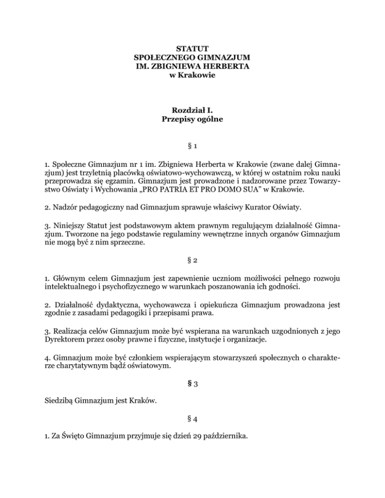 STATUT SPOŁECZNEGO GIMNAZJUM IM. ZBIGNIEWA HERBERTA w Krakowie Rozdział I. Przepisy ogólne §1 1. Społeczne Gimnazjum nr 1 im. Zbigniewa Herberta w Krakowie (zwane dalej Gimnazjum) jest trzyletnią placówką oświatowo-wychowawczą, w której w ostatnim roku nauki przeprowadza się egzamin. Gimnazjum jest prowadzone i nadzorowane przez Towarzystwo Oświaty i Wychowania „PRO PATRIA ET PRO DOMO SUA” w Krakowie. 2. Nadzór pedagogiczny nad Gimnazjum sprawuje właściwy Kurator Oświaty. 3. Niniejszy Statut jest podstawowym aktem prawnym regulującym działalność Gimnazjum. Tworzone na jego podstawie regulaminy wewnętrzne innych organów Gimnazjum nie mogą być z nim sprzeczne. §2 1. Głównym celem Gimnazjum jest zapewnienie uczniom możliwości pełnego rozwoju intelektualnego i psychofizycznego w warunkach poszanowania ich godności. 2. Działalność dydaktyczna, wychowawcza i opiekuńcza Gimnazjum prowadzona jest zgodnie z zasadami pedagogiki i przepisami prawa. 3. Realizacja celów Gimnazjum może być wspierana na warunkach uzgodnionych z jego Dyrektorem przez osoby prawne i fizyczne, instytucje i organizacje. 4. Gimnazjum może być członkiem wspierającym stowarzyszeń społecznych o charakterze charytatywnym bądź oświatowym. §3 Siedzibą Gimnazjum jest Kraków. §4 1. Za Święto Gimnazjum przyjmuje się dzień 29 października. 2. Opiekę duszpasterską pełni nad Gimnazjum jego każdorazowy katecheta w porozumieniu z Władzami klasztoru OO. Kapucynów w Krakowie, których kościół ustanawia się miejscem religijnych, szkolnych uroczystości. §5 1. Uczniowie, ich rodzice lub opiekunowie, nauczyciele oraz inni pracownicy Gimnazjum tworzą społeczność szkolną. 2. Rodzice lub opiekunowie uczniów uczestniczą w życiu gimnazjum, przedstawiając wnioski i uwagi na zebraniach klasowych rodziców, a także działając społecznie na jego rzecz w sposób uzgodniony z dyrektorem gimnazjum. §6 Nauczyciele mają prawo nauczać zgodnie z wybranymi przez siebie i uzgodnionymi z Dyrektorem Gimnazjum metodami nauczania, przestrzegając zasad etyki zawodowej. §7 1. Nauczyciele i inni pracownicy Gimnazjum zatrudniani są zgodnie z obowiązującymi przepisami oraz uchwałami Władz Towarzystwa Oświaty i Wychowania w Krakowie. 2. Umowy zawiera i rozwiązuje Dyrektor Gimnazjum i tylko do niego należy merytoryczna ocena fachowości pracowników dydaktyczno-oświatowych. §8 1. Działalność Gimnazjum finansowana jest przez rodziców lub opiekunów uczniów, dotacji budżetowych oraz innych donatorów. 2. Rodzice lub opiekunowie uczniów zobowiązani są terminowo uiszczać uchwalone opłaty. W przypadku nie wywiązywania się z uiszczania opłat zobowiązani są do zabrania dziecka z Gimnazjum w terminie do 1 miesiąca od zaprzestania wnoszenia opłat, chyba, że Zarząd Towarzystwa Oświaty i Wychowania postanowi inaczej. Rozdział II. Organy Gimnazjum §9 1/ Organami Gimnazjum są: a/ Dyrektor, b/ Rada Pedagogiczna, c/ Samorząd Uczniowski, d/ Rada Rodziców (o ile jest powołana). 2/ W gimnazjum funkcjonuje: a/ gabinet psychologiczno-pedagogiczny, b/ biblioteka, c/ świetlica, d/ spółdzielnia uczniowska, e/ system zajęć pozalekcyjnych (kółka przedmiotowe, artystyczne, sportowe, zajęcia wyrównawcze). § 10 1. Decyzje i opinie Rady Pedagogicznej i Samorządu Uczniowskiego zapadają w drodze uchwały, w trybie określonym wewnętrznymi regulaminami tych organów. 2. Posiedzenia tych organów są protokołowane, a ich uchwały nie mogą być sprzeczne ze Statutem Gimnazjum lub innymi przepisami prawa. W przeciwnym razie mogą być uchylone bądź zawieszone przez Zarząd TOiW. 3. Uchwały organów Gimnazjum winny być udostępnione społeczności szkolnej. § 11 1. Umowy o zatrudnieniu Dyrektora Gimnazjum zawiera i rozwiązuje Zarząd Towarzystwa Oświaty i Wychowania, który w zakresie dyscypliny pracy jest jego jednostką nadrzędną. 2. Czas pracy Dyrektora jest nienormowany. § 12 1. Dyrektor kieruje bieżącą działalnością Gimnazjum i reprezentuje go na zewnątrz. 2. Dyrektor opracowuje: a/ program dydaktyczno-wychowawczy Gimnazjum i nadzoruje jego właściwą realizację, b/ strukturę organizacyjną Gimnazjum oraz zakresy obowiązków dla jego pracowników, c/ preliminarz budżetowy Gimnazjum, d/ roczne sprawozdania z działalności dydaktyczno-wychowawczej oraz organizacyjnofinansowej Gimnazjum, e/ system organizacji wewnętrznego mierzenia jakości pracy Gimnazjum i składa stosowny raport. 3. Dyrektor zatrudnia i zwalnia pracowników Gimnazjum oraz zawiera i rozwiązuje inne umowy niezbędne do jego funkcjonowania, a także dysponuje jego środkami finansowymi. 4. Dyrektor organizuje przyjęcia uczniów. 5. Dyrektor odpowiada za przestrzeganie dyscypliny budżetowej, prawidłowe prowadzenie i przechowywanie dokumentacji gimnazjalnej oraz właściwe zabezpieczenie mienia Gimnazjum. 6. Dyrektor podejmuje decyzje o ukaraniu pracowników oraz przyznawaniu im nagród. 7. Od decyzji o ukaraniu pracownika przysługuje prawo odwołania do Zarządu Towarzystwa Oświaty i Wychowania w terminie 3 dni od otrzymania decyzji. 8. Dyrektor może brać udział w posiedzeniach Zarządu Towarzystwa Oświaty i Wychowania i Samorządu Uczniowskiego, jeśli uzna to za konieczne lub na zaproszenie tych organów. 9. Dyrektor winien być powiadamiany i ma prawo uczestniczyć we wszystkich zebraniach zwoływanych na terenie Gimnazjum. 10. W zakresie nieprzewidzianym dla innych organów Dyrektor koordynuje pracę placówek dydaktyczno-wychowawczych prowadzonych przez TOiW w Krakowie. Rada Pedagogiczna § 13 1. Rada Pedagogiczna jest organem odpowiedzialnym wraz z Dyrektorem za realizację programu dydaktyczno-wychowawczego i podejmującym związane z tym decyzje, a także jest organem doradczo-opiniodawczym Dyrektora. 2. W skład Rady wchodzą wszyscy uczący w Gimnazjum nauczyciele oraz jego Dyrektor, który jest jej przewodniczącym. 3. Posiedzenia Rady mogą być zwoływan