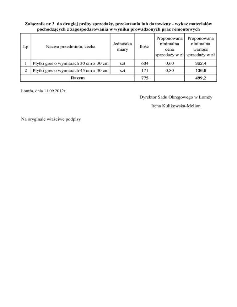Załącznik nr 3 do drugiej próby sprzedaży, przekazania lub darowizny - wykaz materiałów pochodzących z zagospodarowania w wyniku prowadzonych prac remontowych Proponowana Proponowana ninimalna ninimalna cena wartość sprzedaży w zł sprzedaży w zł Lp Nazwa przedmiotu, cecha Jednostka miary Ilość 1 Płytki gres o wymiarach 30 cm x 30 cm szt 604 0,60 362,4 2 Płytki gres o wymiarach 45 cm x 30 cm szt 171 0,80 136,8 Razem 775 499,2 Łomża, dnia 11.09.2012r. Dyrektor Sądu Okręgowego w Łomży Irena Kulikowska-Melion Na oryginale właściwe podpisy