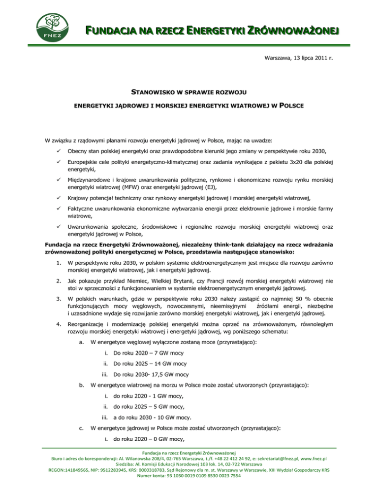 FUUNNDDAACCJJAA NNAA RRZZEECCZZ ENNEERRGGEETTYYKKII ZRRÓÓW WN NO OW WAAŻŻO ON NEEJJ Warszawa, 13 lipca 2011 r. STANOWISKO W SPRAWIE ROZWOJU ENERGETYKI JĄDROWEJ I MORSKIEJ ENERGETYKI WIATROWEJ W POLSCE W związku z rządowymi planami rozwoju energetyki jądrowej w Polsce, mając na uwadze: Obecny stan polskiej energetyki oraz prawdopodobne kierunki jego zmiany w perspektywie roku 2030, Europejskie cele polityki energetyczno-klimatycznej oraz zadania wynikające z pakietu 3x20 dla polskiej energetyki, Międzynarodowe i krajowe uwarunkowania polityczne, rynkowe i ekonomiczne rozwoju rynku morskiej energetyki wiatrowej (MFW) oraz energetyki jądrowej (EJ), Krajowy potencjał techniczny oraz rynkowy energetyki jądrowej i morskiej energetyki wiatrowej, Faktyczne uwarunkowania ekonomiczne wytwarzania energii przez elektrownie jądrowe i morskie farmy wiatrowe, Uwarunkowania społeczne, środowiskowe i regionalne rozwoju morskiej energetyki wiatrowej oraz energetyki jądrowej w Polsce, Fundacja na rzecz Energetyki Zrównoważonej, niezależny think-tank działający na rzecz wdrażania zrównoważonej polityki energetycznej w Polsce, przedstawia następujące stanowisko: 1. W perspektywie roku 2030, w polskim systemie elektroenergetycznym jest miejsce dla rozwoju zarówno morskiej energetyki wiatrowej, jak i energetyki jądrowej. 2. Jak pokazuje przykład Niemiec, Wielkiej Brytanii, czy Francji rozwój morskiej energetyki wiatrowej nie stoi w sprzeczności z funkcjonowaniem w systemie elektroenergetycznym energetyki jądrowej. 3. W polskich warunkach, gdzie w perspektywie roku 2030 należy zastąpić co najmniej 50 % obecnie funkcjonujących mocy węglowych, nowoczesnymi, nieemisyjnymi źródłami energii, niezbędne i uzasadnione wydaje się rozwijanie zarówno morskiej energetyki wiatrowej, jak i energetyki jądrowej. 4. Reorganizację i modernizację polskiej energetyki można oprzeć na zrównoważonym, równoległym rozwoju morskiej energetyki wiatrowej i energetyki jądrowej, wg poniższego schematu: a. b. c. W energetyce węglowej wyłączone zostaną moce (przyrastająco): i. Do roku 2020 – 7 GW mocy ii. Do roku 2025 – 14 GW mocy iii. Do roku 2030- 17,5 GW mocy W energetyce wiatrowej na morzu w Polsce może zostać utworzonych (przyrastająco): i. do roku 2020 - 1 GW mocy, ii. do roku 2025 – 5 GW mocy, iii. a do roku 2030 - 10 GW mocy. W energetyce jądrowej w Polsce może zostać utworzonych (przyrastająco): i. do roku 2020 – 0 GW mocy, Fundacja na rzecz Energetyki Zrównoważonej Biuro i adres do korespondencji: Al. Wilanowska 208/4, 02-765 Warszawa, t./f. +48 22 412 24 92, e: [email protected], www.fnez.pl Siedziba: Al. Komisji Edukacji Narodowej 103 lok. 14, 02-722 Warszawa REGON:141849565, NIP: 9512283945, KRS: 0000318783, Sąd Rejonowy dla m. st. Warszawy w Warszawie, XIII Wydział Gospodarczy KRS Numer konta: 93 1030 0019 0109 8530 0023 7554 d. ii. do roku 2025 – 1,6 GW mocy, iii. do roku 2030 – 3,6 GW mocy. W poszczególnych latach moce węglowe, mogą więc być zastępowane przez MFW i energetykę jądrową łącznie, w następującym stosunku: i. Do roku 2020 – ubytek 7 GW, przyrost 1 GW = - 6 GW ii. Do roku 2025 – ubytek 14 GW, przyrost 6,6 GW = - 7,4 GW iii. Do roku 2030 – ubytek 17,5 GW, przyrost 13,6 GW = 3,9 GW 5. Biorąc pod uwagę dwukrotnie większą produktywność elektrowni jądrowych względem elektrowni węglowych i MFW, system ma szansę bilansować się po roku 2025, z uwzględnieniem dodatkowych mocy gazowych, nowych węglowych oraz innych OZE, które do tego czasu mają faktyczne szanse powstać w Polsce. 6. Jak pokazują wiarygodne analizy ekonomiczne, koszt wytwarzania energii przez morskie farmy wiatrowe i elektrowni jądrowe, przy uwzględnieniu całkowitych kosztów inwestycyjnych, kosztów eksploatacyjnych, ale także kosztów likwidacji i zagospodarowania odpadów, jest porównywalny. Z analiz własnych, wykonanych przez FNEZ wynika, że koszt wytworzenia jednostki energii w elektrowni jądrowej jest o ok. 5-7% wyższy niż w morskich farmach wiatrowychi. 7. Koszty budowy i obsługi morskich farm wiatrowych będą maleć w perspektywie do roku 2030, ze względu na dynamiczny rozwój rynku i technologii, efekt skali oraz efekt nauki. Dla sektora energetyki wiatrowej na morzu prognozowany jest na poziomie spadku cen w wysokości 10% w stosunku do turbin wiatrowych oraz 5% dla fundamentów przy każdorazowym podwojeniu mocy zainstalowanejii. Biorąc pod uwagę europejskie plany inwestycyjne na poziomie 50 GW zainstalowanej mocy w morskiej energetyce wiatrowej w Europie w roku 2020iii, należy się spodziewać w najbliższych 10 latach sukcesywnego spadku kosztów inwestycyjnych MFW o ok. 30-40%. Takiego spadku cen nie należy się spodziewać w przypadku energetyki jądrowej, gdyż w tej branży rozwój technologii, a zwłaszcza wzrost bezpieczeństwa technologii, powoduje i będzie powodować w najbliższych latach wzrost kosztów jednostkowych reaktorów nuklearnych, ich budowy i obsługi. 8. Planowane inwestycje w infrastrukturę sieciową na północy kraju oraz planowany rozwój sieci morskich na Bałtyku zapewni bezkonfliktowy rozwój MFW i energetyki jądrowej na Pomorzu, zapewniając nie tylko bezpieczeństwo energetyczne tego regionu, ale także jego dynamiczny rozwój gospodarczy i społeczny. 9. W Polsce potencjał rynku MFW szacuje się na 0,5-1,5 GW w roku 2020 i 6-10 GW w 2030, Oznaczałoby to inwestycje rzędu od 2,25 -6 mld Euro do roku 2020 i do 18-30 mld Euro do roku 2030. Zatrudnienie w Polsce przy obsłudze bałtyckiego sektora MFW wyniosło by nawet do 9 000 etatów, z czego ok. 5 500 mogą być miejscami trwałymi. 10. Realizacja Rządowego programu rozwoju energetyki jądrowej może przyczynić się do powstania ok. 4 000 miejsc pracy w czasie budowy elektrowni jądrowych i ok. 2 500 w czasie eksploatacji. 11. Uruchomienie w Polsce rynku morskich farm wiatrowych przyczyni się do rozwoju przemysłu morskiego,